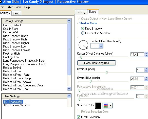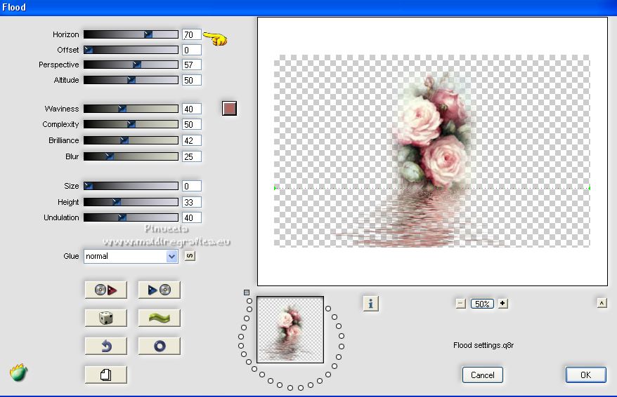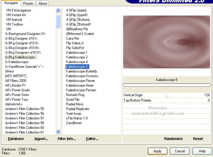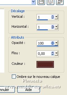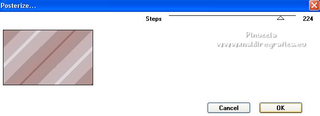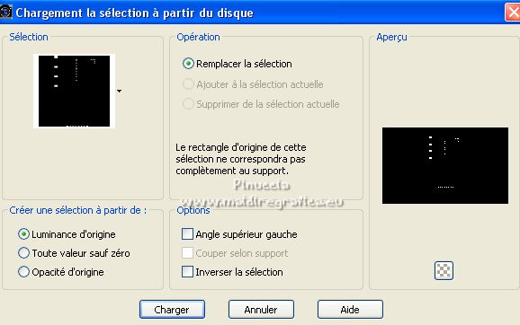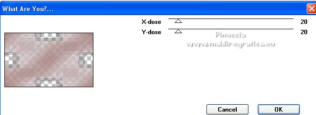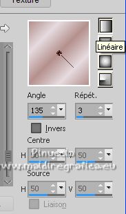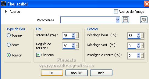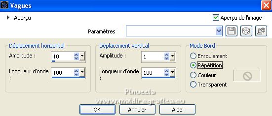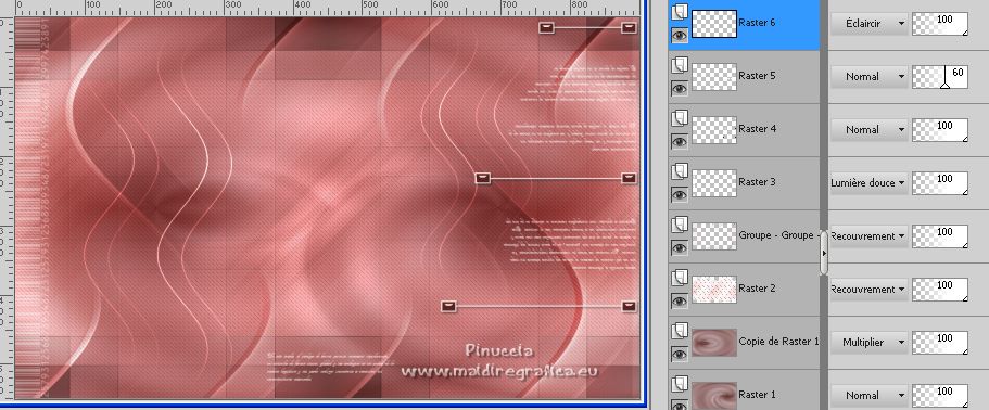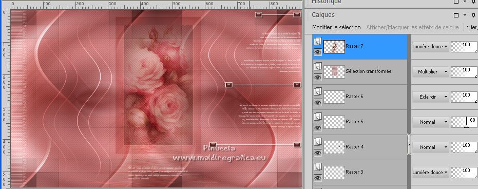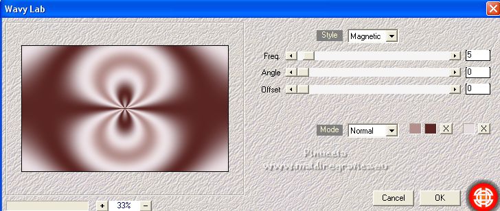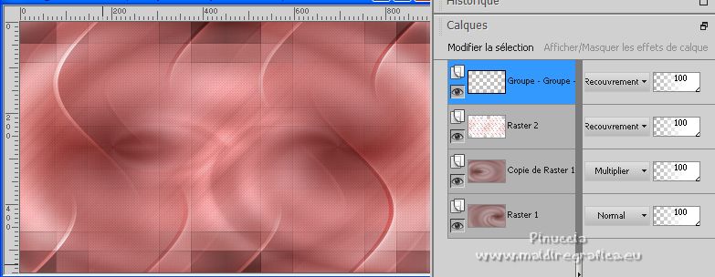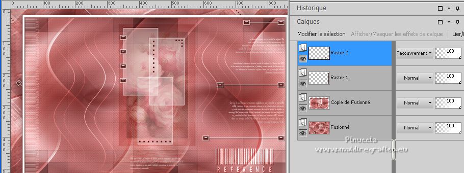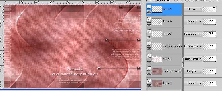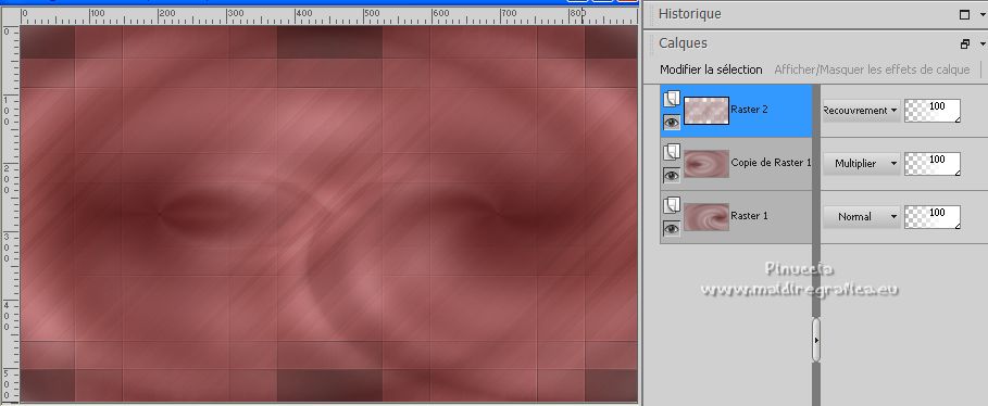 Ce tutoriel a été créé avec PSPX12 et traduit avec PSPX7 mais il peut également être exécuté avec les autres versions. Suivant la version utilisée, vous pouvez obtenir des résultats différents. Depuis la version X4, la fonction Image>Miroir a été remplacée par Image>Renverser horizontalement, et Image>Renverser avec Image>Renverser verticalement . Dans les versions X5 et X6, les fonctions ont été améliorées par la mise à disposition du menu Objets. Avec la nouvelle version X7, nous avons encore Image>Miroir et Image>Renverser/Retourner, mais avec nouvelles différences. Voir les détails à ce sujet ici Certaines dénominations ont changées entre les versions de PSP. Les plus frequentes dénominations utilisées: ![]() Vos versions ici![]() Nécessaire pour réaliser ce tutoriel: Matériel ici Pour le tube merci Luz Cristina. Le reste du matériel est de Tati. (ici les liens vers les sites des créateurs de tubes) ![]() Modules Externes: consulter, si nécessaire, ma section des filtres ici Filters Unlimited 2.0 ici &<Bkg Kaleidoscope> - Kaleidoscope 5 (à importer dans Unlimited) ici Mehdi - Wavy Lab ici Filter Factory Gallery V - Posterize ici Toadies - What are you ici L and K landksiteofwonders - L&K's Frederiek ici Simple - Diamonds ici Carolaine and Sensibility - CS_DLines ici Flaming Pear - Flood ici Alien Skin Eye Candy 5 Impact - ici Filtres Toadies et Simple peuvent être utilisés seuls ou importés dans Filters Unlimited. voir comment le faire ici). Si un filtre est fourni avec cette icône, ![]() en fonction des couleurs utilisées, vous pouvez changer le mode mélange et l'opacité des calques. Dans les plus récentes versions de PSP, vous ne trouvez pas le dégradé d'avant plan/arrière plan ou Corel_06_029. Vous pouvez utiliser le dégradé des versions antérieures. Ici le dossier Dégradés de CorelX. Placer le preset En cliquant sur le preset une ou deux fois (selon vos réglages) automatiquement il se placera directement dans le dossier Settings de Alien Skin Eye Candy. pourquoi un ou deux clic voir ici Placer les sélections dans le dossier Sélections. Ouvrir les masques dans PSP et les minimiser avec le reste du matériel. Couleurs utilisées ![]() 1. Placer en avant plan la couleur 1 #5a2522, et en arrière plan la couleur 2 #b4908d ![]() 2. Ouvrir une nouvelle image transparente 900 x 550 pixels. 3. Effets>Modules Externes>Mehdi - Wavy Lab. Ce filtre crée des dégradés avec les couleurs de votre palette: la première est la couleur d'arrière plan, la deuxième est la couleur d'avant plan. Changer la dernière couleur créée par le filtre avec la couleur 3 #e6dbdf. ![]() 4. Effets>Effets d'image>Mosaïque sans jointures. ![]() 5. Réglage>Flou>Flou radial. ![]() 6. Calques>Dupliquer. Effets>Modules Externes>Filters Unlimited 2.0 - &<Kaleidoscope> - Kaleidoscope 5, par défaut. ![]() 7. Image>Miroir. Placer le calque en mode Multiplier. 8. Placer en avant plan la couleur 2 #b4908d, et en arrière plan la couleur 3 #e6dbdf. ![]() Préparer en avant plan un dégradé de premier plan/arrière plan, style Linéaire. ![]() 9. Calques>Nouveau calque raster. Remplir le calque du dégradé.10. Effets>Modules Externes>Filter Factory Gallery V - Posterize, par défaut. ![]() 11. Image>Redimensionner, à 75%, redimensionner tous les calques décoché. 12. Effets>Effets d'image>Mosaïque sans jointures, comme précédemment. ![]() 13. Effets>Modules Externes>Toadies - What are you, par défaut. ![]() 14. Effets>Effets d'image>Mosaïque sans jointures, comme précédemment, mais Horizontale coché. ![]() 15. Effets>Effets de bords>Accentuer. Placer le calque en mode Recouvrement. ![]() 16. Effets>Modules Externes>L and K landksiteofwonders - L&K's - Frederiek, par défaut. ![]() 17. Placer en avant plan la couleur #ffffff. ![]() Calques>Nouveau calque raster. Remplir le calque avec la couleur #ffffff.18. Calques>Nouveau calque de masque>A partir d'une image. Ouvrir le menu deroulant sous la fenêtre d'origine et vous verrez la liste des images ouvertes. Sélectionner le masque TD_Mask_Reference ![]() Calques>Fusionner>Fusionner le groupe. 19. Effets>Effets de distorsion>Vagues. ![]() 20. Calques>Nouveau calque de masque>A partir d'une image. Ouvrir le menu deroulant sous la fenêtre d'origine et sélectionner le masque 20_20. ![]() Calques>Fusionner>Fusionner le groupe. 21. Effets>Effets 3D>Ombre portée, couleur 1 #5a2522. ![]() 22. Placer le calque en mode Recouvrement. ![]() 23. Ouvrir le tube TD_Deco1_Reference ![]() Édition>Copier. Revenir sur votre travail et Édition>Coller comme nouveau calque. 24. Touche K sur le clavier pour activer l'outil Sélecteur ![]() et placer Position horiz. et Position vert. 0,00. ![]() Placer le calque en mode Lumière douce. 25. Ouvrir le tube TD_Deco2_Reference ![]() Édition>Copier. Revenir sur votre travail et Édition>Coller comme nouveau calque. Placer Position horiz.: 612,00 et Position vert.: 6,00. ![]() 25. Note. Pour coloriser en fonction de vos couleurs, charger la sélection TD_Reference_Sel2 ![]() Sélections>Désélectionner tout. 26. Effets>Effets 3D>Ombre portée, couleur noire. ![]() 27. Ouvrir le tube TD_Texto_Reference ![]() Édition>Copier. Revenir sur votre travail et Édition>Coller comme nouveau calque. Placer Position horiz.: 363,00 et Position vert.: 69,00. ![]() Réduire l'opacité de ce calque à 60%. ![]() 28. Ouvrir le tube TD_Deco3_Reference ![]() Édition>Copier. Revenir sur votre travail et Édition>Coller comme nouveau calque. Placer Position horiz.: 98,00 et Position vert.: -8,00. ![]() Touche M pour désélectionner l'outil. Placer le calque en mode Éclaircir. ![]() 29. Vous positionner sur le calque du bas de la pile, Raster 1. Sélections>Charger/Enregistrer une sélection>Charger à partir du disque. Chercher et charger la sélection TD_Reference_Sel1 ![]() Sélections>Transformer la sélection en calque. Sélections>Désélectionner tout. 30. Calques>Agencer>Placer en haut de 