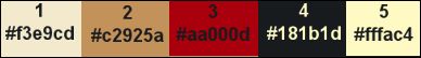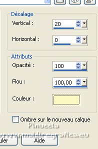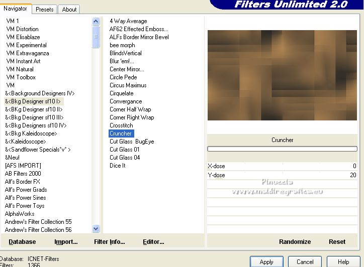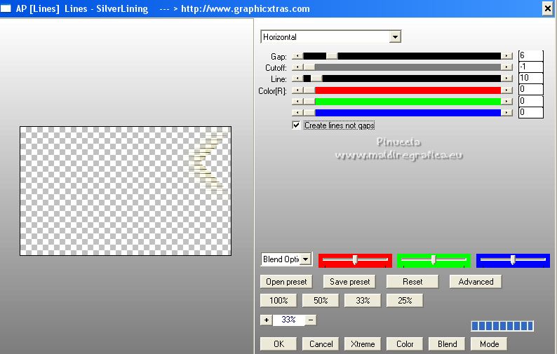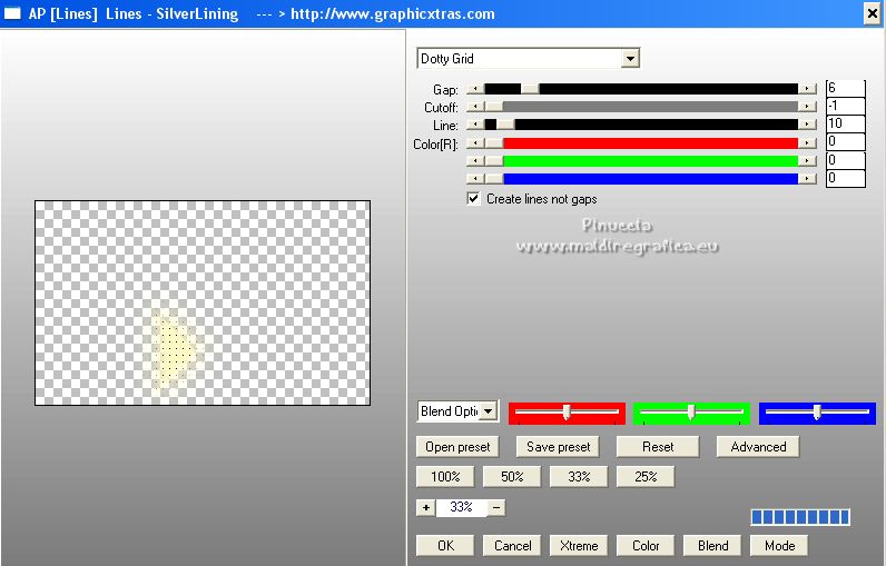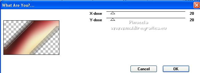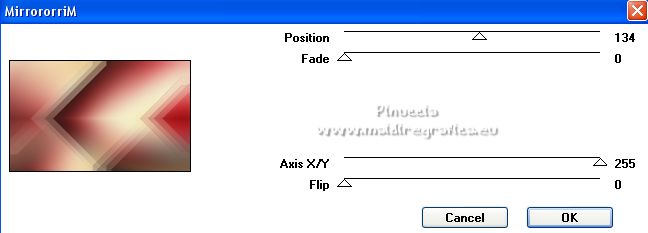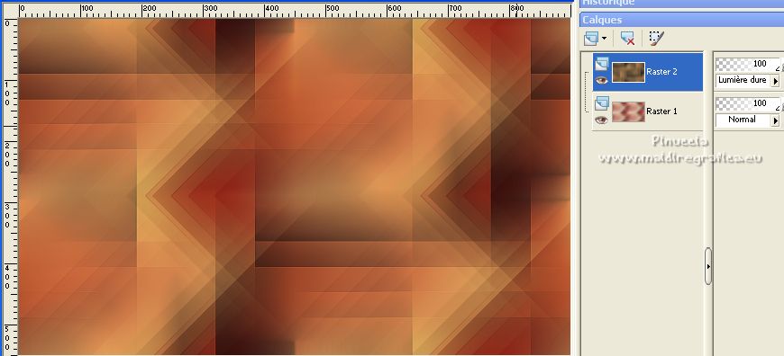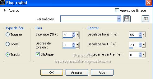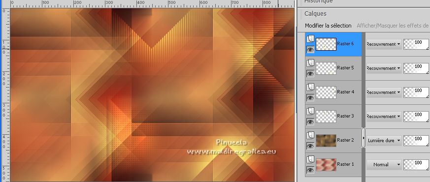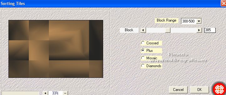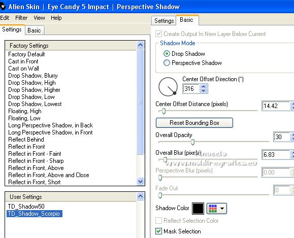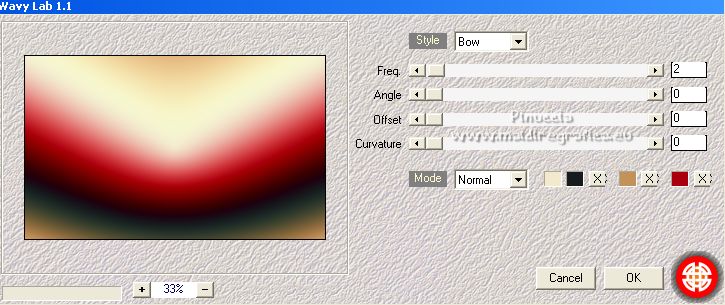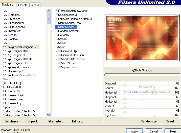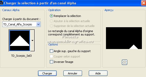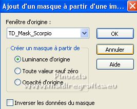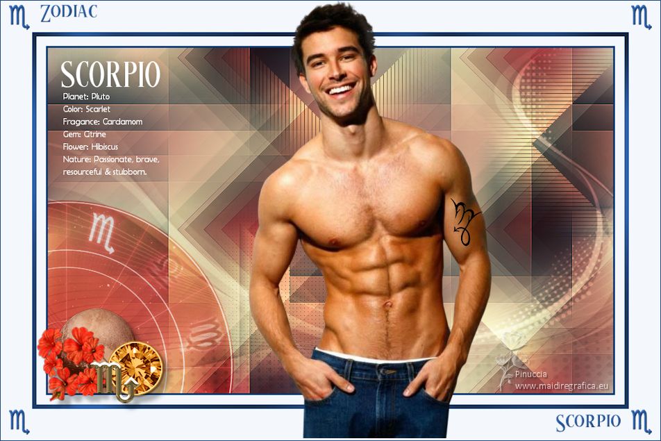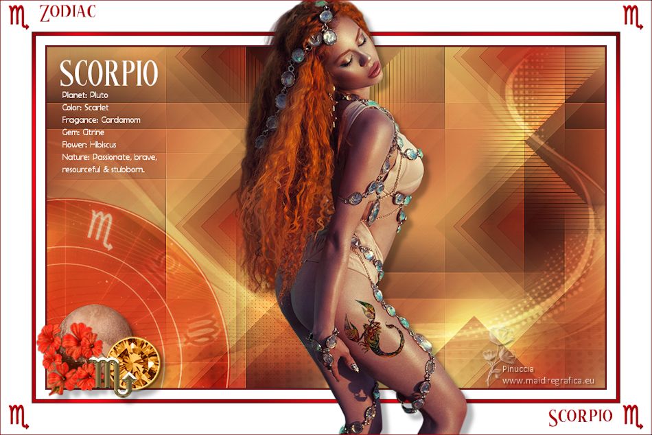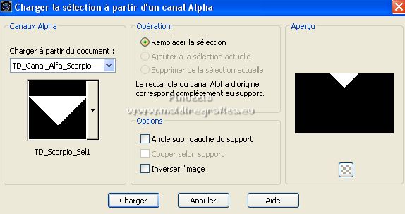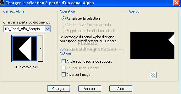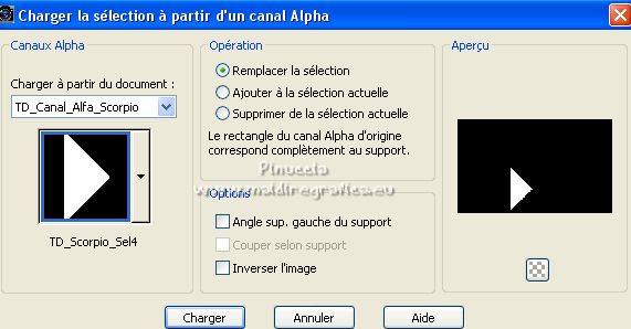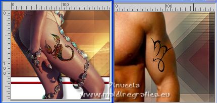 Ce tutoriel a été créé avec PSPX12 et traduit avec PSPX7 mais il peut également être exécuté avec les autres versions. Suivant la version utilisée, vous pouvez obtenir des résultats différents. Depuis la version X4, la fonction Image>Miroir a été remplacée par Image>Renverser horizontalement, et Image>Renverser avec Image>Renverser verticalement . Dans les versions X5 et X6, les fonctions ont été améliorées par la mise à disposition du menu Objets. Avec la nouvelle version X7, nous avons encore Image>Miroir et Image>Renverser/Retourner, mais avec nouvelles différences. Voir les détails à ce sujet ici Certaines dénominations ont changées entre les versions de PSP. Les plus frequentes dénominations utilisées: ![]() Vos versions ici![]() Nécessaire pour réaliser ce tutoriel: Matériel ici Pour le tube merci Beatrice. Le reste du matériel est de Tati. (ici les liens vers les sites des créateurs de tubes) ![]() Modules Externes: consulter, si nécessaire, ma section des filtres ici Filters Unlimited 2.0 ici &<Background Designer sf10I> - Cruncher (à importer dans Unlimited) ici &<Background Designer IV> - @Night Shadow (à importer dans Unlimited) ici Mehdi - Wavy Lab 1.1 ici Mehdi - Sorting Tiles ici VM Toolbox - MirrorM ici Toadies - What are you ici AP [Lines] - Lines SilverLining ici Alien Skin Eye Candy 5 Impact - Perspective Shadow ici Filtres Toadies et VM Toolbox peuvent être utilisés seuls ou importés dans Filters Unlimited. voir comment le faire ici). Si un filtre est fourni avec cette icône, ![]() en fonction des couleurs utilisées, vous pouvez changer le mode mélange et l'opacité des calques. Dans les plus récentes versions de PSP, vous ne trouvez pas le dégradé d'avant plan/arrière plan ou Corel_06_029. Vous pouvez utiliser le dégradé des versions antérieures. Ici le dossier Dégradés de CorelX. Placer le preset En cliquant sur le preset une ou deux fois (selon vos réglages) automatiquement il se placera directement dans le dossier Settings de Alien Skin Eye Candy. pourquoi un ou deux clic voir ici Ouvrir le masque dans PSP et le minimiser avec le reste du matériel. Couleurs utilisées ![]() 1. Placer en avant plan la couleur 4 #181d1d, et en arrière plan la couleur 1 #f3e9cd ![]() 2. Ouvrir TD_Canal_Alfa_Scorpio.pspimage Fenêtre>Dupliquer ou sur le clavier shift+D pour faire une copie. ![]() *** Petite note sur ce gif. Pour créer ce petit gif, comme mes autres gifs, j'ai travaillé. Je me souvien encore le temps perdu pour trouver les deux petits doigts à "poser" sur le clavier. C'est vraiment décourageant d'aller sur un site et de le trouver, très reconnaissable et manipulé avec une autre signature. Si on m'avait demandé l'autorisation de l'utiliser, je ne l'aurais pas refusé. *** Fermer l'original. La copie, qui sera la base de votre travail, n'est pas vide, mais contient les sélections enregistrées sur le canal alpha. 3. Effets>Modules Externes>Mehdi - Wavy Lab 1.1. Ce filtre crée des dégradés avec les couleurs de votre palette: la première est la couleur d'arrière plan, la deuxième est la couleur d'avant plan. Changer les autres deux couleurs créées par le filtre: la troisième avec la couleur #c2925a et la quatrième avec la couleur #aa000d. ![]() 4. Réglage>Flou>Flou radial. ![]() 5. Calques>Dupliquer. Image>Renverser. 6. Effets>Effets géométriques>Inclinaison. ![]() 7. Effets>Modules Externes>Toadies - What are you, par défaut. ![]() 8. Effets>Effets de bords>Accentuer. Calques>Fusionner>Fusionner le calque de dessous. 9. Effets>Modules Externes>VM Toolbox - MirrorM, par défaut. ![]() 10. Effets>Effets d'image>Mosaïque sans jointures. ![]() 11. Effets>Effets d'image>Mosaïque sans jointures, comme précédemment, mais Horizontale coché. ![]() 12. Placer en arrière plan la couleur 2 #c2925a. ![]() Préparer en avant plan un dégradé de premier plan/arrière plan, style Rectangulaire. ![]() 13. Calques>Nouveau calque raster. Remplir le calque du dégradé.14. Réglage>Flou>Flou radial, comme précédemment. ![]() 15. Effets>Modules Externes>Mehdi - Sorting Tiles. ![]() Effets>Effets de bords>Accentuer. 16. Effets>Effets d'image>Mosaïque sans jointures, comme précédemment, mais Bilatérale coché. ![]() 17. Effets>Modules Externes>Filters Unlimited 2.0 - &<Bkg Designer sf10I> - Cruncher. ![]() selon la version d'Unlimited utilisée, vous pouvez obtenir des résultats légèrement différent. Placer le calque en mode Lumière dure. ![]() 18. Calques>Nouveau calque raster. Sélections>Charger/Enregistrer une sélection>Charger à partir d'un canal alpha. La sélection TD_Scorpio_Sel1 est déjà disponible. On doit seulement cliquer sur Charger. ![]() 19. Effets>Effets 3D>Ombre portée, couleur 5 #fffac4. ![]() Sélections>Désélectionner tout. 20. Effets>Modules Externes>AP [Lines] - Lines SilverLining. ![]() 21. Placer le calque en mode Recouvrement. 22. Calques>Nouveau calque raster. Sélections>Charger/Enregistrer une sélection>Charger à partir d'un canal alpha. Ouvrir le menu des sélections et charger la sélection TD_Scorpio_Sel2 ![]() 23. Effets>Effets 3D>Ombre portée, couleur 5 #fffac4. ![]() Sélections>Désélectionner tout. 24. Effets>Modules Externes>AP [Lines] - Lines SilverLining. ![]() 25. Placer le calque en mode Recouvrement. 26. Calques>Nouveau calque raster. Sélections>Charger/Enregistrer une sélection>Charger à partir d'un canal alpha. Ouvrir le menu des sélections et charger la sélection TD_Scorpio_Sel3 ![]() 27. Effets>Effets 3D>Ombre portée, couleur 5 #fffac4. ![]() Sélections>Désélectionner tout. 28. Effets>Modules Externes>AP [Lines] - Lines SilverLining. ![]() Placer le calque en mode Recouvrement. 29. Calques>Nouveau calque raster. Sélections>Charger/Enregistrer une sélection>Charger à partir d'un canal alpha. Ouvrir le menu des sélections et charger la sélection TD_Scorpio_Sel4 ![]() Placer en avant plan la couleur 5 #fffac4, et en arrière plan la coule