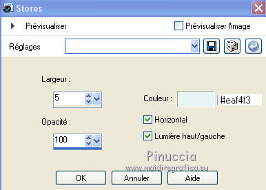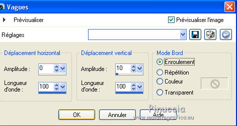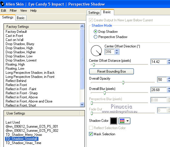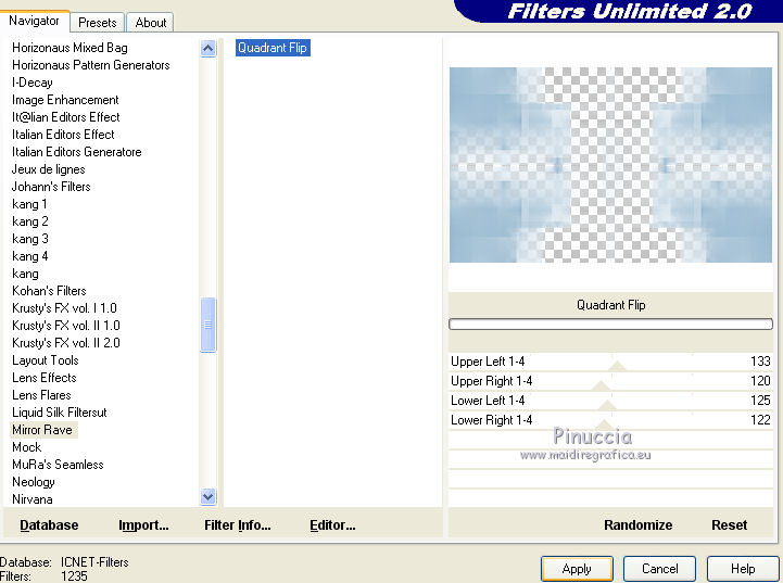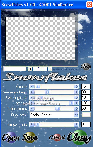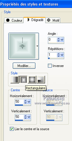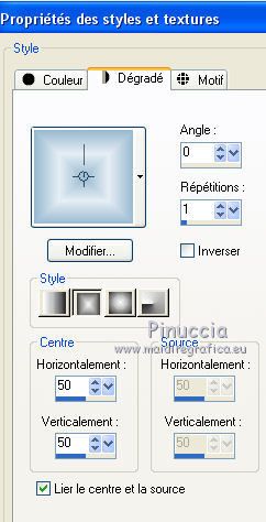 Ce tutoriel a été créé et traduit avec CorelX12, mais il peut également être exécuté avec les autres versions. Suivant la version utilisée, vous pouvez obtenir des résultats différents. Depuis la version X4, la fonction Image>Miroir a été remplacée par Image>Renverser horizontalement, et Image>Renverser avec Image>Renverser verticalement . Dans les versions X5 et X6, les fonctions ont été améliorées par la mise à disposition du menu Objets. Avec la nouvelle version X7, nous avons encore Image>Miroir et Image>Renverser/Retourner, mais avec nouvelles différences. Voir les détails à ce sujet ici Certaines dénominations ont changées entre les versions de PSP. Les plus frequentes dénominations utilisées: ![]() Vos versions iciNécessaire pour réaliser ce tutoriel: Matériel ici Pour un masque merci Narah. Le reste du matériel est de Tati (ici les liens vers les sites des créateurs de tubes) Modules Externes: consulter, si nécessaire, ma section des filtres ici Filters Unlimited 2.0 ici Mehdi - Kaleidoscope 2.1 ici Mehdi - Sorting Tile, Kaleidoscope, Weaver ici &<Bkg Designer sf10I> - Cruncher (à importer dans Unlimited) ici &<Bkg Designer sf10II> - MURUs Wave (à importer dans Unlimited) ici Alf's Power Sines - Absolute 2 Sin Grads ici Neology - Transparent Pizza ici Mirror Rave - Quadrant Flip ici AFS IMPORT - sqborder2 ici Alien Skin Eye Candy 5 Impact - Perspective Shadow ici Eye Candy 4000 - Gradient Glow ici VDL Adrenaline - Snoflakes ici Filtres Alf's Power Sines, Neology, Mirror Rave et AFS IMPORT peuvent être utilisés seuls ou importés dans Filters Unlimited. voir comment le faire ici). Si un filtre est fourni avec cette icône, ![]() en fonction des couleurs utilisées, vous pouvez changer le mode mélange et l'opacité des calques. Dans les plus récentes versions de PSP, vous ne trouvez pas le dégradé d'avant plan/arrière plan ou Corel_06_029. Vous pouvez utiliser le dégradé des versions antérieures. Ici le dossier Dégradés de CorelX. Placer le preset En cliquant sur le preset une ou deux fois (selon vos réglages) automatiquement il se placera directement dans le dossier Settings de Alien Skin Eye Candy. pourquoi un ou deux clic voir ici Placer les sélections dans le dossier Sélections Ouvrir les masques dans PSP et les minimiser avec le reste du matériel. Couleurs utilisées ![]() 1. Placer en avant plan la couleur 1 #abc1bb. et en arrière plan la couleur 1 #eaf4f2. ![]() Préparer en avant plan un dégradé de premier plan/arrière plan (Corel_06_029), style Rectangulaire. ![]() 2. Ouvrir une nouvelle image transparente 900 x 550 pixels. Remplir l'image transparente du dégradé.3. Effets>Modules Externes>Mehdi - Kaleidoscope 2.1. ![]() 4. Effets>Modules Externes>Filters Unlimited 2.0 - &<Bkg Designer sf10II> - MURUs Wave ![]() Réglage>Netteté>Davantage de netteté. 5. Répéter Effets>Modules Externes>Filters Unlimited 2.0 - &<Bkg Designer sf10II> - MURUs Wave ![]() 6. Effets>Effets d'image>Mosaïque sans jointures ![]() Réglage>Netteté>Davantage de netteté. 7. Calques>Dupliquer. Effets>Modules Externes>Filters Unlimited 2.0 - Alf's Power Sines - Absolute 2 Sin Grads, par défaut. ![]() Jouer avec Red, Green et Blue en fonction de vos couleurs, ou coloriser après l'application du filtre. 8. Édition>Copier. Calques>Nouveau calque raster. 9. Sélections>Charger/Enregistrer une sélection>Charger à partir du disque. Chercher et charger la sélection TD_Snowfall_Sel1. ![]() Édition>Coller dans la sélection. Vous positionner sur le calque de dessous Copie de Raster 1. Presser CANC sur le clavier ![]() ![]() Sélections>Désélectionner tout. 10. Effets>Effets de distorsion>Vagues ![]() 11. Image>Miroir. Placer le calque en mode Lumière dure et réduire l'opacité à 60%. ![]() 12 Placer en avant plan la couleur 3 #98b9d0, et en arrière plan la couleur 4 #e5eef4. ![]() Garder le dégradé du début qui changera nuances. ![]() 13. Vous positionner sur le calque du haut de la pile, Raster 2. Calques>Nouveau calque raster. Remplir le calque du dégradé.14. Effets>Modules Externes>Mehdi - Sorting Tiles ![]() 15. Effets>Modules Externes>Mehdi - Kaleidoscope 2.1. ![]() 16. Effets>Modules Externes>Filters Unlimited 2.0 - &<Bkg Designer sf10II> - MURUs Wave, par défaut. ![]() Réglage>Netteté>Davantage de netteté. 17. Effets>Modules Externes>Neology - Transparent Pizza, par défaut. ![]() 18. Effets>Effets de distorsion>Cintrage. ![]() 19. Effets>Modules Externes>Mehdi - Weaver ![]() 20. Effets>Modules Externes>Filters Unlimited 2.0 - Mirror Rave - Quadrant Flip, par défaut. ![]() Placer le calque en mode Multiplier. ![]() 21. Vous positionner sur le calque Copie de Raster 1. Sélections>Charger/Enregistrer une sélection>Charger à partir du disque. Chercher et charger la sélection TD_Snowfall_Sel2. ![]() Sélections>Transformer la sélection en calque. Sélections>Désélectionner tout. Calques>Agencer>Placer en haut de la pile. 22. Effets>Modules Externes>AFS Import - sqborder2 ![]() 23. Effets>Effets géométriques>Inclinaison. ![]() 24. Effets>Effets géométriques>Cylindre horizontal. ![]() Réglage>Netteté>Netteté. Placer le calque en mode Multiplier. ![]() 25. Calques>Nouveau calque raster. Sélections>Charger/Enregistrer une sélection>Charger à partir du disque. Chercher et charger la sélection TD_Snowfall_Sel3. ![]() Placer en avant plan la Couleur. Remplir la sélection avec la couleur d'avant plan #98b9d0.Sélections>Désélectionner tout. 26. Effets>Modules Externes>Filters Unlimited 2.0 - &<Bkg Designer sf10I> - Cruncher, par défaut. ![]() 27. Effets>Effets de textures>Stores - couleur 2 #eaf4f2. ![]() Placer le calque en mode Lumière dure. Calques>Agencer>Déplacer ver le bas. 28. Calques>Dupliquer. Image>Mirror. 29. Effets>Effets de distorsion>Bombage. ![]() 30. Vous positionner sur le calque du haut de la pile (Sélection transformée). ![]() Ouvrir le tube TD_Misted_Snowfall - Édition>Copier. Revenir su