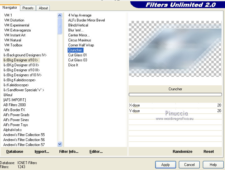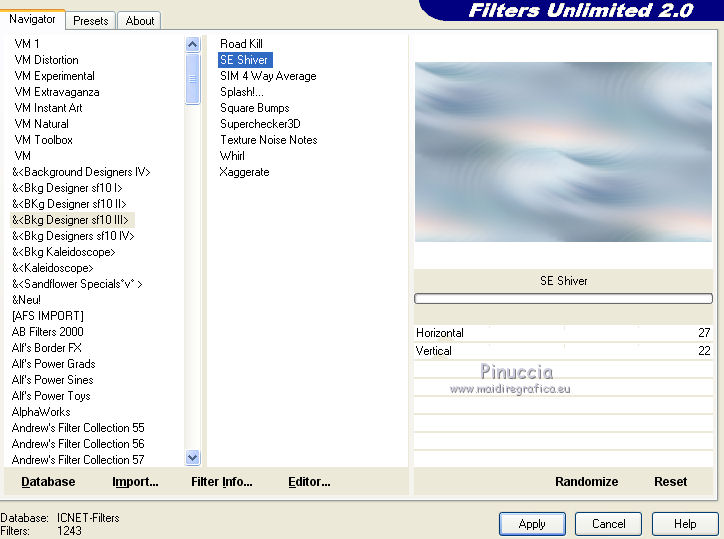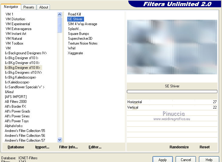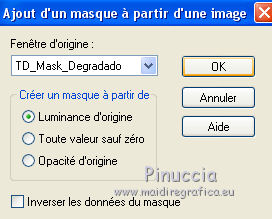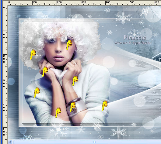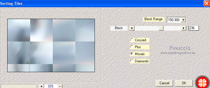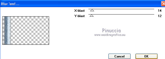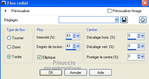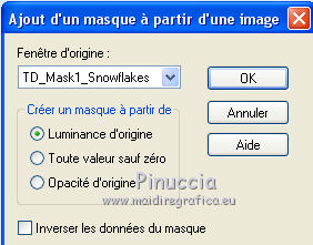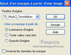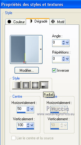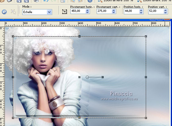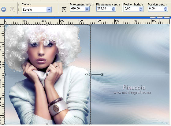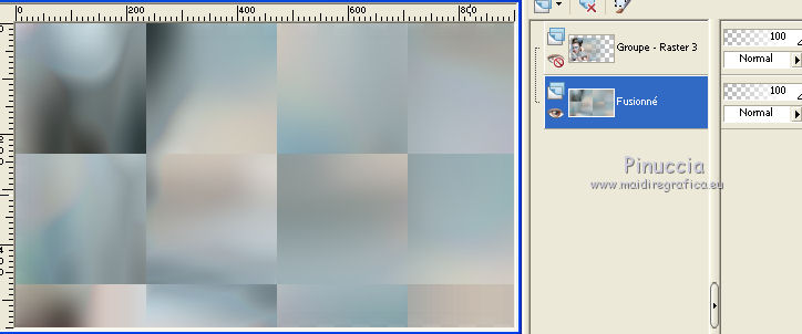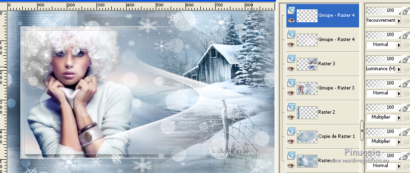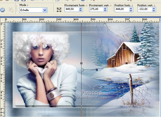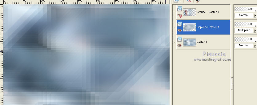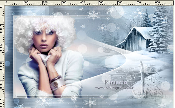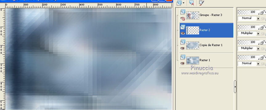 Ce tutoriel a été créé et traduit avec CorelX12, mais il peut également être exécuté avec les autres versions. Suivant la version utilisée, vous pouvez obtenir des résultats différents. Depuis la version X4, la fonction Image>Miroir a été remplacée par Image>Renverser horizontalement, et Image>Renverser avec Image>Renverser verticalement . Dans les versions X5 et X6, les fonctions ont été améliorées par la mise à disposition du menu Objets. Avec la nouvelle version X7, nous avons encore Image>Miroir et Image>Renverser/Retourner, mais avec nouvelles différences. Voir les détails à ce sujet ici Certaines dénominations ont changées entre les versions de PSP. Les plus frequentes dénominations utilisées: ![]() Vos versions iciNécessaire pour réaliser ce tutoriel: Matériel ici Pour le tube utilisé merci Sylvie Erwan. Le reste du matériel est de Tati (ici les liens vers les sites des créateurs de tubes) Modules Externes: consulter, si nécessaire, ma section des filtres ici Filters Unlimited 2.0 ici &<Bkg Designer sf10III> - SE Shiver (à importer dans Unlimited) ici &<Bkg Designer sf10I> - Cruncher (à importer dans Unlimited) ici AAA Frames - Foto Frame ici Mehdi - Sorting Tiles ici Toadies - Blur'em ici Carolaine and Sensibility - CS-HLines ici Filtres Toadies peuvent être utilisés seuls ou importés dans Filters Unlimited. voir comment le faire ici). Si un filtre est fourni avec cette icône, ![]() en fonction des couleurs utilisées, vous pouvez changer le mode mélange et l'opacité des calques. Dans les plus récentes versions de PSP, vous ne trouvez pas le dégradé d'avant plan/arrière plan ou Corel_06_029. Vous pouvez utiliser le dégradé des versions antérieures. Ici le dossier Dégradés de CorelX. Ouvrir les masques dans PSP et le minimiser avec le reste du matériel. Couleurs utilisées ![]() 1. Placer en avant plan la couleur 1 #60768b. et en arrière plan la couleur 2 #dbe9f5. ![]() Préparer en avant plan un dégradé de premier plan/arrière plan (Corel_06_029), style Radial. ![]() 2. Ouvrir une nouvelle image transparente 900 x 550 pixels. Remplir l'image transparente du dégradé.3. Calques>Nouveau calque raster. Sélections>Sélectionner tout. 4. Ouvrir le tube TD_Snowflakes_Misted1 - Édition>Copier. Revenir sur votre travail et Édition>Coller dans la sélection. Sélections>Désélectionner tout. 5. Calques>Fusionner>Fusionner le calque de dessous. 6. Réglage>Flou>Flou radial. ![]() 7. Effets>Effets de bords>Accentuer. 8. Effets>Effets d'image>Mosaïque sans jointures. ![]() 9. Effets>Modules Externes>Filters Unlimited 2.0 - &<Bkg Designer sf10III> - SE Shiver, par défaut. ![]() 10. Effets>Effets de bords>Accentuer davantage. 11. Ouvrir le tube Tube_Woman_Sylvie_Erwan. Vous positionner sur le calque du haut de la pile et Édition>Copier. Revenir sur votre travail et Édition>Coller comme nouveau calque. 11. Touche K sur le clavier pour activer l'outil Sélecteur ![]() et placer Position horiz. à 0,00 (garder Position vert.: 0,00) ![]() Touche M pour désélectionner l'outil. 12. Édition>Copie Spéciale>Copier avec fusion. Édition>Coller comme nouvelle image, et travaillez sur cette image: Image>Ajouter des bordures, 2 pixels, symétrique, couleur blanche #ffffff. 13. Effets>Modules Externes>AAA Frames - Foto Frame. ![]() 14. Image>Ajouter des bordures, 2 pixels, symétrique, couleur blanche #ffffff. 15. Édition>Copier. Revenir sur votre travail et Édition>Coller comme nouveau calque. Image>Redimensionner, à 80%, redimensionner tous les calques décoché. 16. Calques>Nouveau calque de masque>A partir d'une image. Ouvrir le menu deroulant sous la fenêtre d'origine et vous verrez la liste des images ouvertes. Sélectionner le masque TD_Mask_Degradado ![]() Calques>Fusionner>Fusionner le groupe. 17. Calques>Dupliquer. Calques>Fusionner>Fusionner le calque de dessous. 18. Touche K sur le clavier pour activer l'outil Sélecteur ![]() et placer Position horiz. à 44,00 (garder Position vert.: 52,00) ![]() Touche M pour désélectionner l'outil. 19. Fermer ce calque et vous positionner sur le calque de dessous, Raster 2. Placer le calque en mode Luminosité (héritée). ![]() Calques>Fusionner>Fusionner le calque de dessous. 20. Réglage>Flou>Flou gaussien - rayon 25. ![]() attention: à ce stade, en fonction de vos couleurs et des tubes utilisés, votre fond pourrait avoir des partie transparentes; ci-dessous l'esemple de ma deuxième version ![]() Dupliquer le calque 1 ou 2 fois (selon la transparence de votre fond, j'ai fait 2 fois) et fusionner les calques visibles. Le résultat de ma deuxième version ![]() 21. Effets>Modules Externes>Mehdi - Sorting Tiles. ![]() 22. Effets>Modules Externes>Filters Unlimited 2.0 - &<Bkg Designer sf10III> - SE Shiver, par défaut. ![]() 23. Calques>Dupliquer. Image>Redimensionner, à 80%, redimensionner tous les calques décoché. 24. Effets>Effets géométriques>Inclinaison. ![]() 25. Effets>Modules Externes>Filters Unlimited 2.0 - &<Bkg Designer sf10I> - Cruncher, par défaut. ![]() 26. Effets>Effets d'image>Mosaïque sans jointures, Bégaiement diagonale ![]() 27. Placer le calque en mode Multiplier. ![]() 28. Calques>Nouveau calque raster. Activer l'outil Sélection ![]() (peu importe le type de sélection, parce que avec la sélection personnalisée vous obtenez toujours un rectangle), cliquer sur Sélection personnalisée ![]() et setter ces paramètres ![]() 29. Remplir la sélection du dégradé d'avant plan.Sélections>Désélectionner tout. 30. Effets>Modules Externes>Toadies - Blur'em, par défaut. ![]() 31. Effets>Modules Externes>Carolaine and Sensibility - CS-HLines, par défaut. ![]() 32. Réglage>Flou>Flou directionnel ou Flou de mouvement ![]() 33. Placer le calque en mode Multiplier. ![]() 34. Ouvrir et vous positionner sur le calque du haut de la pile, Groupe, Raster 3. 35. Ouvrir le tube TD_Snowflakes_Misted2 - Édition>Copier. Revenir sur votre travail et Édition>Coller comm