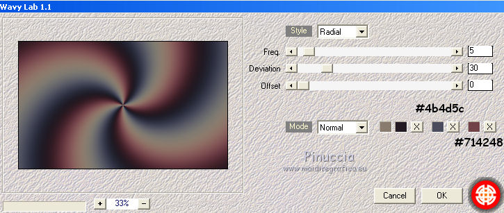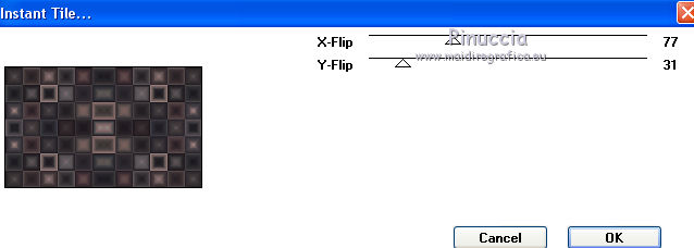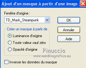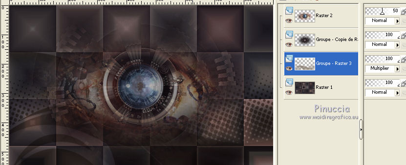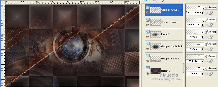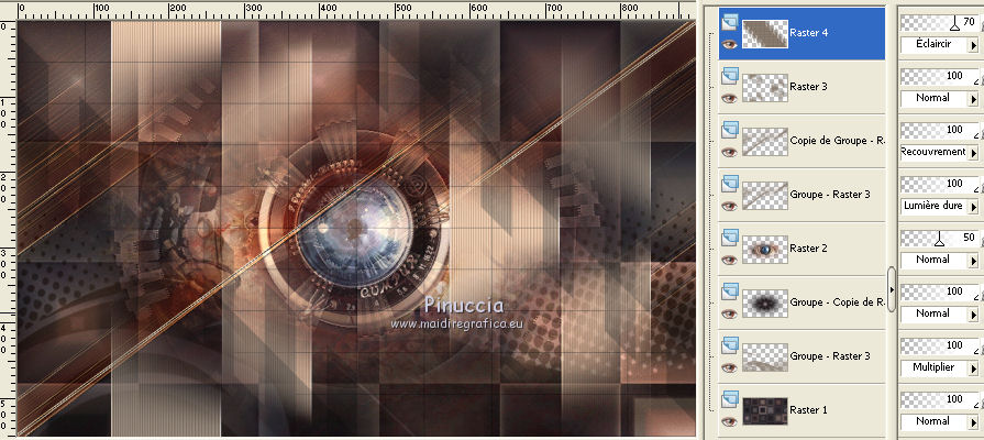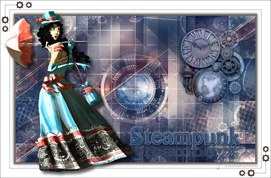 Ce tutoriel a été créé et traduit avec CorelX12, mais il peut également être exécuté avec les autres versions. Suivant la version utilisée, vous pouvez obtenir des résultats différents. Depuis la version X4, la fonction Image>Miroir a été remplacée par Image>Renverser horizontalement, et Image>Renverser avec Image>Renverser verticalement . Dans les versions X5 et X6, les fonctions ont été améliorées par la mise à disposition du menu Objets. Avec la nouvelle version X7, nous avons encore Image>Miroir et Image>Renverser/Retourner, mais avec nouvelles différences. Voir les détails à ce sujet ici Certaines dénominations ont changées entre les versions de PSP. Les plus frequentes dénominations utilisées: ![]() Vos versions ici![]() Nécessaire pour réaliser ce tutoriel: Un tube à choix Matériel ici Pour le tube utilisé merci Franie Margot (vous trouvez le tube ici) Pour deux masques merci Casio. Le reste du matériel est de Tati (ici les liens vers les sites des créateurs de tubes) Modules Externes: consulter, si nécessaire, ma section des filtres ici Filters Unlimited 2.0 ici VM Toolbox - Instant Tile ici Mehdi - Wavy Lab 1.1 ici Funhouse - Chaos Mirror ici Toadies - What are you ici AP [Lines] - Lines SilverLining ici Filtres VM Toolbox, Funhouse et Toadies peuvent être utilisés seuls ou importés dans Filters Unlimited. voir comment le faire ici). Si un filtre est fourni avec cette icône, ![]() en fonction des couleurs utilisées, vous pouvez changer le mode mélange et l'opacité des calques. Placer la sélection dans le dossier Sélections. Placer le masque 2020 dans le dossier Masques. Ouvrir les autres 3 masques dans PSP et les minimiser avec le reste du matériel. Choisir des couleurs en fonction de votre tube. Ci-dessous la palette des couleurs ![]() 1. Placer en avant plan la couleur #231922, et en arrière plan la couleur #897b6e. ![]() 2. Ouvrir une nouvelle image transparente 900 x 550 pixels. 3. Effets>Modules Externes>Mehdi - Wavy Lab 1.1. Ce filtre crée des dégradés avec les couleurs de votre palette: la première est la couleur d'arrière plan, la deuxième est la couleur d'avant plan. Changer les autres deux couleurs créées par le filtre: la trosième avec la couleur #4b4d5c et la quatrième avec la couleur #714248. ![]() 4. Réglage>Flou>Flou gaussien - rayon 50. ![]() 5. Calques>Nouveau calque raster. Sélections>Sélectionner tout. 6. Ouvrir le tube choisi et Édition>Copier. Revenir sur votre travail et Édition>Coller dans la sélection. Sélections>Désélectionner tout. 7. Effets>Effets d'image>Mosaïque sans jointures, par défaut. ![]() 8. Réglage>Flou>Flou radial. ![]() 9. Effets>Effets d'image>Mosaïque sans jointures, comme précédemment. ![]() 10. Calques>Fusionner>Fusionner le calque de dessous. 11. Effets>Modules Externes>Mehdi - Sorting Tiles. ![]() 12. Calques>Dupliquer. Effets>Modules Externes>VM Toolbox - Instant Tile, par défaut. ![]() 13. Effets>Modules Externes>Funhouse - Chaos Mirror, par défaut. ![]() 14. Calques>Charger/Enregistrer un masque>Charger à partir du disque. Chercher et charger le masque 2020. ![]() Calques>Dupliquer. ![]() Calques>Fusionner>Fusionner le groupe. Réglage>Netteté>Davantage de netteté. 15. Ouvrir le tube TD_Misted_Ojo_Steampunk et Édition>Copier. Revenir sur votre travail et Édition>Coller comme nouveau calque. 16. Touche K sur le clavier pour activer l'outil Sélecteur ![]() et placer Position horiz.: -15,00 et Position vert.: 40,00. ![]() Touche M pour désélectionner l'outil. Réduire l'opacité de ce calque à 50%. 17. Vous positionner sur le calque du bas de la pile, Raster 1. Calques>Nouveau calque raster. Remplir le calque avec la couleur d'arrière plan #897b6e.18. Calques>Nouveau calque de masque>A partir d'une image. Ouvrir le menu deroulant sous la fenêtre d'origine et vous verrez la liste des images ouvertes. Sélectionner le masque cas_Mask_0915_03 ![]() Calques>Fusionner>Fusionner le groupe. Placer le calque en mode Multiplier. ![]() 19. Vous positionner sur le calque du haut de la pile, Raster 2. Calques>Nouveau calque raster. Remplir le calque avec la couleur d'arrière plan #897b6e.20. Calques>Nouveau calque de masque>A partir d'une image. Ouvrir le menu deroulant sous la fenêtre d'origine et sélectionner le masque cas_Mask_0115_05 ![]() Calques>Fusionner>Fusionner le groupe. 21. Placer le calque en mode Lumière dure. Effets>Effets de bords>Accentuer. 22. Calques>Dupliquer. Placer le calque en mode Recouvrement. ![]() 23. Sélections>Charger/Enregistrer une sélection>Charger à partir du disque. Chercher et charger la sélection TD_Steampunk_Sel1. ![]() 24. Calques>Nouveau calque raster. Remplir la sélection avec la couleur d'arrière plan #897b6e.Sélections>Désélectionner tout. 25. Effets>Effets de textures>Stores. ![]() 26. Effets>Effets d'image>Mosaïque sans jontures, comme précédemment. ![]() Effets>Effets de bords>Accentuer. 26. Effets>Effets de distorsion>Cintrage. ![]() 27. Effets>Effets d'image>Mosaïque sans jontures, comme précédemment. ![]() 28. Ouvrir le tube TD_Deco1_Steampunk et Édition>Copier. Revenir sur votre travail et Édition>Coller comme nouveau calque. Ne pas déplacer, il est à sa place. 29. Placer le calque en mode Éclaircir et réduire l'opacité à 70. ![]() Effets>Effets de bords>Accentuer. 30. Placer en avant plan la couleur blanche #ffffff. Calques>Nouveau calque raster. Remplir le calque avec la couleur blanche #ffffff.31. Calques>Nouveau calque de masque>A partir d'une image. Ouvrir le menu deroulant sous la fenêtre d'origine et sélectionner le masque TD_Mask_Steampunk ![]() Calques>Fusionner>Fusionner le groupe. 32. Placer le calque en mode Recouvrement. Réglage>Netteté>Davantage de netteté. 33. Vous positionner sur le calque du bas de la pile, Raster 1. Sélections>Charger/Enregistrer une sélection>Charger à partir du disque. Chercher et charger à nouveau la sélection TD_Steampunk_Sel1. ![]() Sélecti