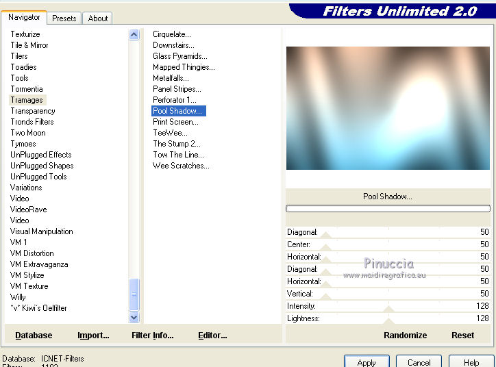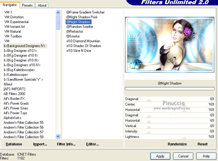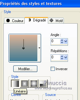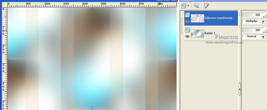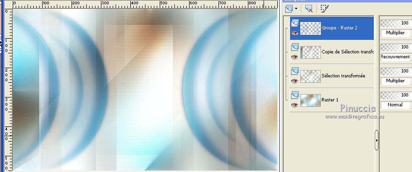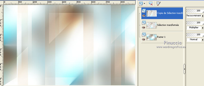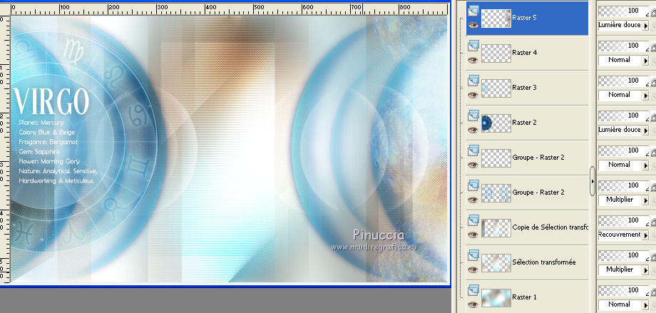 Ce tutoriel a été créé et traduit avec CorelX12, mais il peut également être exécuté avec les autres versions. Suivant la version utilisée, vous pouvez obtenir des résultats différents. Depuis la version X4, la fonction Image>Miroir a été remplacée par Image>Renverser horizontalement, et Image>Renverser avec Image>Renverser verticalement . Dans les versions X5 et X6, les fonctions ont été améliorées par la mise à disposition du menu Objets. Avec la nouvelle version X7, nous avons encore Image>Miroir et Image>Renverser/Retourner, mais avec nouvelles différences. Voir les détails à ce sujet ici Certaines dénominations ont changées entre les versions de PSP. Les plus frequentes dénominations utilisées: ![]() Vos versions ici![]() Nécessaire pour réaliser ce tutoriel: Un tube à choix Le reste du matériel ici S'il n'est pas facile pour vous de trouver des tubes avec ce thématique, dans le matériel vous trouverez un dossier avec des tatouages. À l'étape 44, j'explique comment les utiliser. Pour le tube utilisé et pour le masque merci Nikita et Narah. Le reste du matériel est de Tati. (ici les liens vers les sites des créateurs de tubes) Modules Externes: consulter, si nécessaire, ma section des filtres ici Filters Unlimited 2.0 ici &<Background Designers IV> - @Nigh Shadow (à importer dans Unlimited) ici Tramages - Pool Shadow ici Filter Factory Gallery G - Bevel 1 ici Toadies - What are you ici Carolaine and Sensibility - CS-DLines ici Mura's Meister - Perspective Tiling ici Alien Skin Eye Candy 5 Impact - Perspective Shadow ici Filtres Factory Gallery, Tramages et Toadies peuvent être utilisés seuls ou importés dans Filters Unlimited. voir comment le faire ici). Si un filtre est fourni avec cette icône, ![]() en fonction des couleurs utilisées, vous pouvez changer le mode mélange et l'opacité des calques. Dans les plus récentes versions de PSP, vous ne trouvez pas le dégradé d'avant plan/arrière plan ou Corel_06_029. Vous pouvez utiliser le dégradé des versions antérieures. Ici le dossier Dégradés de CorelX. Placer les sélections dans le dossier Sélections. Ouvrir le masque dans PSP et le minimiser avec le reste du matériel. Choisir des couleurs en fonction de votre tube. Ci-dessous la palette des couleurs ![]() 1. Placer en avant plan la couleur 4 #427c94, et en arrière plan la couleur 1 #ddb397. ![]() 2. Préparer en avant plan un dégradé de premier plan/arrère plan, style Linéaire. ![]() 3. Ouvrir une nouvelle image transparente 900 x 550 pixels. Remplir l'image transparente du dégradé.4. Effets>Modules Externes>Filters Unlimited 2.0 - Tramages - Pool Shadow, par défaut. ![]() 5. Effets>Effets d'image>Mosaïque sans jointures, par défaut. ![]() 6. Réglage>Flou>Flou gaussien - rayon 35. ![]() 7. Sélections>Charger/Enregistrer une sélection>Charger à partir du disque. Chercher et charger la sélection TD_Virgo_Sel1. ![]() Sélections>Transformer la sélection en calque. Sélections>Désélectionner tout. 8. Effets>Modules Externes>Toadies - What are you, par défaut. ![]() 9. Effets>Modules Externes>Carolaine and Sensibility - CS-DLines, par défaut. ![]() 10. Effets>Effets d'image>Mosaïque sans jointures. ![]() 11. Placer le calque en mode Multiplier. ![]() 12. Calques>Dupliquer. Effets>Effets géométriques>Inclinaison. ![]() 13. Effets>Effets d'image>Mosaïque sans jointures, côte à côte. ![]() 14. Effets>Modules Externes>Filter Factory Gallery G - Bevel 1, par défaut ![]() 15. Placer le calque en mode Recouvrement. ![]() 16. Placer en arrière plan la couleur 3 #4d99ba. Calques>Nouveau calque raster. Remplir le calque avec la couleur d'arrière plan #4d99ba.17. Effets>Modules Externes>Filters Unlimited 2.0 - Tramages - Pool Shadow, comme précédemment. ![]() 18. Effets>Effets d'image>Mosaïque sans jointures, par défaut. ![]() 19. Réglage>Flou>Flou gaussien - rayon 35. ![]() 20. Calques>Nouveau calque de masque>A partir d'une image. Ouvrir le menu deroulant sous la fenêtre d'origine et vous verrez la liste des images ouvertes. Sélectionner le masque NarahsMasks_1653. ![]() Calques>Fusionner>Fusionner le groupe. (ne pas fermer le masque; on va s'en servir plus tard). 21. Effets>Effets 3D>Ombre portée, couleur 5 #272b99. ![]() Réglage>Netteté>Netteté. 22. Placer le calque en mode Multiplier. ![]() 23. Placer en arrière plan la couleur #ffffff. Calques>Nouveau calque raster. Remplir le calque avec la couleur #ffffff.24. Calques>Nouveau calque de masque>A partir d'une image. Ouvrir le menu deroulant sous la fenêtre d'origine e sélectionner à nouveau le masque NarahsMasks_1653. ![]() Calques>Fusionner>Fusionner le groupe. 25. Image>Redimensionner, à 50%, redimensionner tous les calques décoché. 26. Effets>Effets d'image>Mosaïque sans jointures, côte à côte. ![]() 27. Ouvrir le tube TD_Deco1_Virgo - Édition>Copier. Revenir sur votre travail et Édition>Coller comme nouveau calque. 28. Touche K sur le clavier pour activer l'outil Sélecteur ![]() et placer Position horiz.: 0,00 et Position vert.: 28,00. ![]() Touche M pour désélectionner l'outil. 29. Placer le calque en mode Lumière douce. 30. Calques>Nouveau calque raster. Sélections>Charger/Enregistrer une sélection>Charger à partir du disque. Chercher et charger la sélection TD_Virgo_Sel2. ![]() 31. Placer en arrière plan la couleur 2 #99cce1. Réduire l'opacité de l'outil Pot de peinture à 50%. ![]() Remplir la sélection avec la couleur 2 #99cce1.Placer à nouveau l'opacité de l'outil Pot de peinture à 100. Sélections>Désélectionner tout. 32. Ouvrir le tube TD_Texto_Virgo - Édition>Copier. Revenir sur votre travail et Édition>Coller comme nouveau calque. 33. Touche K sur le clavier pour activer l'outil Sélecteur ![]() et placer Position horiz.: 4,00 et Position vert.: 149,00. ![]() 34. Effets>Effets 3D>Ombre portée, couleur noire. ![]() 35. Ouvrir le tube TD_Mercury_Virgo - Édition>Copier. Revenir sur votre travail et Édit