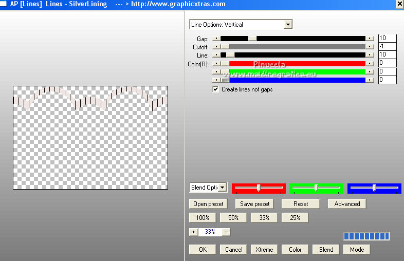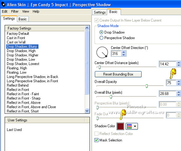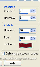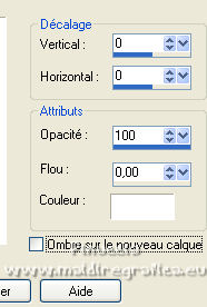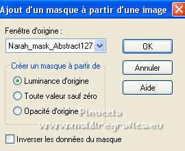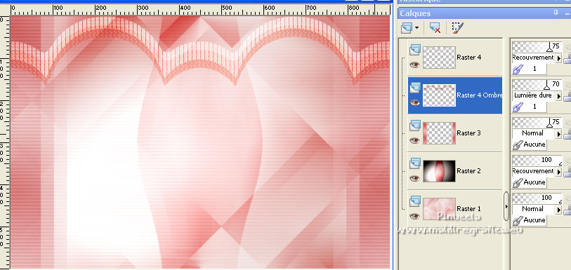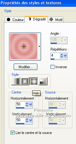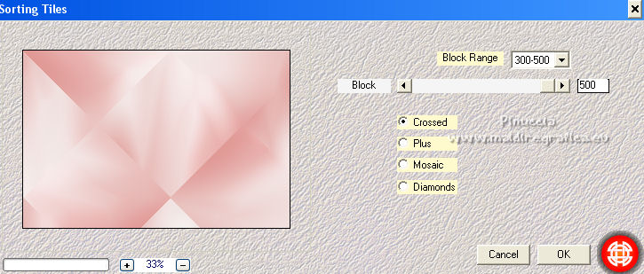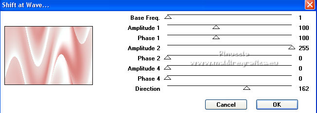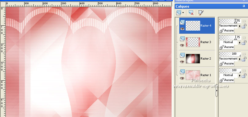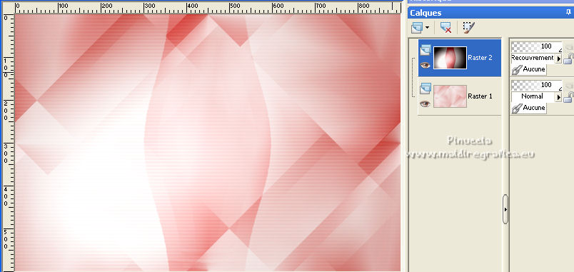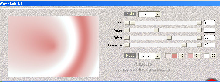Ce tutoriel a été créé et traduit avec CorelX12, mais il peut également être exécuté avec les autres versions. Suivant la version utilisée, vous pouvez obtenir des résultats différents. Depuis la version X4, la fonction Image>Miroir a été remplacée par Image>Renverser horizontalement, et Image>Renverser avec Image>Renverser verticalement . Dans les versions X5 et X6, les fonctions ont été améliorées par la mise à disposition du menu Objets. Avec la nouvelle version X7, nous avons encore Image>Miroir et Image>Renverser/Retourner, mais avec nouvelles différences. Voir les détails à ce sujet ici Certaines dénominations ont changées entre les versions de PSP. Les plus frequentes dénominations utilisées: ![]() Vos versions ici![]() Nécessaire pour réaliser ce tutoriel: Un tube à choix (pour le tuto original, Tati a utilisé un tube sous licence) Le reste du matériel ici Pour mon tube merci Jet Pour le masque merci Narah. Le reste du matériel est de Tati. (ici les liens vers les sites des créateurs de tubes) ![]() Modules Externes: consulter, si nécessaire, ma section des filtres ici Filters Unlimited 2.0 ici Mehdi - Sorting Tiles ici Mehdi - Wavy Lab 1.1. ici Mura's Seamless - Shift at Wave ici Simple - Blintz ici Carolaine and Sensibility - CS_Halloween1, CS_HLines, CS_LDots ici AP [Lines] - Lines SilverLining ici Alien Skin Eye Candy 5 Impact - Perspective Shadow, Glass ici Filtres Mura's Seamless et Simple peuvent être utilisés seuls ou importés dans Filters Unlimited. voir comment le faire ici). Si un filtre est fourni avec cette icône, ![]() en fonction des couleurs utilisées, vous pouvez changer le mode mélange et l'opacité des calques. Placer les presets En cliquant sur le preset une ou deux fois (selon vos réglages) automatiquement il se placera directement dans le dossier Settings de Alien Skin Eye Candy. pourquoi un ou deux clic voir ici Placer le preset Emboss 3 dans le dossier Paramètres par défaut. Placer les sélections dans le dossier Sélections. Ouvrir les masques dans PSP et les minimiser avec le reste du matériel. Choisir des couleurs en fonction de votre tube. Couleurs utilisées ![]() 1. Placer en avant plan la couleur 3 #dd8a87, et en arrière plan la couleur 1 #efe6e3 ![]() 2. Ouvrir une nouvelle image transparente 900 x 600 pixels. 3. Effets>Modules Externes>Mehdi - Wavy Lab 1.1. Ce filtre crée des dégradés avec les couleurs de votre palette: la première est la couleur d'arrière plan, la deuxième est la couleur d'avant plan. Changer les autres deux couleurs créées par le filtre: la troisième avec la couleur 2 #e6b8b5 et la quatrième avec la couleur#ffffff ![]() 4. Effets>Modules Externes>Mura's Seamless - Shift at wave. ![]() 5. Effets>Effets d'image>Mosaïque sans jointures. ![]() 6. Réglage>Flou>Flou gaussien - rayon 35. ![]() 7. Effets>Modules Externes>Mehdi - Sorting Tiles. ![]() 8. Effets>Modules Externes>Simple - Blintz. Édition>Répéter Blintz. 9. Effets>Effets d'image>Mosaïque sans jointures, comme précédemment. ![]() 10. Ouvrir le tube TD_Deco1_Wedding_Day - Édition>Copier. Revenir sur votre travail et Édition>Coller comme nouveau calque. Ne pas déplacer, il est à sa place. Note: Si vous utilisez des autres couleurs, colorisez avec les valeurs de votre couleur 3. 11. Effets>Modules Externes>Carolaine and Sensibility - CS_Halloween1. ![]() 12. Effets>Modules Externes>Carolaine and Sensibility - CS_HLines, par défaut. ![]() 13. Placer le calque en mode Recouvrement. ![]() 14. Ouvrir le tube TD_Deco2_Wedding_Day - Édition>Copier. Revenir sur votre travail et Édition>Coller comme nouveau calque. Ne pas déplacer, il est à sa place. Note: Si vous utilisez des autres couleurs, colorisez avec les valeurs de votre couleur 3. Garder l'opacité de ce calque à 75%. 15. Effets>Modules Externes>Carolaine and Sensibility - CS_HLines, par défaut. ![]() 16. Effets>Effets 3D>Ombre portée, couleur #ffffff. ![]() 17. Calques>Nouveau calque raster. Sélections>Charger/Enregistrer une sélection>Charger à partir du disque. Chercher et charger la sélection TD_WeddingDay_Sel1. ![]() Remplir la sélection avec la couleur d'arrière plan (1) #efe6e3.Sélections>Désélectionner tout. 18. Effets>Effets de distorsion>Coordonées polaires. ![]() 19. Touche K pour activer l'outil Sélecteur ![]() et placer Position horiz et Position vert à 0,00 ![]() Touche M pour désélectionner l'outil. 20. Effets>Modules Externes>AP [Lines] - Lines SilverLining, Lines Options: Vertical. ![]() 21. Placer le calque en mode Recouvrement et réduire l'opacité à 75%. ![]() 22. Effets>Effets 3D>Ombre portée, couleur 4 #a5493b, ombre sur le nouveau calque coché. ![]() Rester positionné sur le calque de l'ombre. 23. Effets>Modules Externes>AP [Lines] - Lines SilverLining - Zag Across. ![]() 24. Placer le calque en mode Lumière dure et réduire l'opacité à 75%. ![]() 25. Garder en avant plan la couleur 3 #dd8a87, et changer la couleur d'arrière plan avec la couleur 2 #e6b8b5. ![]() Préparer en avant plan un dégradé de premier plan/arrière plan, style Halo. ![]() 26. Vous positionner sur le calque du haut de la pile, Raster 4. Calques>Nouveau calque raster. 27. Sélections>Charger/Enregistrer une sélection>Charger à partir du disque. Chercher et charger la sélection TD_WeddingDay_Sel2. ![]() Remplir la sélection du dégradé.Sélections>Désélectionner tout. 28. Réglage>Flou>Flou gaussien - rayon 35. ![]() 29. Effets>Effets 3D>Ombre portée, couleur #ffffff, ombre sur le nouveau calque décoché. ![]() 30. Effets>Effets d'image>Mosaïque sans jointures, côte à côte. ![]() 31. Effets>Modules Externes>Carolaine and Sensibility - CS_LDots. ![]() 32. Ouvrir le tube TD_Deco3_Wedding_Day - Édition>Copier. Revenir sur votre travail et Édition>Coller comme nouveau calque. Ne pas déplacer, il est à sa place. Note: Si vous utilisez des autres couleurs, colorisez avec les valeurs de votre couleur 3. 33. Effets>Effets d'imag
