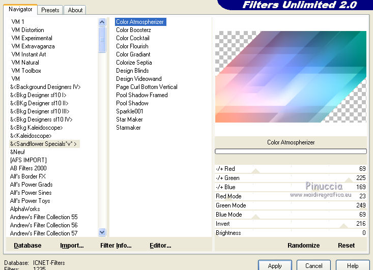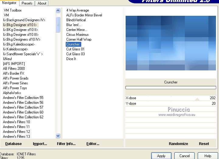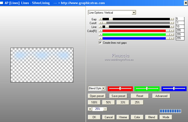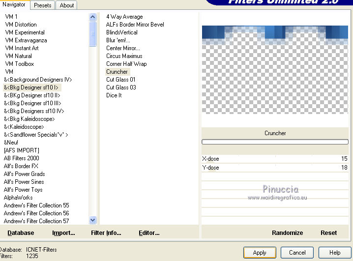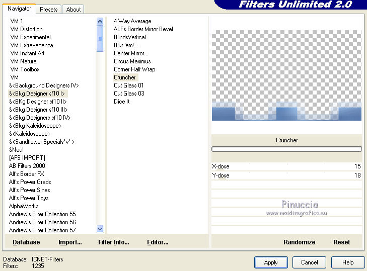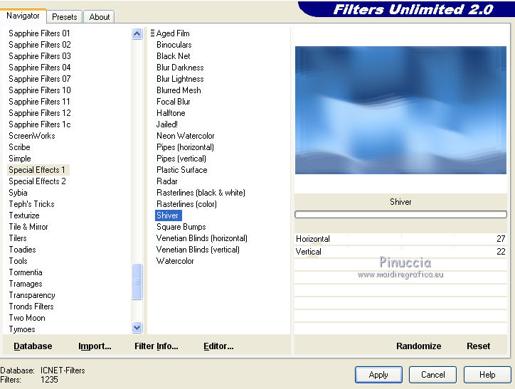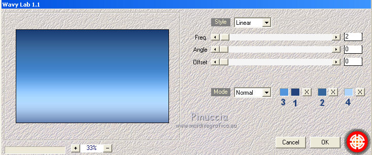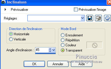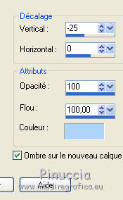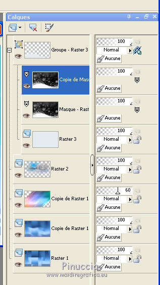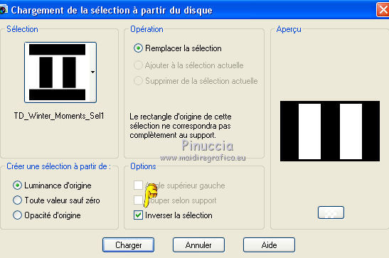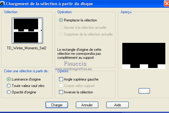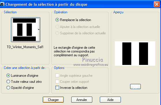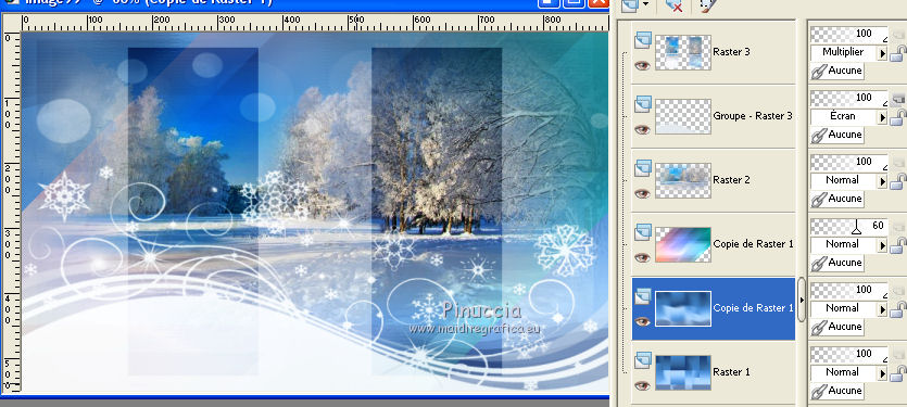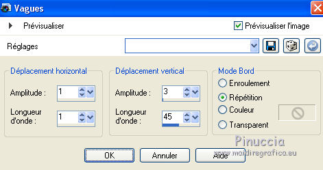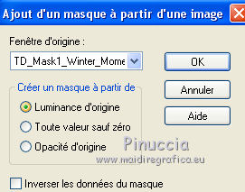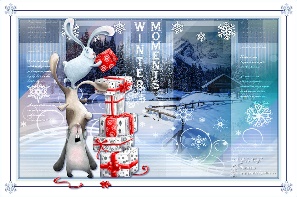 Ce tutoriel a été créé et traduit avec CorelX12, mais il peut également être exécuté avec les autres versions. Suivant la version utilisée, vous pouvez obtenir des résultats différents. Depuis la version X4, la fonction Image>Miroir a été remplacée par Image>Renverser horizontalement, et Image>Renverser avec Image>Renverser verticalement . Dans les versions X5 et X6, les fonctions ont été améliorées par la mise à disposition du menu Objets. Avec la nouvelle version X7, nous avons encore Image>Miroir et Image>Renverser/Retourner, mais avec nouvelles différences. Voir les détails à ce sujet ici Certaines dénominations ont changées entre les versions de PSP. Les plus frequentes dénominations utilisées: ![]() Vos versions iciNécessaire pour réaliser ce tutoriel: Un tube à choix Le reste du matériel ici Pour le tube utilisé merci Kad (vous le trouvez ici http://kadstubes.blogspot.com/2018/11/kadwoman186.html) Le reste du matériel est de Tati (ici les liens vers les sites des créateurs de tubes) Modules Externes: consulter, si nécessaire, ma section des filtres ici Filters Unlimited 2.0 ici &<Sandflower Specials °v°> - Color Atmospherizer ici &<Bkg Designer sf10I> - Cruncher (à importer dans Unlimited) ici Mehdi - Wavy Lab 1.1. ici Mehdi - Sorting Tiles ici AP [Lines] - Lines - SilverLining ici ![]() en fonction des couleurs utilisées, vous pouvez changer le mode mélange et l'opacité des calques. Placer les sélections dans le dossier Sélections Couleurs utilisées ![]() 1. Placer en avant plan la couleur 1 #24447d. et en arrière plan la couleur 3 #5295dc. ![]() 2. Ouvrir une nouvelle image transparente 900 x 550 pixels. 3. Effets>Modules Externes>Mehdi - Wavy lab 1.1 Ce filtre crée des dégradés avec les couleurs de votre palette: la première est la couleur d'arrière plan, la deuxième est la couleur d'avant plan. Changer les autres deux couleurs créées par le filtre: la trosième avec la couleur 2 #36669c, et la quatrième avec la couleur 4 #afd4fb. ![]() 4. Effets>Modules Externes>Mehdi - Sorting Tiles ![]() 5. Calques>Dupliquer. Effets>Effets de distorsion>Vagues ![]() 6. Effets>Modules Externes>Filters Unlimited 2.0 - Special Effects 1 - Shiver, par défaut. ![]() 7. Vous positionner sur le calque du bas de la pile, Raster 1. Calques>Dupliquer. Calques>Agencer>Placer en haut de la pile. 8. Effets>Modules Externes>Filters Unlimited 2.0 - &<Bkg Designer sf10I> - Cruncher. ![]() 9. Effets>Effets géométriques>Inclinaison. ![]() 10. Effets>Modules Externes>Filters Unlimited 2.0 - &<Sandflower Specials °v°> - Color Atmospherizer, par défaut. ![]() adapter les réglages, si vous utilisez un autre paysage Réduire l'opacité de ce calque à 60%. 11. Ouvrir le tube TD_Misted_Winter_Moments - Édition>Copier. Revenir sur votre travail et Édition>Coller comme nouveau calque. 12. Touche K sur le clavier pour activer l'outil Sélecteur ![]() garder Position horiz.: -50,00 et placer Position vert.: -35,00. ![]() Touche M pour désélectionner l'outil. 13. Placer en avant plan la couleur 5 #e4ecef. Calques>Nouveau calque raster. Remplir le calque avec la couleur d'avant plan #e4ecef.14. Calques>Nouveau calque de masque>A partir d'une image. Ouvrir le menu deroulant sous la fenêtre d'origine et vous verrez la liste des images ouvertes. Sélectionner le masque TD_Mask1_Winter_Moments. ![]() Calques>Dupliquer. ![]() Calques>Fusionner>Fusionner le groupe. Placer le calque en mode Écran. 15. Édition>Copie Spéciale>Copier avec fusion. Édition>Coller comme nouveau calque. 16. Sélections>Charger/Enregistrer une sélection>Charger à partir du disque. Chercher et charger la sélection TD_Winter_Moments_Sel1. ![]() Presser CANC sur le clavier ![]() Sélections>Désélectionner tout. Placer le calque en mode Multiplier. Vous positionner sur le calque Copie de Raster 1. ![]() 17. Sélections>Charger/Enregistrer une sélection>Charger à partir du disque. Chercher et charger la sélection TD_Winter_Moments_Sel2. ![]() Sélections>Transformer la sélection en calque. Sélections>Désélectionner tout. Calques>Agencer>Placer en haut de la pile. 18. Avant d'appliquer le prochain filtre, placer en arrière plan la couleur 3 5295dc. Effets>Modules Externes>Filters Unlimited 2.0 - &<Bkg Designer sf10I> - Cruncher. ![]() 19. Effets>Modules Externes>AP [Lines] - Lines SilverLining. ![]() Réduire l'opacité de ce calque à 60%. 20. Effets>Effets 3D>Ombre portée, couleur 4 #afd4fb, ombre sur le nouveau calque coché ![]() 21. Sur le calque de l'ombre: Effets>Modules Externes>AP [Lines] - Lines SilverLining. ![]() 22. Vous positionner sur le calque du bas de la pile, Raster 1. Sélections>Charger/Enregistrer une sélection>Charger à partir du disque. Chercher et charger la sélection TD_Winter_Moments_Sel3. ![]() Sélections>Transformer la sélection en calque. Sélections>Désélectionner tout. Calques>Agencer>Placer en haut de la pile. 23. Rappelez-vous que, avant d'appliquer le filtre, il faut avoir en arrière plan la couleur 3 #5295dc. Effets>Modules Externes>Filters Unlimited 2.0 - &<Bkg Designer sf10I> - Cruncher. ![]() 24. Effets>Modules Externes>AP [Lines] - Lines SilverLining. ![]() Réduire l'opacité de ce calque à 65%. 25. Effets>Effets 3D>Ombre portée, couleur 4 #afd4fb ombre sur le nouveau calque coché ![]() 26. Sur le calque de l'ombre: Effets>Modules Externes>AP [Lines] - Lines SilverLining. ![]() 27. Sélections>Charger/Enregistrer une sélection>Charger à partir du disque. Chercher et charger à nouveau la sélection TD_Winter_Moments_Sel1 Inverser la sélection coché. ![]() Presser CANC sur le clavier ![]() Sélections>Désélectionner tout. Vous positionner sur le calque du haut de la pile. 28. Ouvrir le tube TD_Texto_Winter_Moments - Édition>Copier. Revenir sur votre travail et Édition>Coller comme nouveau calque. Note: le texte vient du poème Jardin de invierno de Pablo Neruda 29. Touche K pour activer l'outil Sélecteur ![]() garder 