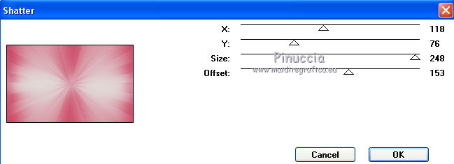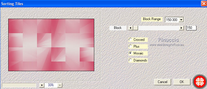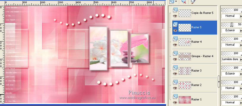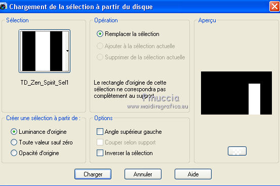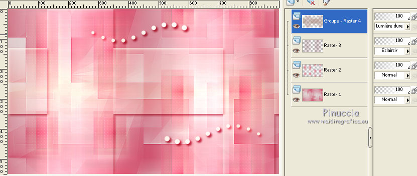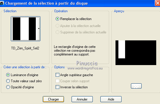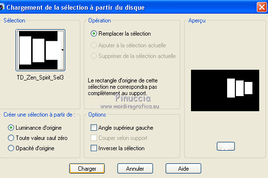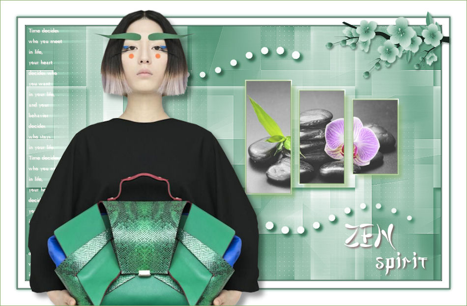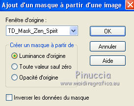 Ce tutoriel a été créé et traduit avec CorelX12, mais il peut également être exécuté avec les autres versions. Suivant la version utilisée, vous pouvez obtenir des résultats différents. Depuis la version X4, la fonction Image>Miroir a été remplacée par Image>Renverser horizontalement, et Image>Renverser avec Image>Renverser verticalement . Dans les versions X5 et X6, les fonctions ont été améliorées par la mise à disposition du menu Objets. Avec la nouvelle version X7, nous avons encore Image>Miroir et Image>Renverser/Retourner, mais avec nouvelles différences. Voir les détails à ce sujet ici Certaines dénominations ont changées entre les versions de PSP. Les plus frequentes dénominations utilisées: ![]() Vos versions ici![]() Nécessaire pour réaliser ce tutoriel: Un tube à choix Matériel ici Pour le tube utilisé merci RoseArt (vous trouvez le tube ici Image Zen du net. Le reste du matériel est de Tati (ici les liens vers les sites des créateurs de tubes) Modules Externes: consulter, si nécessaire, ma section des filtres ici Filters Unlimited 2.0 ici Greg's Factory Output vol.II - Shatter, Sierpinski Stitch ici Mehdi - Sorting Tiles ici Toadies - What are you, Weaver ici Simple - Zoom out and flip ici AP [Lines] - Lines SilverLining ici Filtres Greg's Factory Output, Toadies et Simple peuvent être utilisés seuls ou importés dans Filters Unlimited. voir comment le faire ici). Si un filtre est fourni avec cette icône, ![]() en fonction des couleurs utilisées, vous pouvez changer le mode mélange et l'opacité des calques. Dans les plus récentes versions de PSP, vous ne trouvez pas le dégradé d'avant plan/arrière plan ou Corel_06_029. Vous pouvez utiliser le dégradé des versions antérieures. Ici le dossier Dégradés de CorelX. Placer les sélections dans le dossier Sélections. Ouvrir le masque dans PSP et le minimiser avec le reste du matériel. Choisir des couleurs en fonction de votre tube. Ci-dessous la palette des couleurs ![]() 1. Placer en avant plan la couleur #e1e0dc, et en arrière plan la couleur #ca3959. ![]() 2. Préparer en avant plan un dégradé de premier plan/arrière plan (Corel_06_029), style Radial ![]() 3. Ouvrir une nouvelle image transparente 900 x 550 pixels. Remplir l'image transparente du dégradé.4. Effets>Effets d'image>Mosaïque sans jointures. ![]() 5. Réglage>Flou>Flou gaussien - rayon 40. ![]() 6. Effets>Modules Externes>Greg's Factory Output Vol. II - Shatter, par défaut. ![]() Réglage>Netteté>Davantage de netteté. 7. Effets>Modules Externes>Mehdi - Sorting Tiles ![]() Effets>Effets de bords>Accentuer. 8. Effets>Effets d'image>Mosaïque sans jointures, Bégaiement diagonale. ![]() 9. Placer en avant plan la couleur #fb96ae, et en arrière plan la couleur #ca3959. ![]() 10. Préparer en avant plan un dégradé de premier plan/arrière plan (Corel_06_029), style Linéaire ![]() 11. Sélections>Charger/Enregistrer une sélection>Charger à partir du disque. Chercher et charger la sélection TD_Zen_Spirit_Sel1. ![]() 12. Calques>Nouveau calque raster. Remplir la sélection du dégradé.Sélections>Désélectionner tout. 13. Effets>Modules Externes>Toadies - What are you, par défaut. ![]() Effets>Effets de bords>Accentuer. 14. Effets>Effets d'image>Mosaïque sans jointures. ![]() 15. Effets>Modules Externes>Simple - Zoom Out and Flip. 16. Effets>Modules Externes>AP [Lines] - Lines SilverLining. ![]() 17. Effets>Effets 3D>Ombre portée, couleur #ddd9b4 ![]() 18. Sélections>Charger/Enregistrer une sélection>Charger à partir du disque. Chercher et charger la sélection TD_Zen_Spirit_Sel2. ![]() 19. Calques>Nouveau calque raster. Placer en avant plan la couleur #888d87. ![]() Remplir la sélection avec la couleur #888d87.Sélections>Désélectionner tout. 20. Effets>Modules Externes>Toadies - Weaver, par défaut. ![]() 21. Placer en arrière plan la couleur #fb96ae. Note: Ceci est important pour le filtre que nous allons utiliser à l'étape suivante. ![]() 22. Effets>Modules Externes>Greg's Factory Output Vol. II - Sierpinski Stitch, par défaut. ![]() 22. Effets>Modules Externes>Toadies - What are you ![]() 23. Effets>Effets d'image>Mosaïque sans jointures. ![]() 24. Effets>Effets d'image>Mosaïque sans jointures. ![]() 25. Placer le calque en mode Éclaircir. 26. Effets>Effets de textures>Stores, couleur #44413a ![]() 26. Effets>Effets 3D>Ombre portée, comme précédemment, mais couleur #fb96ae. ![]() 27. Placer en avant plan la couleur #ffffff, et en arrière plan la couleur #ddd9b4. ![]() 28. Préparer en avant plan un dégraDé de premier plan/arrière plan (Corel_06_029), style Linéaire. ![]() 29. Calques>Nouveau calque raster. Remplir le calque du dégradé.30. Calques>Nouveau calque de masque>A partir d'une image. Ouvrir le menu deroulant sous la fenêtre d'origine et vous verrez la liste des images ouvertes. Sélectionner le masque TD_Mask_Zen_Spirit ![]() Calques>Fusionner>Fusionner le groupe. 31. Effets>Effets 3D>Ombre portée, couleur #631928. ![]() Placer le calque en mode Lumière dure. ![]() 32. Sélections>Charger/Enregistrer une sélection>Charger à partir du disque. Chercher et charger la sélection TD_Zen_Spirit_Sel3. ![]() 33. Placer en avant plan la Couleur et changer la couleur d'arrière plan avec #631928. ![]() Calques>Nouveau calque raster. Remplir la sélection avec la couleur d'avant plan #ffffff.34. Sélections>Modifier>Contracter - 2 pixels. Placer en arrière plan Remplir la sélection avec la couleur d'arrière plan #631928.35. Sélections>Modifier>Contracter - 1 pixel. Remplir la sélection avec la couleur d'avant plan #ffffff.Garder sélectionné. 36. Calques>Nouveau calque raster. Ouvrir l'image "Imagen_Zen" et Édition>Copier. Revenir sur votre travail et Édition>Coller dans la sélection. Sélections>Désélectionner tout. Réduire l'opacité de ce calque à 80%. 37. Calques>Fusionner>Fusionner le calque de dessous. 38. Effets>Effets 3D>Ombre portée, couleur #631928. 