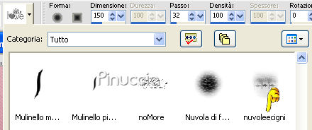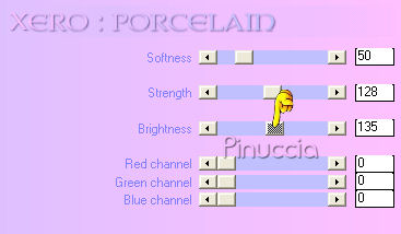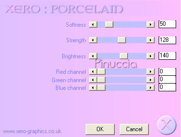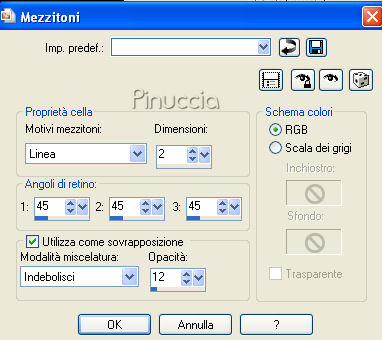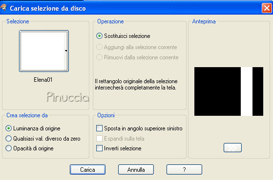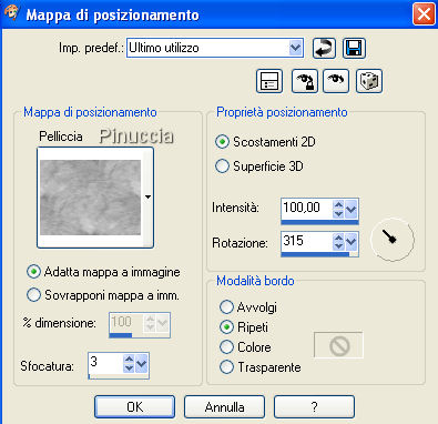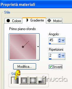 qui puoi trovare qualche risposta ai tuoi dubbi. Se l'argomento che ti interessa non è presente, ti prego di segnalarmelo. Questo tutorial è stato scritto con PSP 9, ma può essere eseguito anche con le altre versioni di PSP. Occorrente: I tubes: Yoka-PortraitElena-1806-07, @nn_280507_flowers_057_tulproos, e blatt. La maschera 20-20 (da mettere nella cartella Maschere). La selezione Elena01 (da mettere nella cartella Selezioni). I pennelli cloud9 swimmingswans e Beauty1 (apri i files in PSP ed esportali come pennelli personalizzati; come fare vedi qui) Materiale qui Filtri: Filters Unlimited qui Xero - Porcelain qui FM Tile Tools qui Mura's Seamless qui 1. Apri una nuova immagine trasparente 700 x 500 pixels. Imposta il colore di primo piano con #dabfc6, e il colore di sfondo con #b7828a. Passa il colore di primo piano a Gradiente di primo piano/sfondo, con i seguenti settaggi: ![]() Riempi l'immagine trasparente con il gradiente.Regola>Sfocatura>Sfocatura gaussiana, raggio 15. ![]() 2. Effetti>Effetti di distorsione>Mappa di posizionamento - Pelliccia, con i seguenti settaggi: ![]() Effetti>Plugins>FM Tile Tools - Blend Emboss, con i settaggi standard. ![]() Effetti>Effetti artistici>Mezzitoni: ![]() Livelli>Nuovo livello raster. Selezione>Seleziona tutto. Apri il tube @nn_280507_flowers_057_tulproos, e vai a Modifica>Copia. Torna al tuo lavoro e vai a Modifica>Incolla>Incolla nella selezione. Selezione>Nessuna selezione. 3. Livelli>Duplica. Attiva il livello sottostante (il livello originale del fiore). Regola>Sfocatura>Sfocatura gaussiana, raggio 15. Attiva il livello superiore. Cambia la modalità di miscelatura di questo livello in Sovrapponi. Effetti>Plugins>FM Tile Tools - Blend Emboss con i settaggi standard. Abbassa l'opacità di questo livello al 50%. Livelli>Unisci>Unisci visibile. Effetti>Plugins>Xero - Porcelain, con i seguenti settaggi: ![]() 4. Apri il tube Yoka-PortraitElena-1806-07, e vai a Modifica>Copia. Torna al tuo lavoro e vai a Modifica>Incolla>Incolla come nuovo livello. Immagine>Rifletti. Sposta il tube a sinistra, contro il bordo.Livelli>Carica/Salva maschera>Carica maschera da disco. Cerca e carica la maschera 20-20: ![]() Livelli>Unisci>Unisci gruppo. Livelli>Duplica, e attiva il livello centrale (il tube originale). Regola>Sfocatura>Sfocatura gaussiana, raggio 15. Attiva il livello superiore. Cambia la modalità di miscelatura di questo livello in Sovrapponi. Effetti>Plugins>FM Tile Tools - Blend Emboss, con i settaggi standard. Effetti>Plugins>Xero - Porcelain, con i settaggi precedenti. Livelli>Unisci>Unisci visibile. ![]() 5. Selezione>Carica/Salva selezione>Carica selezione da disco. Cerca e carica la selezione Elena01: ![]() Modifica>Copia. Mantieni selezionato. Livelli>Nuovo livello raster. Modifica>Incolla>Incolla nella selezione. Effetti>Effetti artistici>Mezzitoni: ![]() Selezione>Nessuna selezione. Effetti>Effetti 3d>Sfalsa ombra, con i seguenti settaggi, colore #6a2f30. ![]() Livelli>Duplica, 2 volte. Sposta le tre strisce, come nel mio esempio.![]() Controlla di essere posizionato sul livello superiore e vai a Livelli>Unisci>Unisci giù. Ripeti Livelli>Unisci>Unisci giù e avrai le tre strisce in un unico livello. Effetti>Plugins>Xero - Porcelain, con i seguenti settaggi: ![]() 6. Livelli>Nuovo livello raster. Imposta il colore di primo piano con #fff1f5. Attiva lo strumento Pennello e cerca il pennello cloud9 swimmingswans.