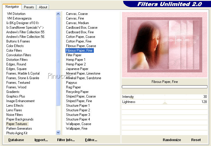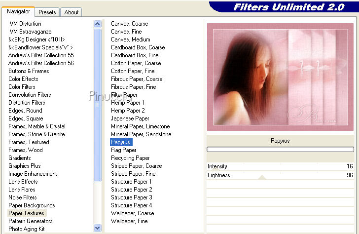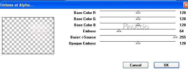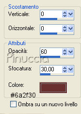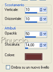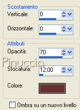 Clicca due volte con il tasto sinistro del mouse per usare il colore di primo piano sulle strisce, in modo che i cigni siano visibili nella parte più scura del fiore. Effetti>Plugins>Mura's Seamless - Emboss et Alpha, con i seguenti settaggi. ![]() Livelli>Nuovo livello raster. Attiva nuovamente lo strumento Pennello ![]() cerca e seleziona il pennello Beauty1, e applicalo con il colore di primo piano sotto le tre strisce. Effetti>Effetti 3D>Sfalsa ombra, con i seguenti settaggi: ![]() 7. Livelli>Unisci>Unisci tutto. Immagine>Aggiungi bordatura, 2 pixels, simmetriche, con il colore #fff1f5. Immagine>Aggiungi bordatura, 30 pixels, simmetriche, con il colore #d0939d. Attiva lo strumento Bacchetta magica ![]() ![]() e seleziona il bordo da 30 pixels. Effetti>Plugins>Filters Unlimited - Paper Textures - Papyrus, con i seguenti settaggi: ![]() Effetti>Plugins>FM Tile Tools- Blend Emboss, con i settaggi standard. Selezione>Nessuna selezione. Immagine>Aggiungi bordatura, 2 pixels, simmetriche, con il colore bianco. Immagine>Aggiungi bordatura, 50 pixels, simmetriche, con il colore #fad6da. Seleziona il bordo con la bacchetta magica ![]() Effetti>Plugins>Filters Unlimited - Paper Textures - Fibrous Paper Fine. ![]() Effetti>Plugins>FM Tile Tools Blend Emboss, con i settaggi standard. Selezione>Inverti. Effetti>Effetti 3D>Sfalsa ombra, con i seguenti settaggi: ![]() Ripeti l'Effetto Sfalsa ombra, ma cambiando verticale e orizzontale con -10. Selezione>Nessuna selezione. Immagine>Aggiungi bordatura, 2 pixels, simmetriche, con il colore #be858e. Apri il tube "Blatt" e vai a Modifica>Copia. Torna al tuo lavoro e vai a Modifica>Incolla>Incolla come nuovo livello. Posiziona la foglia nell'angolo in alto a sinistra.Livelli>Duplica. Immagine>Rifletti. Immagine>Capovolgi. Aggiungi il tuo nome e/o il tuo watermark. Livelli>Unisci>Unisci tutto. 8. Immagine>Ridimensiona, a 650-700 pixels, o come preferisci, e salva in formato jpg. ![]() Se hai problemi o dubbi, o trovi un link non funzionante, o anche soltanto per un saluto, scrivimi. 13 Febbraio 2008 |