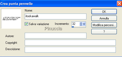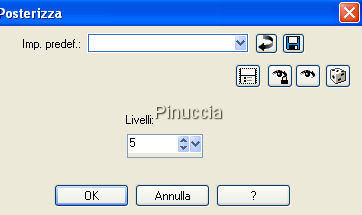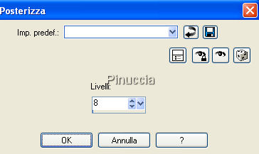qui puoi trovare qualche risposta ai tuoi dubbi. Se l'argomento che ti interessa non è presente, ti prego di segnalarmelo. Questo tutorial è stato scritto con PSP 9, ma può essere eseguito anche con le altre versioni di PSP. Occorrente: i tubes: SKF_Glas259.07, jet-woman-27-november-2007, SKF_Skyline021.07. il pennello I took a walk down (da esportare in PSP). Materiale qui Filtro: Xero - Porcelain qui 1. Apri una nuova immagine trasparente 800 x 500 pixels. Imposta il colore di primo piano con il nero (#000000), e riempi l'immagine trasparente con il nero.Livelli>Nuovo livello raster. Attiva lo strumento Selezione , rettangolo,clicca sull'icona Selezione personalizzata ![]() e imposta i seguenti settaggi: ![]() Apri il tube SKF_Skyline021.07, e vai a Modifica>Copia. Torna al tuo lavoro e vai a Modifica>Incolla nella selezione. Selezione>Nessuna selezione. 2. Livelli>Duplica. Immagine>Capovolgi. Attiva il livello duplicato. Regola>Tonalità e Saturazione>Viraggio: ![]() Abbassa l'opacità di questo livello al 40%. 3. Livelli>Unisci>Unisci visibile. Effetti>Effetti artistici>Posterizza: ![]() Effetti>Plugins>Xero - Porcelain: ![]() 4. Apri il tube jet-woman-27-november-2007, e vai a Modifica>Copia. Torna al tuo lavoro e vai a Modifica>Incolla>Incolla come nuovo livello. Sposta il tube a destra.Effetti>Effetti artistici>Posterizza - livelli: 10. Effetti>Plugins>Xero - Porcelain: ![]() 5. Apri il tube SKF_Glas259.07 e vai a Modifica>Copia. Torna al tuo lavoro e vai a Modifica>Incolla>Incolla come nuovo livello. Immagine>Ridimensiona, al 50%, tutti i livelli non selezionato, bicubica. ![]() Attiva lo strumento Gomma ![]() e cancella il liquido blu che esce dal bicchiere. ![]() Immagine>Ruota>Ruota per gradi - 22 gradi a sinistra. ![]() Sposta il bicchiere in basso a sinistra.Regola>Messa a fuoco>Metti a fuoco. Effetti>Effetti artistici>Posterizza: ![]() 5. Effetti>Plugins>Xero - Porcelain: ![]() 6. Livelli>Nuovo livello raster. Imposta il colore di primo piano con #ffffc4. Apri il pennello "I took a walk down". File>Esporta - Pennello personalizzato. ![]() Assegna un nome al pennello e clicca ok. ![]() Attiva lo strumento Pennello ![]() Cerca e seleziona il pennello che hai appena esportato e applicalo tra la donna e il bicchiere. Effetti>Effetti 3D>Sfalsa ombra, con i seguenti settaggi: ![]() 7. Livelli>Unisci>Unisci tutto. Immagine>Aggiungi bordatura, 1 pixel, simmetriche, con il colore #0082d8. Immagine>Aggiungi bordatura, 30 pixels, simmetriche, con il colore nero. Immagine>Aggiungi bordatura, 1 pixel, simmetriche, con il colore #0082d8. Aggiungi il tuo nome e/o il tuo watermark e, se vuoi, ridimensiona l'immagine come preferisci. Salva in formato jpg. ![]() Se hai problemi o dubbi, o trovi un link non funzionante, o anche soltanto per un saluto, scrivimi. 8 Febbraio 2008 |
