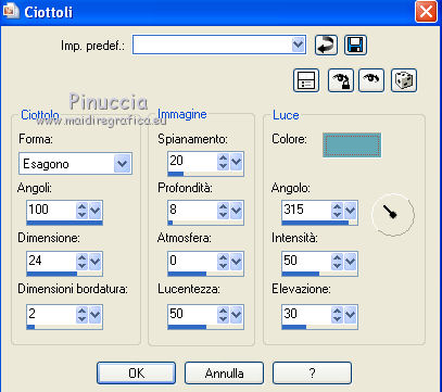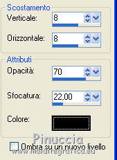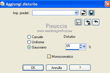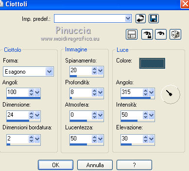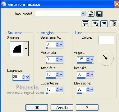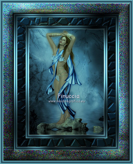 qui puoi trovare qualche risposta ai tuoi dubbi. Se l'argomento che ti interessa non è presente, ti prego di segnalarmelo. Questo tutorial è stato creato con PSP 9, ma può essere eseguito anche con le altre versioni di PSP. Per tradurlo, ho usato PSP X. Occorrente: Un'immagine a scelta. Il resto del materiale qui Filtri: Graphics Plus qui 1. Apri la tua immagine in PSP. Immagine>Ridimensiona - a 350 pixels di altezza. Duplicala usando la combinazione di tasti maiuscola+D e minimizza la copia. 2. Scegli due colori dalla tua immagine, e imposta il colore di primo piano con il colore chiaro, e il colore di sfondo con il colore scuro. 3. Immagine>Aggiungi bordatura, 3 pixels, simmetriche, con il colore chiaro. Immagine>Aggiungi bordatura, 5 pixels, simmetriche, con il colore scuro. Immagine>Aggiungi bordatura, 3 pixels, simmetriche, con il colore chiaro. Selezione>Seleziona tutto. Selezione>Modifica>Contrai - 11 pixels. Selezione>Inverti. Effetti>Plugins>Graphics Plus - Cross Shadow, con i settaggi standard. ![]() Selezione>Deseleziona. ![]() 4. Immagine>Aggiungi bordatura, 28 pixels, simmetriche, con un colore non presente nell'immagine. Seleziona questo bordo con la bacchetta magica , sfumatura e tolleranza 0.Livelli>Nuovo livello raster. 5. Attiva la copia della tua immagine e vai a Modifica>Copia. Torna al tuo lavoro e vai a Modifica>Incolla nella selezione. Effetti>Effetti di trama>Ciottoli, con il colore scuro di sfondo. ![]() Selezione>Deseleziona. Regola>Messa a fuoco>Metti a fuoco. Livelli>Unisci>Unisci tutto. ![]() 6. Ripeti il passo 3. 7. Immagine>Aggiungi bordatura, 35 pixels, simmetriche, con un colore non presente nell'immagine. Seleziona questo bordo con la bacchetta magica ![]() Modifica>Incolla nella selezione (la tua immagine è ancora in memoria). Effetti>Effetti di distorsione>Vento - da destra - intensità 100. ![]() Regola>Aggiungi/Rimuovi disturbo>Aggiungi disturbo. ![]() 8. Effetti>Effetti 3D>Smusso a incasso. ![]() Selezione>Deseleziona. ![]() 9. Ripeti il passo 3. ![]() 10. Immagine>Aggiungi bordatura, 28 pixels, simmetriche, con un colore non presente nell'immagine. Seleziona questo bordo con la bacchetta magica ![]() Livelli>Nuovo livello raster. Modifica>Incolla nella selezione (la tua immagine è ancora in memoria). Effetti>Effetti di trama>Ciottoli, con i settaggi precedenti, ma questa volta con il colore chiaro di primo piano. ![]() Selezione>Deseleziona. Regola>Messa a fuoco>Metti a fuoco. 11. Ripeti il passo 3. 12. Se vuoi, aggiungi degli angoli alla tua cornice. Puoi usare i tubes forniti con il materiale. 13. Effetti>Effetti 3D>Sfalsa ombra: ![]() Se vuoi, puoi aggiungere un testo. Nel mio esempio ho scritto Fantasia con il font Monika, dimensione 48, colore di sfondo un motivo oro. Al testo ho applicato l'Effetto Sfalsa ombra con i settaggi precedenti. Non dimenticare di firmare il tuo lavoro. Livelli>Unisci>Unisci tutto e salva in formato jpg. ![]() Se hai problemi o dubbi, o trovi un link non funzionante, o anche soltanto per un saluto, scrivimi. 30 Agosto 2010 |
