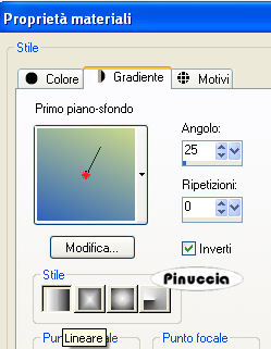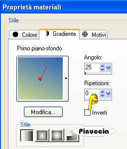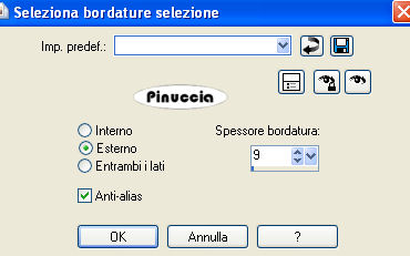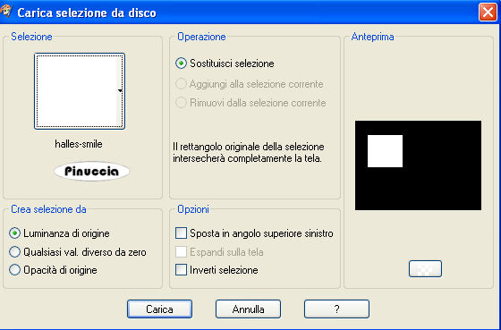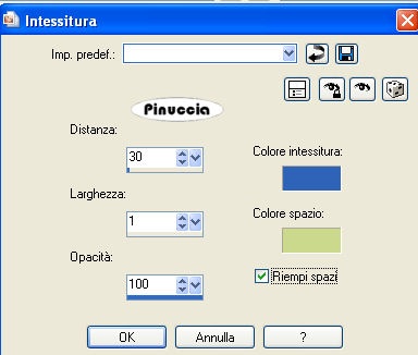qui puoi trovare qualche risposta ai tuoi dubbi. Se l'argomento che ti interessa non è presente, ti prego di segnalarmelo. Questo tutorial è stato scritto con PSP 9, ma può essere eseguito anche con le altre versioni di PSP. Occorrente: Materiale qui i tubes: jet-halleberry-july-2007med, StripeWith-O, e text-b-smile. la selezione halles-smile (da mettere nella cartella Selezioni). Ti servirà anche la maschera 20-20. Se non ce l'hai clicca qui Filtri: Filters Unlimited qui Graphics Plus qui 1. Apri una nuova immagine trasparente 600 x 820 pixels. Imposta il colore di primo piano con #cbd98d, e il colore di sfondo con #2e63b8. Passa il colore di primo piano/sfondo a Gradiente di primo piano/sfondo, con i seguenti settaggi. ![]() Riempi l'immagine trasparente con il gradiente.Apri il tube jet-halleberry-july-2007med, e vai a Modifica>copia. Torna al tuo lavoro e vai a Modifica>Incolla>Incolla come nuovo livello. 2. Immagine>Ridimensiona, al 140%, tutti i livelli non selezionato, ricampionamento bicubica: ![]() Regola>Messa a fuoco>Metti a fuoco. Livelli>Unisci>Unisci visibile. Livelli>Carica/Salva maschera>Carica maschera da disco. Cerca e carica la maschera 20-20: ![]() Livelli>Unisci>Unisci gruppo. Modifica>Copia. minimizza immagine, perchè ti servirà ancora. 3. Apri una nuova immagine trasparente 700 x 500 pixels, e riempila con il gradiente.Modifica>Incolla>Incolla come nuovo livello. Immagine>Ridimensiona, al 60%, tutti i livelli non selezionato. ![]() Sposta l'immagine a destra, vicino al bordo.Regola>Messa a fuoco>Metti a fuoco. 4. Attiva nuovamente l'immagine originale della maschera, che hai mininizzato prima. Attiva lo strumento Selezione , rettangolo, sfumatura 0,e traccia una selezione della testa di Halle. Modifica>Copia. Torna al tuo lavoro. Livelli>Nuovo livello raster. Selezione>Carica/Salva selezione>Carica selezione da disco. Cerca e carica la selezione halles-smile. ![]() Cambia i settaggi del gradiente, togliendo la spunta a Inverti. ![]() Riempi la selezione con il gradiente.Selezione>modifica>Contrai, di 8 pixels. Livelli>Nuovo livello raster. Modifica>Incolla>Incolla nella selezione. Livelli>Unisci>Unisci giù. Selezione>Modifica>Seleziona bordature selezione. ![]() Effetti>Plugins>Graphics Plus - Cross Shadow, con i settaggi standard. ![]() Effetti>Plugins>Filters Unlimited - Buttons and Frames - Mirrore Frame. ![]() Effetti>effetti di bordo>Aumenta. Selezione>Nessuna selezione. 5. Livelli>Duplica. Attiva il livello originale. Regola>Sfocatura>Sfocatura gaussiana, raggio 25: ![]() Effetti>Effetti di trama>Intessitura: ![]() Livelli>Duplica. Sposta i due livelli uno sotto l'altro, vedi l'esempio finale.Livelli>Unisci>Unisci giù. 6. Attiva il livello superiore. Immagine>Ruota>Ruota per gradi - 15 gradi a sinistra. ![]() Sposta l'immagine un po' più in alto a sinistra, vedi l'esempio finale.Livelli>Duplica. Immagine>Rifletti. Sposta la copia sotto l'originale.Livelli>Unisci>Unisci giù. Effetti>Effetti 3D>Sfalsa ombra, con i seguenti settaggi: ![]() 7. Apri il tube StripeWith-O, e vai a Modifica>Copia. Torna al tuo lavoro e vai a Modifica>Incolla>Incolla come nuovo livello. Sposta il tube a sinistra in modo che gli anelli tocchino un pezzetto delle piccole immagini.Livelli>Duplica. Immagine>Rifletti. Immagine>Capovolgi. Aggiungi il tuo nome e/o il tuo watermark e controlla che tutto sia al posto giusto. 8. Livelli>Unisci>Unisci tutto. Apri il tube text-tube e vai a Modifica>Copia. Torna al tuo lavoro e vai a Modifica>Incolla>Incolla come nuovo livello. Sposta il testo dove preferisci.Immagine>Aggiungi bordatura, 1 pixel, simmetriche, con il colore di sfondo. Immagine>Aggiungi bordatura, 50 pixels, simmetriche, con il colore bianco. Attiva lo strumento Bacchetta magica , sfumatura e tolleranza 0,![]() Selezione>Inverti. Effetti>Effetti 3D>Sfalsa ombra, con i settaggi precedenti. Selezione>Nessuna selezione. Immagine>Aggiungi bordatura, 1 pixel, simmetriche, con il colore di sfondo. Immagine>Ridimensiona, a 650 pixels di larghezza, o come preferisci. Salva in formato jpg. ![]() Se hai problemi o dubbi, o trovi un link non funzionante, o anche soltanto per un saluto, scrivimi. 11 Marzo 2008 |