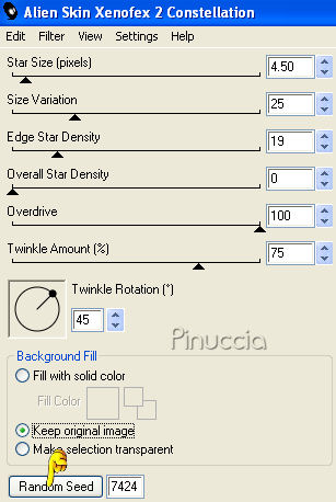 qui puoi trovare qualche risposta ai tuoi dubbi. Se l'argomento che ti interessa non è presente, ti prego di segnalarmelo. Questo tutorial è stato scritto con PSP 9, ma può essere eseguito anche con le altre versioni di PSP. Occorrente: I Tubes: SE_doodleART_4, Yoka-Photos-Models-Phtgr021107, deco01, p14-dozi. Materiale qui Filtri: Filters Unlimited qui FM Tile Tools qui Xero qui Simple qui Alien Skin Xenofex 2 qui Ti servirà anche Animation Shop qui 1. Apri una nuova immagine trasparente 600 x 450 pixels, e riempila con il bianco.Livelli>Nuovo livello raster. Selezione>Seleziona tutto. Apri il tube Yoka-Photos-Models-Phtgr021107, e vai a Modifica>Copia. Torna al tuo lavoro e vai a Modifica>Incolla>Incolla nella selezione. Cambia la modalità di miscelatura di questo livello in Luminanza (Esistente), e abbassa l'opacità al 20%. Effetti>Plugins>FM Tile Tools - Blend Emboss con i settaggi standard. ![]() Selezione>Nessuna selezione. Modifica>Incolla>Incolla come nuovo livello (il tube è ancora in memoria). Sposta il tube a destra, come nel mio esempio.2. Effetti>Plugins>Fulters Unlimited - Special Effects 1 - Watercolor, con i seguenti settaggi ![]() Effetti>Plugins>FM Tile Tools - Blend Emboss, con i settaggi standard. Effetti>Plugins>Xero - Porcelain, con i seguenti settaggi: ![]() 3. Attiva il livello centrale. Apri il tube SE_doodleART_4, e vai a Modifica>Copia. Torna al tuo lavoro e vai a Modifica>Incolla>Incolla come nuovo livello. Immagine>Ridimensiona, all'80%, tutti i livelli non selezionato. ![]() Attiva lo strumento Deformazione ![]() puntatore , se stai usando PSP X,e ruota il tube spostandolo sul lato sinistro dell'immagine. sull'uso di questo strumento vedi alcuni appunti qui ![]() Regola>Messa a fuoco>Metti a fuoco. Effetti>Effetti 3D>Sfalsa ombra, con i seguenti settaggi ![]() 4. Attiva il livello superiore. Apri il tube p14-dozi e vai a Modifica>Copia. Torna al tuo lavoro e vai a Modifica>Incolla>Incolla come nuovo livello. Immagine>Rifletti. Immagine>Ridimensiona, all'80%, tutti i livelli non selezionato. Sposta il flaconcino a sinistra.Cambia la modalità di miscelatura di questo livello in Luminanza (esistente). Effetti>Effetti 3D>Sfalsa ombra, con i settaggi precedenti. Livelli>Duplica. Immagine>Ridimensiona, all'80%, tutti i livelli non selezionato. Sposta il flaconcino più piccolo accanto al grande.Livelli>Unisci>Unisci tutto. Immagine>Aggiungi bordatura, 2 pixels, simmetriche, con il colore nero. Immagine>Aggiugni bordatura, 60 pixels, simmetriche, con il colore bianco. Immagine>Aggiungi bordatura, 2 pixels, simmetriche, con il colore nero. 5. Apri il tube deco01. Il tube è composto da due livelli. Attiva il livello inferiore e vai a Modifica>Copia. Torna al tuo lavoro e vai a Modifica>Incolla>Incolla come nuovo livello. Sposta il tube nell'angolo in alto a sinistra.Effetti>Effetti 3D>Sfalsa ombra, con i seguenti settaggi: ![]() Effetti>Plugins>Simple - Top Left Mirror. Attiva nuovamente il tube deco01 e posizionati sul livello superiore (la perla). Modifica>Copia. Torna al tuo lavoro e vai a Modifica>Incolla>Incolla come nuovo livello. Posiziona la perla al centro della spirale, nell'angolo in alto a sinistra.Effetti>Plugins>Simple - Top Left Mirror. Modifica>Incolla>Incolla come nuovo livello (la perla è ancora in memoria). Immagine>Ridimensiona, all'80%, tutti i livelli non selezionato. Posiziona la perla ridimensionata al centro del fiorellino del "doodle", vedi il mio esempio.Livelli>Duplica, e sposta il duplicato al centro dell'altro fiorellino.Livelli>Unisci>Unisci giù. Livelli>Unisci giù. Regola>Messa a fuoco>Metti a fuoco. Aggiungi, se vuoi, il tuo watermark. 6. Imposta il colore di sfondo con il nero e chiudi il colore di primo piano. Attiva lo strumento Testo e scegli un bel font.Scrivi il tuo nome in basso. Livelli>Converti in livello raster. Effetti>Effetti 3D>Sfalsa ombra, e assicurati di aver selezionato Ombra su nuovo livello. ![]() Attiva il livello superiore (il testo). 7. Effetti>Plugins>Alien Skin Xenofex 2 - Constellation: ![]() 7. Filter AlienSkin Xenofex2 Constellations. Modifica>Copia Unione. Apri Animation Shop e vai a Modifica>Incolla>Incolla come nuova animazione. Torna in Psp. Modifica>Annulla azione Constellation, ![]() Ripeti l'Effetto Constellation, ma cliccando una volta sul tasto Random Seed. ![]() Modifica>Copia Unione. In Animation Shop: Modifica>Incolla>Incolla dopo il fotogramma corrente. Di nuovo in PSP. Modifica>Annulla azione Constellation. Ripeti l'Effetto Constellation, cliccando su Random Seed. Modifica>copia Unione. Per finire, in Animation Shop e vai a Modifica>Incolla>Incolla dopo il fotogramma corrente. 8. Ed ecco la tua animazione composta da 3 fotogrammi. Clicca sul primo fotogramma per selezionarlo e vai a Modifica>Seleziona tutto. Animazione>Ridimensiona animazione, a 600 pixels di larghezza, o come preferisci. Controlla il risultato cliccando su Visualizza e salva in formato gif.Ecco un esempio con un font diverso: ![]() ![]() Se hai problemi o dubbi, o trovi un link non funzionante, o anche soltanto per un saluto, scrivimi. 14 Febbraio 2008 |