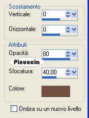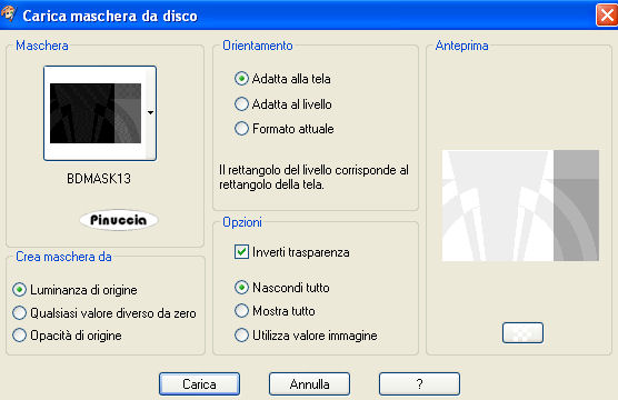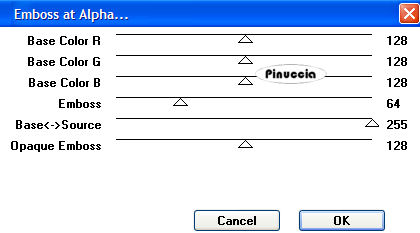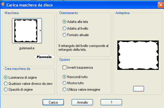 qui puoi trovare qualche risposta ai tuoi dubbi. Se l'argomento che ti interessa non è presente, ti prego di segnalarmelo. Questo tutorial è stato creato con PSP 9, ma può essere eseguito anche con le altre versioni di PSP. Occorrente: Materiale qui i tubes: @nn220707_photos_132_sculpture, @nn_160707_photos_124_Yiri1 le maschere: 20-20, gutemaske, BDMask13 i pennelli: agi_wb_dontcare, agi_wb_secrets, dark corner Filtri: FM Tile Tools qui Mura's Seamless Emboss at Alpha qui 1. Apri una nuova immagine trasparente 700 x 500 pixels. Imposta il colore di primo piano con il bianco (#ffffff), e il colore di sfondo con #c0c0c0. Riempi l'immagine trasparente con il colore bianco di primo piano.Livelli>Nuovo livello raster. Riempi il nuovo livello con il colore #c0c0c0.per riempire con il colore di sfondo, devi cliccare con il tasto destro del mouse. Livelli>Carica/Salva maschera>Carica maschera da disco. Cerca e carica la maschera BDMask13. ![]() Effetti>Effetti di bordo>Aumenta di più. Livelli>Unisci>Unisci gruppo. ![]() 2. Livelli>Nuovo livello raster. Attiva lo strumento Pennello ![]() cerca e seleziona il pennello "dark corner", e applicalo al centro dell'immagine con il colore di primo piano. Attiva lo strumento Deformazione ![]() Puntatore , se stai usando PSP Xe allarga il pennello per tutta la larghezza dell'immagine. Regola>Messa a fuoco>Metti a fuoco. Abbassa l'opacità di questo livello al 50%. 3. Apri il tube @nn220707_photos_132_sculpture, e vai a Modifica>Copia. Torna al tuo lavoro e vai a Modifica>Incolla>Incolla come nuovo livello. Livelli>Carica/Salva maschera>Carica maschera da disco. Cerca e carica la maschera 20-20, con i seguenti settaggi: ![]() Livelli>Unisci>Unisci gruppo. Sposta il tube a sinistra.Apri il tube @nn_160707_photos_124_Yiri1, e vai a Modifica>Copia. Torna al tuo lavoro e vai a Modifica>Incolla>Incolla come nuovo livello. Immagine>Ridimensiona, all'85%, bicubica, tutti i livelli non selezionato. ![]() Immagine>Rifletti. Livelli>Carica/Salva maschera>Carica maschera da disco. Carica nuovamente la maschera 20-20. ![]() Livelli>Unisci>Unisci gruppo. Sposta il tube a destra.![]() 4. Livelli>Unisci>Unisci tutto. Immagine>Aggiungi bordatura, 2 pixels, simmetriche, con il colore bianco. Effetti>Plugins>FM Tile Tools - Blend Emboss, con i settaggi standard. ![]() 5. Regola>Saturazione e Tonalità>Viraggio, con i seguenti settaggi: ![]() Livelli>Nuovo livello raster. Il colore di primo piano è sempre impostato sul bianco. Attiva lo strumento Pennello ![]() Cerca e seleziona il pennello agi_wb_secrets, e applicalo al centro dell'immagine. Cerca e seleziona il pennello agi_wb_dontcare, e applicalo in basso. Effetti>Plugins>Mura's Seamless - Emboss at Alpha, con i seguenti settaggi: ![]() ![]() 5. Livelli>Unisci>Unisci visibile. 6. Livelli>Duplica. Livelli>Carica/Salva maschera>Carica maschera da disco. Cerca e carica la maschera "gutemaske", con i seguenti settaggi. ![]() Livelli>Unisci>Unisci gruppo. Immagine>Ridimensiona, al 95%, ricampionamento bicubica, tutti i livelli non selezionato. ![]() 7. Effetti>Effetti 3D>Sfalsa ombra, con i seguenti settaggi, colore #745041. ![]() Immagine>Ruota>Ruota per gradi, 5 gradi a sinistra: ![]() 8. Livelli>Nuovo livello raster. Attiva lo strumento Selezione , rettangolo, sfumatura e tolleranza 0,e traccia un rettangolo in basso, come nel mio esempio. ![]() Riempi la selezione con il bianco.Selezione>Modifica>Contrai, di 2 pixels. Premi sulla tastiera il tasto CANC ![]() Riempi nuovamente la selezione con il bianco.Abbassa l'opacità di questo livello al 35%. Chiudi la visibilità dei due livelli inferiore e posizionati su uno dei due livelli superiori. Livelli>Unisci>Unisci visibile. Selezione>Nessuna selezione. Visualizza nuovamente i livelli inferiori. Livelli>Unisci>Unisci tutto. 9. Imposta il bianco come colore di sfondo e chiudi il colore di primo piano. Attiva lo strumento Testo e scegli un bel font, crea come vettore.Scrivi un testo nella striscia. io ho usato il font Moonbean Regular Livelli>Converti in livello raster. Io ho usato un secondo testo per scrivere il mio nome nella striscia. Effetti>Effetti 3D>Sfalsa ombra, con i seguenti settaggi, colore #2c201a. ![]() Immagine>Aggiungi bordatura, 2 pixels, simmetriche, con il colore #9a7261. Aggiungi, se vuoi, il tuo watermark al blend. Immagine>Ridimensiona, a circa 700 pixels (come preferisci). Regola>Messa a fuoco>Metti a fuoco. Salva in formato jpg. ![]() Se hai problemi o dubbi, o trovi un link non funzionante, o anche soltanto per un saluto, scrivimi. 14 Agosto 2007 |
