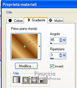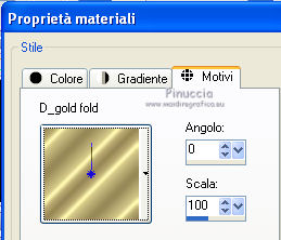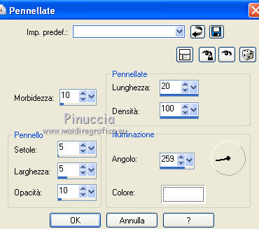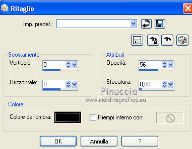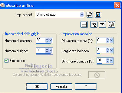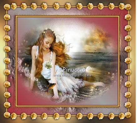qui puoi trovare qualche risposta ai tuoi dubbi. Se l'argomento che ti interessa non è presente, ti prego di segnalarmelo. Questo tutorial è stato creato con PSP 9, ma può essere eseguito anche con le altre versioni di PSP. Per tradurlo, ho usato PSP X. Occorrente: Un'immagine a scelta. Il resto del materiale qui Filtri: Penta.com - Jeans qui Xero - Porcelain qui FM Tile Tools - Blend Emboss qui Graphics Plus qui Metti l'ornamento Green Rose nella cartella Ornamenti. Metti il motivo oro D_gold_fold nella cartella Motivi. 1. Apri la tua immagine (che dovrebbe essere più larga che lunga) e vai a Modifica>Copia. Apri una nuova immagine trasparente 400 x 300 pixels. Selezione>Seleziona tutto. Modifica>Incolla nella selezione. Selezione>Deseleziona. Duplica il lavoro con la combinazione di tasti maiuscola+D e minimizza la copia. Scegli due colori dall'immagine. Imposta il colore di primo piano con il colore chiaro, e il colore di sfondo con il colore scuro. 2. Immagine>Aggiungi bordatura, 2 pixels, simmetriche, con il colore scuro. Immagine>Aggiungi bordatura, 4 pixels, simmetriche, con il colore chiaro. Immagine>Aggiungi bordatura, 2 pixels, simmetriche, con il colore scuro. 3. Selezione>Seleziona tutto. Selezione>Modifica>Contrai - 8 pixels. Selezione>Inverti. Livelli>Nuovo livello raster. Effetti>Effetti 3D>Ritaglio. ![]() Selezione>Deseleziona. 4. Livelli>Unisci>Unisci tutto. Immagine>Aggiungi bordatura, 30 pixels, simmetriche, con il colore bianco. Seleziona questo bordo con la bacchetta magica , sfumatura e tolleranza 0.Attiva la copia del lavoro che hai minimizzato prima e vai a Modifica>Copia. Torna al tuo lavoro e vai a Modifica>Incolla nella selezione. Mantieni selezionato. 5. Effetti>Effetti tecniche di disegno>Pennellate. ![]() 6. Selezione>Deseleziona. Ripeti i passi 2 e 3. 7. Livelli>Unisci>Unisci tutto. 8. Passa il colore di primo piano a Gradiente. ![]() Immagine>Aggiungi bordatura, 25 pixels, simmetriche, con il colore bianco. Seleziona questo bordo con la bacchetta magica ![]() e riempilo con il gradiente.Mantieni selezionato. Effetti>Plugins>Graphics Plus - Cross Shadow, con i settaggi standard. ![]() Mantieni ancora selezionato. Effetti>Plugins>Penta.com - Jeans, con i settaggi standard: ![]() Effetti>Plugins>FM Tile Tools - Blend Emboss, con i settaggi standard - 2 volte. ![]() Selezione>Deseleziona. 9. Livelli>Nuovo livello raster. Attiva lo strumento Ornamento ![]() cerca e seleziona l'ornamento Green Rose, scala 20, e applicalo sulla piccola cornice. Se stai usando altri colori, prendi nota dei valori di Tonalità (H) e Saturazione (S) del tuo colore chiaro di primo piano. Regola>Tonalità e saturazione>Viraggio, e trascrivi i valori annotati nelle rispettive caselle. Effetti>Effetti 3D>Sfalsa ombra: ![]() 10. Livelli>Duplica, e ripeti finchè non avrai 11 livelli della rosa. Posiziona le rose in fila, come nell'esempio.![]() 11. Chiudi il livello inferiore e lascia visibili i livelli delle rose. Livelli>Unisci>Unisci visibile. 12. Livelli>Duplica. Immagine>Rifletti. Livelli>Duplica. Immagine>Ruota per gradi - 90 gradi a destra. ![]() Posiziona la riga di rose sulla cornice superiore.Livelli>Duplica. Immagine>Capovolgi. ![]() Livelli>Unisci>Unisci tutto. 13. Ripeti i passi 2 e 3. 14. Livelli>Unisci>Unisci tutto. 15. Immagine>Aggiungi bordatura, 30 pixels, simmetriche, con il colore bianco. Seleziona questo bordo con la bacchetta magica ![]() Modifica>Incolla nella selezione (l'immagine dovrebbe essere ancora in memoria). 16. Effetti>Effetti di distorsione>Vento - da sinistra, intensità 100. ![]() Mantieni selezionato. Effetti>Effetti di trama>Mosaico antico. ![]() Regola>Messa a fuoco>Accentua messa a fuoco. 17. Selezione>Deseleziona. Selezione>Seleziona tutto. Livelli>Nuovo livello raster. Riempi con il gradiente.Selezione>Modifica>Contrai - 5 pixels. Premi sulla tastiera il tasto CANC. Selezione>Inverti. Effetti>Plugins>Graphics Plus - Cross Shadow - 2 volte con i settaggi standard. Effetti>Effetti 3D>Sfalsa ombra: ![]() Ripeti l'Effetto Sfalsa ombra invertendo verticale e orizzontale. ![]() Selezione>Deseleziona. Livelli>Unisci>Unisci tutto. 18. Effetti>Plugins>FM Tile Tools - Blend Emboss, con i settaggi standard. Effetti>Plugins>Xero - Porcelain. ![]() 19. Chiudi il colore di primo piano e imposta il colore di sfondo con il motivo oro. ![]() Attiva lo strumento Testo , scegli un font e scrivi in basso a sinistra la parola "Rosie", o quello che preferisci.Livelli>Converti in livello raster. Effetti>Effetti 3D>Sfalsa ombra - 2 volte con i seguenti settaggi. ![]() 20. Aggiungi il tuo nome e/o il tuo watermark. Livelli>Unisci>Unisci tutto. Immagine>Ridimensiona - a 600 pixels di larghezza, e salva in formato jpg. ![]() Se hai problemi o dubbi, o trovi un link non funzionante, o anche soltanto per un saluto, scrivimi. 30 Agosto 2010 |