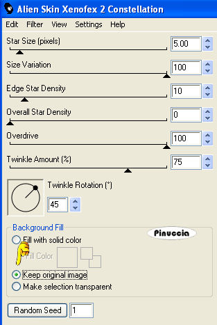 qui puoi trovare qualche risposta ai tuoi dubbi. Se l'argomento che ti interessa non è presente, ti prego di segnalarmelo. Questo tutorial è stato scritto con PSP 9, ma può essere eseguito anche con le altre versioni di PSP. Occorrente: Materiale qui Tubes: @nn_template_170706_pistol_TD, jet_woman12-september-2007, Bubbles. un motivo oro, se non ce l'hai clicca qui. Aprilo e mininizzalo nella tua area di lavoro, lo troverai nella lista dei motivi disponibili quando ti servirà. Filtri: Xenofex 2 - Constellation qui Xero - Porcelain qui Penta.com qui Ti servirà anche Animation Shop qui 1. Apri una nuova immagine trasparente 700 x 500 pixels, e riempila con il bianco (#ffffff).Livelli>Nuovo livello raster. Selezione>Seleziona tutto. Selezione>Modifica>Contrai, di 70 pixels. Riempi ancora con il bianco.Apri il tube @nn_template_170706_pistol_TD, e vai a Modifica>Copia. Torna al tuo lavoro e vai a Modifica>Incolla>Incolla nella selezione. Selezione>Modifica>Seleziona bordature selezione: ![]() Riempi con il colore #808080.Selezione>Nessuna selezione. 2. Attiva lo strumento Distorsione ![]() Puntatore se stai usando PSP XTenendo premuto il tasto Ctrl, "stringi" gli angoli a sinistra, ![]() usando il nodo centrale, "tira" l'immagine a destra. ![]() Quindi sposta l'intera immagine un po' più a destra.![]() sull'uso di questo strumento vedi alcuni appunti qui Livelli>Duplica. Attiva il livello inferiore (il livello originale). Regola>Sfocatura>Sfocatura gaussiana, raggio 3. Attiva il livello superiore. Cambia la modalità di miscelatura di questo livello in Luce netta. Effetti>Effetti 3D>Sfalsa ombra: ![]() 3. Apri il tube jet_woman12-september-2007, e vai a Modifica>Copia. Torna al tuo lavoro e vai a Modifica>Incolla>Incolla come nuovo livello. Sposta il tube a sinistra, come nel mio esempio.Effetti>Plugins>Xero - Porcelain: ![]() 4. Immagine>Aggiungi bordatura, 1 pixel, simmetriche, con il colore #949d4d. Immagine>Aggiungi bordatura, 4 pixels, simmetriche, con il colore bianco. Immagine>Aggiungi bordatura, 60 pixels, simmetriche, con il colore bianco. Livelli>Nuovo livello raster. Attiva lo strumento Selezione , rettangolo, sfumatura e tolleranza 0,e traccia un rettangolo a destra, circa un quarto dell'immagine su tutta l'altezza della tela. Riempi la selezione con il colore bianco.5. Effetti>Effetti di trama>Veneziana, con il colore #4d5219: ![]() Effetti>Plugins>Penta.com - color dot, con i settaggi standard. ![]() Selezione>Nessuna selezione. 6. Attiva lo strumento Distorsione con reticolo ![]() se stai usando PSP X, lo trovi in fondo alla barra laterale degli strumenti ![]() Usa i nodi della griglia, come mostrato nella schermata: ![]() Abbassa l'opacità di questo livello al 50%. Effetti>effetti 3D>Sfalsa ombra, con i seguenti settaggi: ![]() Livelli>Unisci>Unisci tutto. 9. Livelli>Nuovo livello raster. Imposta il colore di primo piano con un colore contrastante a quelli contenuti nella tua immagine. Attiva lo strumento Pennello , con i seguenti settaggi:![]() Applica il pennello sulla tenda, a distanze irregolari. Quando sei soddisfatto, vai a Selezione>Seleziona tutto. Selezione>mobile. Selezione>immobilizza. Effetti>Plugins>Alienskin - Xenofex 2 - Constellation. ![]() Selezione>Nessuna selezione. Modifica>Copia Unione. Apri Animation Shop. Clicca con il tasto destro del mouse sullo spazio vuoto e Incolla come nuova animazione. ![]() Torna in PSP. Modifica>Annulla azione Nessuna selezione. Modifica>Annulla azione Constellation. Effetti>Plugins>Alien Skin - Xenofex 2 - Constellation, con gli stessi settaggi, ma cliccando una volta su Random Seed. Selezione>Nessuna selezione. Modifica>Copia Unione. Torna in Animation Shop e vai a Modifica>Incolla>Incolla dopo il fotogramma corrente. 10. Di nuovo in PSP. Modifica>Annulla azione Nessuna selezione. Modifica>Annulla azione Constellation. Effetti>Plugins>Alien Skin - Xenofex 2 - Constellation, con gli stessi settaggi, ma cliccando una volta su Random Seed. Selezione>Nessuna selezione. Modifica>Copia Unione. Torna in Animation Shop e vai a Modifica>Incolla>Incolla dopo il fotogramma corrente. 10. Clicca sul primo fotogramma per selezionarlo e vai a Modifica>Seleziona tutto. Animazione>Ridimensiona animazione: ![]() Salva in formato gif. ![]() Se hai problemi o dubbi, o trovi un link non funzionante, o anche soltanto per dirmi che ti è piaciuto, scrivimi. 6 Marzo 2008 |