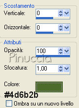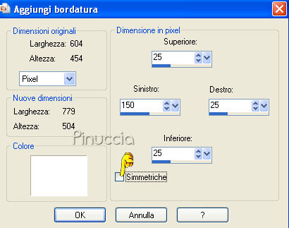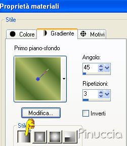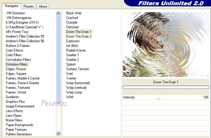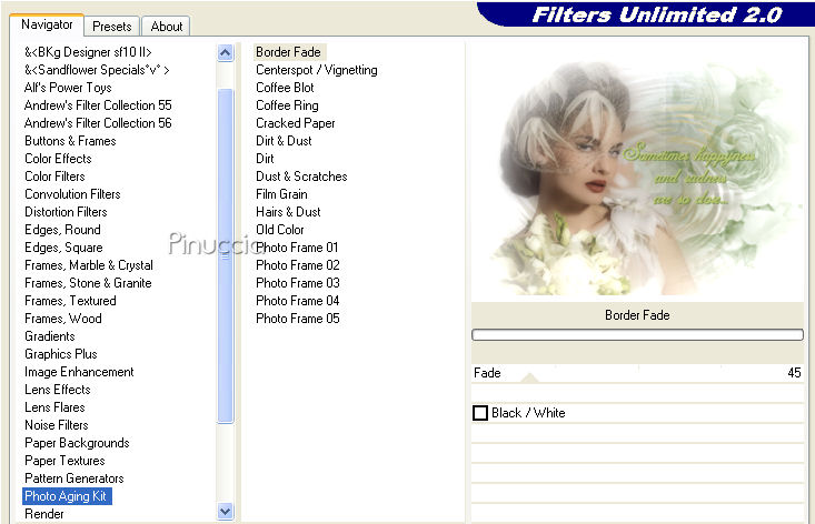 qui puoi trovare qualche risposta ai tuoi dubbi. Se l'argomento che ti interessa non è presente, ti prego di segnalarmelo. Questo tutorial è stato scritto con PSP 9, ma può essere eseguito anche con le altre versioni di PSP. Occorrente: i tubes: jet-woman24-januari-2008 e @nn_250507_flowers_055_nowords_tdstusio. l'ornamento: pearl1 (da mettere nella cartella Ornamenti). la maschera 20-20 (se non ce l'hai clicca qui) i pennelli kitty611 e Sometimes (da importare in PSP: come fare vedi qui) Materiale qui Filtri: Xero - porcelain qui Filters Unlimited 2.0 qui Penta.com qui Photo Aging Kit qui per usare Photo Aging Kit si deve importare nel filtro Unlimited. Come fare vedi qui 1. Apri una nuova immagine BIANCA 600 x 450 pixels. Livelli>Innalza livello di sfondo. Apri il tube @nn_250507_flowers_055_nowords_tdstudio, e vai a Modifica>copia. Torna al tuo lavoro e vai a Modifica>Incolla>Incolla come nuovo livello. Sposta il tube un po' più a destra.Apri il tube jet-woman24-januari-2008, e vai a Modifica>Copia. Torna al tuo lavoro e vai a Modifica>Incolla>Incolla come nuovo livello. Sposta il tube un po' a sinistra.Livelli>Unisci>Unisci giù. ![]() Regola>Sfocatura>Sfocatura gaussiana, raggio 25. ![]() Effetti>Plugins>Filters Unlimited - Distortion Filters - Down The Drain1: ![]() 2. Livelli>Carica/Salva maschera>Carica maschera da disco. Cerca e carica la maschera 20-20: ![]() Sposta il mulinello al centro dell'immagine.Livelli>Nuovo livello raster. Livelli>Disponi>Sposta giù. Imposta il colore di primo piano con il bianco, e riempi il livello con questo colore.Attiva il livello superiore. Effetti>Effetti di bordo>Aumenta. Livelli>Unisci>Unisci visibile. ![]() Effetti>Plugins>Penta.com - Color dot: ![]() 3. Imposta il colore di primo piano con #aeba69, e il colore di sfondo con #4d6b2b. Passa il colore di primo piano a Gradiente di primo piano/sfondo, con i seguenti settaggi: ![]() Livelli>Nuovo livello raster. Attiva lo strumento Pennello ![]() cerca e seleziona il pennello kitty611, con i seguenti settaggi: ![]() Applica il pennello a destra dell'immagine. Regola>Messa a fuoco>Metti a fuoco. 4. Apri nuovamente il tube jet-woman24-januari-2008, e vai a Modifica>Copia. Torna al tuo lavoro e via a Modifica>Incolla>Incolla come nuovo livello. Sposta il tube come nel mio esempio, a sinistra.Livelli>Carica/Salva maschera>Carica maschera da disco. Cerca e carica nuovamente la maschera 20-20, con i seguenti settaggi: ![]() Livelli>Unisci>Unisci gruppo. 5. Livelli>Duplica. Attiva il livello originale del tube. Regola>Sfocatura>Sfocatura gaussiana, raggio 15. ![]() Attiva il livello superiore e abbassa l'opacità all'80%. 6. Chiudi i due livelli inferiori e posizionati su uno degli altri livelli. Livelli>Unisci>Unisci visibili. Livelli>Visualizza>Tutto, e attiva il livello superiore. Effetti>Plugins>Xero - Porcelain, con i seguenti settaggi: ![]() Livelli>Nuovo livello raster. Imposta il colore di primo piano con il colore chiaro. Attiva lo strumento Pennello ![]() cerca e seleziona il pennello "sometimes" e applicalo vicino alla donna. Effetti>Effetti 3D>Sfalsa ombra, con i seguenti settaggi, con il colore di sfondo. ![]() Regola>Messa a fuoco>Metti a fuoco. 7. Livelli>Unisci>Unisci visibile. Effetti>Plugins>Filters Unlimited - Photo Aging Kit - Border Fade: ![]() 8. Immagine>Aggiungi bordatura, 2 pixels, simmetriche, con il colore di primo piano. Immagine>Aggiungi bordatura, simmetriche non selezionato, con il colore bianco e i seguenti settaggi: ![]() Immagine>Aggiungi bordatura, 2 pixels, simmetriche, con il colore di primo piano. Immagine>Aggiungi bordatura, 4 pixels, simmetriche, con il colore bianco. Immagine>Aggiungi bordatura, 2 pixels, simmetriche, con il colore di primo piano. 9. Attiva lo strumento Bacchetta magica , sfumatura e tolleranza 0,![]() e seleziona il bordo bianco asimmetrico. Livelli>Nuovo livello raster. Attiva nuovamente lo strumento Pennello ![]() e seleziona nuovamente il pennello kitty611 con i settaggi precedenti (non dimenticare la rotazione a 90), e applicalo intorno al bordo. Mantieni selezionato e vai a Livelli>Unisci>Unisci visibile. Effetti>Plugins>Penta. com - color dot, con i settaggi precedenti. Selezione>Deseleziona. 10. Passa il gradiente a colore di sfondo, e chiudi il colore di primo piano. Attiva lo strumento Testo e scrivi il tuo nome come vettore.Immagine>Ruota>Ruota per gradi, 90 gradi a sinistra: ![]() Livelli>Converti in livello raster. Sposta il testo sul bordo chiaro a sinistra.11. Livelli>Nuovo livello raster. Attiva lo strumento Ornamento ![]() cerca e seleziona l'ornamento Pearl1, e applicalo negli angoli della cornice interna. se il tuo PSP non trova ti rende disponibili l'ornamento, apri il file in Psp e vai a File>Esporta>come ornamento personalizzato. Regola>Messa a fuoco>Metti a fuoco. Aggiungi, se vuoi, il tuo watermark e ridimensiona a 650 pixels, o come preferisci. Salva in formato jpg. ![]() ![]() Se hai problemi o dubbi, o trovi un link non funzionante, o anche soltanto per un saluto, scrivimi. 17 Febbraio 2008 |