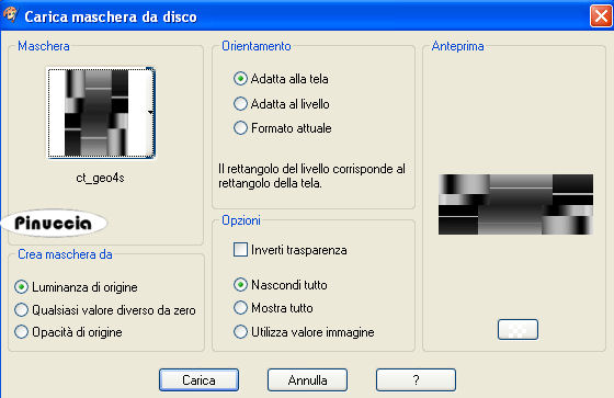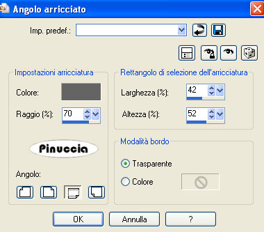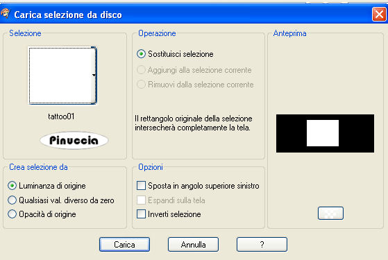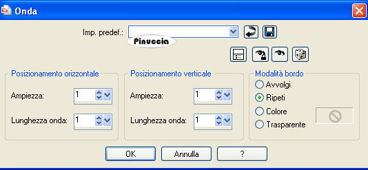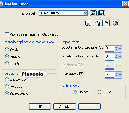 qui puoi trovare qualche risposta ai tuoi dubbi. Se l'argomento che ti interessa non è presente, ti prego di segnalarmelo. Questo tutorial è stato scritto con PSP 9, ma può essere eseguito anche con le altre versioni di PSP. Occorrente: Un tube a scelta. Il resto del materiale qui Metti la maschera ct_geo4s nella cartella Maschere. Metti la selezione "tattoo01" nella cartella Selezioni. Importa il pennello "zz". Vedi alcuni appunti sui pennelli qui Apri il font Kingthings e minimizzalo nella tua area di lavoro. Lo troveria nella lista dei font disponibili quando ti servirà. I tubes che ho usato sono di Gizmodesign, Patry, Wikkedly, e Caro. 1. Imposta il colore di primo piano con un colore chiaro preso dal tube. Imposta il colore di sfondo con un colore scuro preso dal tube. Passa il colore di primo piano a Gradiente di primo piano/sfondo, con i seguenti settaggi: ![]() Apri una nuova immagine trasparente 1024 x 400 pixels, e riempila con il gradiente.Regola>Sfocatura>Sfocatura gaussiana, raggio 25. ![]() Effetti>Effetti di distorsione>Onda: ![]() Effetti>effetti di bordo>Aumenta. 2. Livelli>Carica/Salva maschera>Carica maschera da disco. Cerca e carica la maschera ct_geo4s: ![]() Livelli>Unisci>Unisci gruppo. Livelli>Nuovo livello raster. Livelli>Disponi>Sposta giù. Riempi 3. Attiva il livello superiore. Effetti>Effetti di bordo>Aumenta. ![]() Livelli>Nuovo livello raster. Selezione>Carica/Salva selezione>Carica selezione da disco. Cerca e carica la selezione tattoo01. ![]() Riempi la selezione con il colore scuro di sfondo.Selezione>modifica>contrai, di 2 pixels. Riempi con il gradiente.Regola>Sfocatura>Sfocatura gaussiana, raggio 25. Mantieni selezionato. Livelli>Nuovo livello raster. Attiva lo strumento Pennello ![]() cerca e seleziona il pennello "zz", e applicalo nel rettangolo cliccando con il tasto destro del mouse, per usare il colore di sfondo. Mantieni ancora selezionato. Livelli>Nuovo livello raster. Apri il tube che hai deciso di usare e vai a Modifica>Copia. Torna al tuo lavoro e vai a Modifica>Incolla>Incolla nella selezione. Regola>Messa a fuoco>Metti a fuoco. 4. Selezione>Modifica>Espandi di 2 pixels. Livelli>Unisci>Unisci giù. Ripeti Livelli>Unisci>Unisci giù. Effetti>Effetti di immagine>Angolo arricciato, con i seguenti settaggi, con il colore chiaro di primo piano. ![]() Selezione>Nessuna selezione. ![]() 5. Effetti>Effetti di immagine>Motivo unico. ![]() Abbassa l'opacità al 30%. 6. Chiudi il colore di sfondo. Imposta il colore di primo piano con il colore chiaro. Attiva lo strumento Testo , font Kingthings Pique'n'meex, pennellata 2, vettore,scrivi il tuo testo e posizionalo a destra del rettangolo. Livelli>Converti in livello raster. 7. Apri nuovamente il tube e vai a Modifica>Copia. Torna al tuo lavoro e vai a Modifica>Incolla>Incolla come nuovo livello. Sposta il tube a sinistra.Effetti>Effetti 3D>Sfalsa ombra, con i seguenti settaggi: ![]() Livelli>Unisci>Unisci tutto. Aggiungi il tuo nome e/o il tuo watermark e salva in formato jpg. ![]() ![]() ![]() ![]()