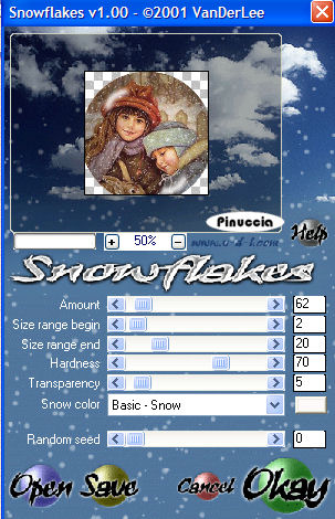 qui puoi trovare qualche risposta ai tuoi dubbi. Se l'argomento che ti interessa non è presente, ti prego di segnalarmelo. Occorrente: Materiale qui Filtro Snowflakes qui Ti servirà anche Animation Shop qui Questo tutorial è composto da due parti. Nella prima imparerai a creare un globo. Nella seconda parte imparerai come usarlo. 1. Apri una nuova immagine trasparente 300 x 300 pixels. Attiva lo strumento Selezione , cerchio.Partendo dal centro dell'immagine, disegna un cerchio. Se devi spostare la selezione, attiva lo strumento Spostamento e poi puoi spostare il cerchio con il tasto destro del mouse. Effetti>Effetti 3D>Pulsante: ![]() Effetti>Effetti 3D>Ritaglio: ![]() Livelli>Nuovo livello raster. Effetti>Effetti 3D>Ritaglio: ![]() Livelli>Nuovo livello raster. Seleziona lo strumento Pennello , arrotondato, dimensione 10 pixels.![]() Imposta il colore di primo piano sul bianco: #ffffff. Traccia due linee curve in alto e in basso, vedi la schermata sotto: ![]() Regola>Sfocatura>Sfocatura gaussiana, raggio 4. ![]() Livelli>Unisci>Unisci visibile. Copia il globo: Modifica>Copia. Clicca con il tasto destro del mouse sullo spazio vuoto e Incolla come nuova immagine. In questo modo avrai l'immagine del globo, senza lo spazio superfluo intorno. Adesso puoi chiudere il primo globo. Salva il nuovo globo in formato PSPimage, così potrai usarlo ancora. 2. Apri l'immagine allegata allo zip. Livelli>Innalza livello di sfondo. Attiva il globo e vai a Modifica>Copia. Torna all'immagine e vai a Modifica>Incolla>Incolla come nuovo livello. Posizionalo sulla parte dell'immagine che vuoi nel tuo globo.![]() Nella paletta dei livelli attiva il livello inferiore (raster 1). Attiva nuovamente lo strumento Selezione , cerchio,e, partendo dal centro del globo, traccia una selezione della stessa dimensione. Attiva lo strumento Spostamento e con il tasto destro del mouse sposta la selezione facendola combaciare al globo.![]() Selezione>Inverti. Clicca sulla tastiera il tasto CANC ![]() Rimarrà soltanto il cerchio con l'immagine. Abbassa l'opacità del livello Raster 1 al 90%. Livelli>Unisci>Unisci visibile. 3. Apri Globebase-electra.psp e vai a Modifica>Copia. Torna al tuo lavoro e vai a Modifica>Incolla>Incolla come nuovo livello. Attiva lo strumento Deformazione ![]() per deformare la base. Se tieni premuto il tasto CTRL, puoi deformare ogni angolo separatamente. Forse sarà necessario cancellare un pezzettino della base. Dipende dalla dimensione del tuo globo. Quando è a posto, chiudi il livello della base (raster 1) nella paletta dei livelli. 4. Seleziona il livello più basso, l'altro è chiuso. Attiva lo strumento selezione , imposta nuovamente cerchio.Partendo dal centro disegna una selezione della stessa dimensione del globo. Puoi spostarlo un po' con il tasto destro del mouse, se necessario (ricordati in questo caso di attivare prima lo strumento Spostamento). Non importa se la selezione è un po' più piccola, non deve assolutamente essere più grande del globo. Selezione>Carica/Salva selezione>Carica selezione su canale alfa. Nomina la selezione "Globo". Selezione>Nessuna selezione. Da questo momento non dovrai assolutamente più muovere il globo!! Duplica il livello uniti 2 volte e chiudi i livelli delle copie. Duplica il livello della base 2 volte e chiudi i livelli delle copie. Rendi visibile il livello Raster 1 (la base) e attiva il livello Uniti (il globo). Selezione>Carica/Salva selezione>Carica selezione da canale alfa. Carica la selezione "Globo". Vedrai la selezione attorno al globo. Effetti>Plugins>vDL Adrenaline - Snowflakes, con i seguenti settaggi: ![]() Clicca Ok. Selezione>Nessuna selezione. Livelli>Unisci>Unisci visibile. Nella paletta dei livelli, rinomina questo livello "Livello A" e chiudilo. 5. Apri la prima copia del livello uniti (globo) e la prima copia del livello della base. Posizionati sul livello del globo. Selezione>Carica/Salva selezione>Carica selezione da canale alfa. Carica la selezione "Globo". Adesso vedrai nuovamente la selezione intorno al globo. Effetti>Plugins>VDL Adrenaline - Snowflakes, con i settaggi precedenti, cambia soltanto Random Seed a 2000. Clicca Ok. Selezione>Nessuna selezione. Livelli>Unisci>Unisci visibile. Rinomina questo livello "Livello B" e chiudilo. Apri la seconda copia del livello con la base e apri e attiva la seconda copia del livello uniti (globo). Carica/Salva selezione>Carica selezione da canale alfa. Carica la selezione "Globo". Ancora una volta vedrai la selezione attorno al globo. Effetti>Plugins>VDL Adrenaline, Snowflakes, cambia soltanto Random Seed a 4000. Clicca ok. Selezione>Nessuna selezione. Livelli>Unisci>Unisci visibile. Rinomina questo livello "Livello C". Visualizza tutti e tre i livelli e seleziona il livello A. Se c'è dello spazio superfluo attorno al globo, usa lo strumento Ritaglio ![]() 6. Salva il tuo lavoro in formato psp. Apri Animation Shop. Clicca su Animazione guidata ![]() Nella successiva sequenza delle finestre, seleziona: .Stessa dimensione - avanti. .Trasparente - avanti. .Al centro e con il colore della tela - avanti. .Sì, ripeti e 20 secondi - avanti. .Aggiungi immagine e cerca l'immagine (deve essere PSP Image) che hai salvato .Apri - avanti .Fine. Cliccando su Visualizza puoi vedere il risultato della tua animazione.File>Salva come... scegli un nome e seleziona una cartella dove conservare il tuo file. Se hai problemi o dubbi, o trovi un link non funzionante, o anche soltanto per un saluto, scrivimi 2 Maggio 2007 |