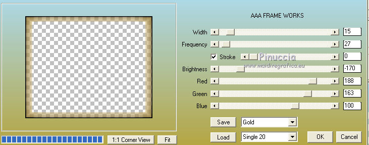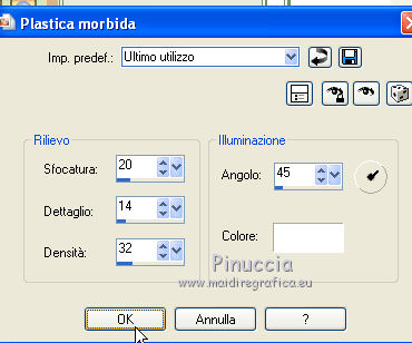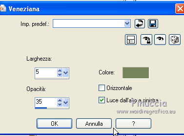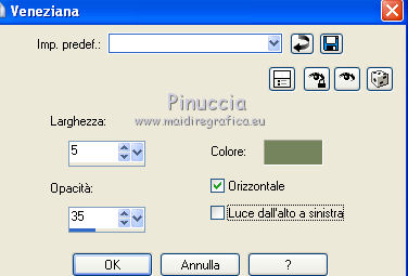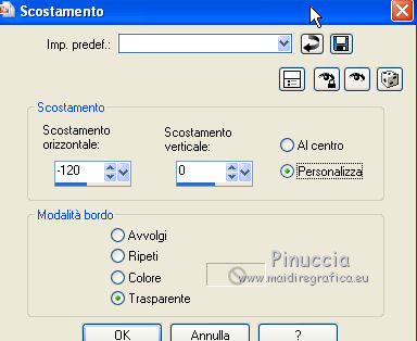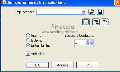 qui puoi trovare qualche risposta ai tuoi dubbi. Se l'argomento che ti interessa non č presente, ti prego di segnalarmelo. Per tradurre questo tutorial ho usato PSP X. Questo tutorial č una creazione di ŠTitoune e non puō essere copiato su altri siti nč essere offerto per il download. Lo stesso vale per la mia traduzione. Grazie ai creatori dei tubes che mettono a disposizione il loro lavoro in vari gruppi di condivisione. Rispetta il lavoro degli autori, non cambiare il nome del file e non cancellare il watermark. Occorrente: Un tube a scelta. Il resto del materiale qui Il tube utilizzato č di Guismo. Filtri Simple - Pizza Slice Mirror qui AAA Frames - AAA Frame Works qui ![]() 1. Apri una nuova immagine trasparente 750 x 600 pixels. Selezione>Seleziona tutto. 2. Apri l'immagine "BEACHF-1" e vai a Modifica>Copia. Torna al tuo lavoro e vai a Modifica>Incolla nella selezione. Selezione>Deseleziona. Livelli>Duplica. 3. Immagine>Ridimensiona, al 90%, tutti i livelli non selezionato. Selezione>Seleziona tutto. Selezione>Mobile. Selezione>Immobilizza. 4. Attiva il livello Raster 1. Selezione>Inverti. Selezione>Innalza selezione a livello. 5. Regola>Sfocatura>Sfocatura gaussiana - raggio 45. ![]() 6. Effetti>Effetti di trama>Veneziana - colore #76845e. ![]() 7. Di nuovo Effetti>Effetti di trama>Veneziana - colore #76845e. ![]() 8. Effetti>Plugins>AAA Frames - AAA Frame Works. ![]() Selezione>Inverti. Attiva nuovamente il livello superiore. 9. Selezione>Modifica>Seleziona bordature selezione. ![]() Selezione>Innalza selezione a livello. 10. Effetti>Effetti di trama>Plastica morbida. ![]() Effetti>Effetti di bordo>Aumenta di pių. 11. Effetti>Effetti 3D>Sfalsa ombra, con il colore #385064. ![]() Ripeti l'Effetto Sfalsa ombra, cambiando verticale e orizzontale con -3. Selezione>Deseleziona. Livelli>Duplica. 12. Effetti>Plugins>Simple - Pizza Slice Mirror. 13. Effetti>Effetti di immagine>Scostamento. ![]() 14. Effetti>Effetti di riflesso>Specchio rotante. ![]() 15. Apri l'elemento Wolken e vai a Modifica>Copia. Torna al tuo lavoro e vai a Modifica>Incolla come nuovo livello. Spostalo in alto, come nell'esempio.![]() Nessuno Sfalsa ombra. 16. Apri l'element Water e vai a Modifica>Copia. Torna al tuo lavoro e vai a Modifica>Incolla come nuovo livello. Spostalo al centro, come nell'esempio.![]() 17- Apri l'elemento f4e09a82 e vai a Modifica>Copia. Torna al tuo lavoro e vai a Modifica>Incolla come nuovo livello. Sposta l'elemento in alto a destra.Vedi l'esempio finale. Niente Sfalsa ombra. 18. Apri l'elemento 0_94156_ed488fb9_L e vai a Modifica>Copia. Torna al tuo lavoro e vai a Modifica>Incolla come nuovo livello. Sposta l'elemento in basso a destra.Vedi l'esempio finale. 19. Effetti>Effetti 3D>Sfalsa ombra, con i settaggi precedenti. 20. Apri l'elemento Boot e vai a Modifica>Copia. Torna al tuo lavoro e vai a Modifica>Incolla come nuovo livello. Sposta il nastro in basso a sinistra.Vedi l'esempio finale. 21. Effetti>Effetti 3D>Sfalsa ombra, con i settaggi precedenti. 22. Apri l'elemento Grashalmen e vai a Modifica>Copia. Torna al tuo lavoro e vai a Modifica>Incolla come nuovo livello. Sposta l'elemento in basso a sinistra.Vedi l'esempio finale. 23. Effetti>Effetti 3D>Sfalsa ombra, con i settaggi precedenti. Livelli>Duplica. Immagine>Rifletti. 24. Apri l'elemento CG_SD sea_byPalvinka designs_elem01 e vai a Modifica>Copia. Torna al tuo lavoro e vai a Modifica>Incolla come nuovo livello. Sposta l'elemento in alto a sinistra,come nel mio esempio. Effetti>Effetti 3D>Sfalsa ombra, con i settaggi precedenti. 25. Apri il tuo tube e vai a Modifica>Copia. Torna al tuo lavoro e vai a Modifica>Incolla come nuovo livello. Immagine>Ridimensiona, se e quanto necessario. Posiziona il tube come preferisci.Effetti>Effetti 3D>Sfalsa ombra, con i settaggi precedenti. Firma il tuo lavoro. Livelli>Unisci>Unisci tutto e salva in formato jpg. ![]() Se hai problemi o dubbi, o trovi un link non funzionante, o anche soltanto per un saluto, scrivimi. 29 Agosto 2012 |