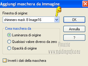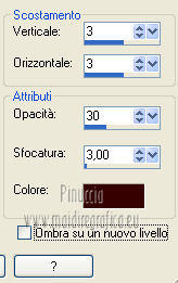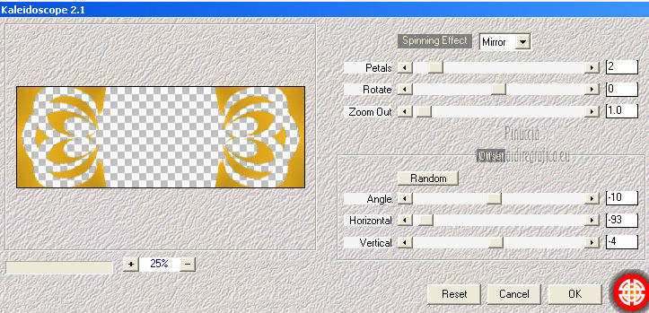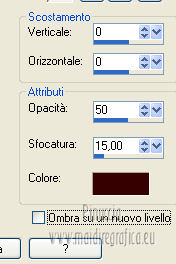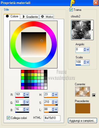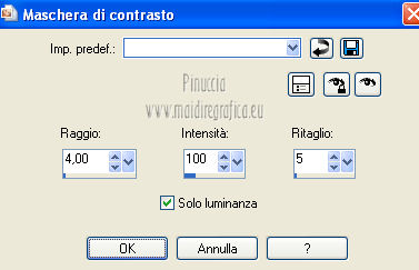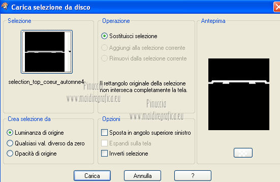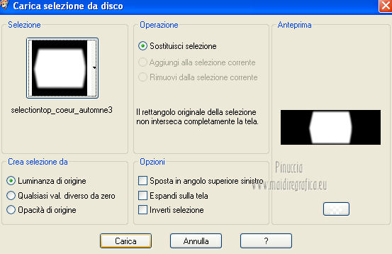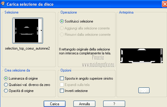 qui puoi trovare qualche risposta ai tuoi dubbi. Se l'argomento che ti interessa non è presente, ti prego di segnalarmelo. Per tradurre questo tutorial ho usato PSP X. Questo tutorial è una creazione di ©Titoune e non può essere copiato su altri siti nè essere offerto per il download. Lo stesso vale per la mia traduzione. Grazie ai creatori dei tubes che mettono a disposizione il loro lavoro in vari gruppi di condivisione. Rispetta il lavoro degli autori, non cambiare il nome del file e non cancellare il watermark. Occorrente: Un tube a scelta. Il resto del materiale qui Il tube utilizzato è di Monro. Filtri: Simple - Diamonds qui Simple - Left Right Wrap (bonus) qui Flaming Pear - Flexify 2 qui Graphics Plus - Cross Shadow qui Penta.com - Jeans qui Mehdi - Kaleidoscope 2.1 qui ![]() Metti la trama "clouds2" nella cartella Trame. Apri la maschera "shimmers mask 8 Image16" in PSP e minimizzala con il resto del materiale. 1. Imposta il colore di primo piano con il colore scuro #a15d10, e il colore di sfondo con il colore chiaro #d8a21c. 2. Apri una nuova immagine trasparente 1280 x 450 pixels, e riempila con il colore di sfondo.Livelli>Duplica. Chiudi momentaneamente il livello inferiore, e rimani posizionato sul livello della copia. 3. Immagine>Ridimensiona, all'85%, tutti i livelli non selezionato. 4. Effetti>Plugins>Simple - Diamonds. Di nuovo Immagine>Ridimensiona, all'85%, tutti i livelli non selezionato. Effetti>Effetti di bordo>Aumenta. 5. Effetti>Effetti di immagine>Scostamento. ![]() 6. Effetti>Plugins>Flaming pear - Flexify 2. ![]() 7. Effetti>Plugins>Graphics plus - Cross Shadow. ![]() Effetti>Plugins>Simple - Left Right Wrap. 8. Effetti>Plugins>Mehdi - Kaleidoscope 2.1. ![]() 9. Effetti>Effetti 3D>Sfalsa ombra, con il colore #380102. ![]() Ripeti l'Effetto Sfalsa ombra, cambiando verticale e orizzontale con -3. Rinomina questo livello "Flexify 2". 10. Selezione>Carica/Salva selezione>Carica selezione da disco. Cerca e crica la selezione "selection_top_coeur_automne". ![]() Selezione>Modifica>Contrai - 3 pixels. 11. Apri la paletta del colore di primo piano e, nella parte destra, seleziona Trame. Cerca e seleziona la trama Clouds2, con i seguenti settaggi. ![]() 12. Riempi la selezione con questo colore+trama,cliccando due volte. Selezione>Deseleziona. 13. Riapri e attiva il livello Raster 1. Livelli>Nuovo livello raster. Riempi con il colore+trama,cliccando una sola volta. Abbassa l'opacità di questo livello al 75%. 14. Attiva nuovamente il livello Raster 1. Selezione>Carica/Salva selezione>Carica selezione da disco. Cerca e crica la selezione "selection_top_coeur_automne2". ![]() Selezione>Innalza selezione a livello. Livelli>Disponi>Porta in alto. Selezione>Modifica>Contrai - 2 pixels. Riempi la selezione con il colore+trama,cliccando 2 volte. Selezione>Deseleziona. Effetti>Effetti 3D>Sfalsa ombra, con i settaggi precedenti. 15. Attiva il livello "flexify". Selezione>Carica/Salva selezione>Carica selezione da disco. Cerca e crica la selezione "selection_top_coeur_automne3". ![]() Livelli>Nuovo livello raster. Livelli>Disponi>Sposta giù. 16. Apri l'immagine del paesaggio beautiful-autumn-garden-wallpaper. Livelli>Nuovo livello maschera>Da immagine. Apri il menu sotto la finestra di origine e vedrai la lista dei files aperti. Seleziona la maschera "shimmers mask 8 Image16" con i seguenti settaggi. ![]() Livelli>Unisci>Unisci gruppo. Modifica>Copia. Torna al tuo top e vai a Modifica>Incolla nella selezione. Selezione>Deseleziona. 17. Regola>Messa a fuoco>Maschera di contrasto. ![]() 18. Attiva il livello superiore. Apri l'elemento bordure_04 e vai a Modifica>Copia. Torna al tuo lavoro e vai a Modifica>Incolla come nuovo livello. Non spostarlo. Effetti>Effetti 3D>Sfalsa ombra, con i settaggi precedenti. 19. Apri il tuo tube e vai a Modifica>Copia. Torna al tuo lavoro e vai a Modifica>Incolla come nuovo livello. Immagine>Ridimensiona, se e quanto necessario, tutti i livelli non selezionato. Spostalo a sinistra.Vedi il risultato finale. Effetti>Effetti 3D>Sfalsa ombra, con il colore #380102. ![]() 21. Attiva il livello Raster 1. Selezione>Seleziona tutto. Immagine>Ritaglia la selezione. 22. Immagine>Dimensioni tela - 1280 x 1500 pixels. ![]() 23. Livelli>Nuovo livello raster. Livelli>Disponi>Sposta giù. Riempi con il colore di sfondo.24. Attiva lo strumento Selezione ,clicca sull'icona Selezione personalizzata ![]() e imposta i seguenti settaggi: ![]() Selezione>Innalza selezione a livello. Livelli>Disponi>Porta in alto. 25. Selezione>Modifica>Contrai - 1 pixels. Riempi con il colore di primo piano+trama.Effetti>Plugins>Penta.com - Jeans, con i settaggi standard. ![]() Selezione>Deseleziona. 26. Effetti>Effetti 3D>Sfalsa ombra, con il colore #380102. ![]() 27. Attiva il livello inferiore. Selezione>Carica/Salva selezione>Carica selezione da disco. Cerca e crica la selezione "selection_top_coeur_automne4". ![]() Selezione>Innalza selezione a livello. Selezione>Modifica>Contrai - 2 pixels. Riempi con il colore di primo piano+trama,cliccando due volte. Selezione>Deseleziona. Effetti>Effetti 3D>Sfalsa ombra, con i settaggi precedenti. 29. Apri il tube douceur e vai a Modifica>Copia. Torna al tuo lavoro e vai a Modifica>Incolla come nuovo livello. Livelli>Disponi>Porta in alto. Sposta il tube come nel mio esempio.Aggiungi il tuo nome e/o il tuo watermark su un nuovo livello. Livelli>Unisci>Unisci tutto e salva in formato jpg. ![]() Se hai problemi o dubbi, o trovi un link non funzionante, o anche soltanto per un saluto, scrivimi. 22 Novembre 2012 |
