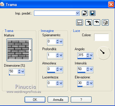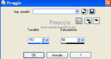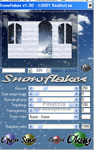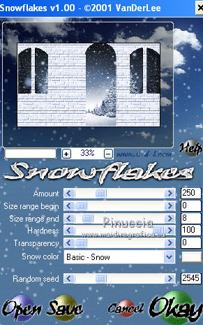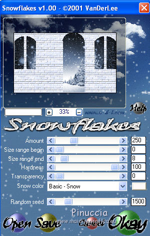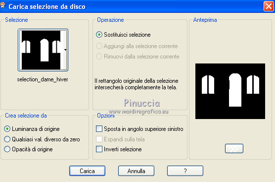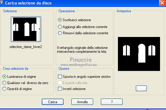 qui puoi trovare qualche risposta ai tuoi dubbi. Se l'argomento che ti interessa non è presente, ti prego di segnalarmelo. Per tradurre questo tutorial ho usato PSP X. Questo tutorial è una creazione di ©Titoune e non può essere copiato su altri siti nè essere offerto per il download. Lo stesso vale per la mia traduzione. Il materiale viene da vari gruppi di condivisione. Il copyright appartiene ai rispettivi autori. Grazie ai creatori dei tubes che mettono a disposizione il loro lavoro in vari gruppi di condivisione. Rispetta il lavoro degli autori, non cambiare il nome del file e non cancellare il watermark. Occorrente: Materiale qui Il tube utilizzato è di Candice. Gli elementi scrap sono una creazione di Cajoline http://cajoline-scrap.blogspot.com/ Filtri: consulta, se necessario, la mia sezione filtri qui VDL Adrenaline - Snowflakes qui Animation Shop qui ![]() Metti la selezione nella cartella Selezioni. 1. Apri una nuova immagine trasparente 750 x 600 pixels. Selezione>Seleziona tutto. 2. Apri la trama cajoline_bluedreamswinter_freebie_pap4 e vai a Modifica>Copia. Torna al tuo lavoro e vai a Modifica>Incolla nella selezione. 3. Attiva lo strumento Selezione ,clicca sull'icona Selezione personalizzata ![]() e imposta i seguenti settaggi: ![]() 4. Livelli>Nuovo livello raster. Apri la trama "texture" e vai a Modifica>Copia. Torna al tuo lavoro e vai a Modifica>Incolla nella selezione. 5. Regola>Aggiungi/Rimuovi disturbo>Aggiungi disturbo. ![]() Selezione>Inverti. 6. Attiva il livello Raster 1. Effetti>Effetti di trama>Trama - seleziona la trama Mattoni con i seguenti settaggi. ![]() Selezione>Deseleziona. 7. Apri il tube cajoline_bluedreamswinter_freebie_3 e vai a Modifica>Copia. Torna al tuo lavoro e vai a Modifica>Incolla come nuovo livello. 8. Effetti>Effetti di immagine>Scostamento. ![]() 9. Effetti>Effetti di riflesso>Specchio rotante. ![]() 10. Apri il tube cajoline_bluedreamswinter_freebie_2 e vai a Modifica>Copia. Torna al tuo lavoro e vai a Modifica>Incolla come nuovo livello. 11. Effetti>Effetti di immagine>Scostamento. ![]() Livelli>Unisci>Unisci giù. 12. Selezione>Carica/Salva selezione>Carica selezione da disco. Cerca e carica la selezione selection_dame_hiver. ![]() 13. Attiva il livello sottostante e premi sulla tastiera il tasto CANC. 14. Apri l'immagine free-charming-white-christmas-wallpaper_1024x768_88046. 15. Regola>Tonalità e saturazione>Viraggio. ![]() Modifica>Copia. Torna al tuo lavoro e vai a Modifica>Incolla nella selezione. Selezione>Deseleziona. Rinomina questo livello "animazione". 16. Attiva il livello superiore (finestre e porte). Effetti>Effetti 3D>Sfalsa ombra, con il colore #030418. ![]() Ripeti l'Effetto Sfalsa ombra, cambiando verticale e orizzontale con -1. 17. Apri il tube cajoline_bluedreamswinter_freebie_12 e vai a Modifica>Copia. Torna al tuo lavoro e vai a Modifica>Incolla come nuovo livello. 18. Effetti>Effetti di immagine>Scostamento. ![]() 19. Effetti>Effetti di riflesso>Specchio rotante, con i settaggi precedeti. (niente Sfalsa ombra). 20. Apri il tube cajoline_bluedreamswinter_freebie_8 e vai a Modifica>Copia. Torna al tuo lavoro e vai a Modifica>Incolla come nuovo livello. 21. Effetti>Effetti di immagine>Scostamento. ![]() 22. Effetti>Effetti di riflesso>Specchio rotante, con i settaggi precedeti. 23. Effetti>Effetti 3D>Sfalsa ombra, con il colore #030418. ![]() 24. Apri il tube bannière dame hiver. Modifica>Copia Unione. se vuoi scrivere un tuo testo sulla striscia, prima di Copia Unione, nascondi il livello con il testo Torna al tuo lavoro e vai a Modifica>Incolla come nuovo livello. 25. Effetti>Effetti di immagine>Scostamento. ![]() 26. Effetti>Effetti 3D>Sfalsa ombra, con i settaggi precedenti. 27. Apri il tube cajoline_Christmas MIX 7_EL4 e vai a Modifica>Copia. Torna al tuo lavoro e vai a Modifica>Incolla come nuovo livello. Immagine>Rifletti. 28. Regola>Tonalità e saturazione>Viraggio, con i settaggi precedenti. Spostalo in basso a sinistra, o dove preferisci.29. Effetti>Effetti 3D>Sfalsa ombra, con i settaggi precedenti. 30. Apri il tube cajoline_Christmas MIX 7_EL1 e vai a Modifica>Copia. Torna al tuo lavoro e vai a Modifica>Incolla come nuovo livello. 31. Regola>Tonalità e saturazione>Viraggio, con i settaggi precedenti. Spostalo in basso a destra, o dove preferisci.32. Effetti>Effetti 3D>Sfalsa ombra, con i settaggi precedenti. 33. Apri il tube cajoline_Christmas MIX 7_EL2 e vai a Modifica>Copia. Torna al tuo lavoro e vai a Modifica>Incolla come nuovo livello. Immagine>Rifletti. 34. Regola>Tonalità e saturazione>Viraggio, con i settaggi precedenti. Spostalo in basso a destra sulla gabbietta.![]() 35. Effetti>Effetti 3D>Sfalsa ombra, con i settaggi precedenti. 36. Apri il tube cajoline_bluedreamswinter_freebie_21 e vai a Modifica>Copia. Torna al tuo lavoro e vai a Modifica>Incolla come nuovo livello. 37. Regola>Tonalità e saturazione>Viraggio, con i settaggi precedenti. Immagine>Ruota per gradi - 90 gradi a sinistra. ![]() Spostalo in basso, o dove preferisci.38. Effetti>Effetti 3D>Sfalsa ombra, con i settaggi precedenti. 39. Apri il tube cajoline_bluedreamswinter_freebie_24 e vai a Modifica>Copia. Torna al tuo lavoro e vai a Modifica>Incolla come nuovo livello. Spostalo in basso a destra, o dove preferisci.40. Effetti>Effetti 3D>Sfalsa ombra, con i settaggi precedenti. 41. Apri il tube Tube_Femme_Noel_13_Candice e vai a Modifica>Copia. Torna al tuo lavoro e vai a Modifica>Incolla come nuovo livello. 42. Immagine>Ridimensiona, al 55%, tutti i livelli non selezionato. Spostalo come nel mio esempio.43. Effetti>Effetti 3D>Sfalsa ombra, con i settaggi precedenti. 44. Apri il tube cajoline_Christmas MIX 7_EL10 e vai a Modifica>Copia. Torna al tuo lavoro e vai a Modifica>Incolla come nuovo livello. 45. Regola>Tonalità e saturazione>Viraggio, con i settaggi precedenti. Immagine>Ruota per gradi - 90 gradi a sinistra. ![]() Spostalo sulla mano della donna.46. Effetti>Effetti 3D>Sfalsa ombra, con i settaggi precedenti. 47