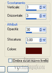 qui puoi trovare qualche risposta ai tuoi dubbi. Se l'argomento che ti interessa non è presente, ti prego di segnalarmelo. Per tradurre questo tutorial ho usato PSP X. Questo tutorial è una creazione di ©Titoune e non può essere copiato su altri siti nè essere offerto per il download. Lo stesso vale per la mia traduzione. Grazie ai creatori dei tubes che mettono a disposizione il loro lavoro in vari gruppi di condivisione. Rispetta il lavoro degli autori, non cambiare il nome del file e non cancellare il watermark. Occorrente: Un tube a scelta. Il resto del materiale qui Gli elementi scrap sono una creazione http://scrapbokingmarzeny.blogspot.it/ Marzeny ![]() 1. Apri una nuova immagine trasparente 750 x 600 pixels. Selezione>Seleziona tutto. 2. Apri l'elemento autumndreams_marzena e vai a Modifica>Copia. Torna al tuo lavoro e vai a Modifica>Incolla nella selezione. Selezione>Modifica>Contrai - 30 pixels. Selezione>Inverti. Selezione>Innalza selezione a livello. 3. Effetti>Effetti 3D>Smusso a incasso. ![]() Selezione>Deseleziona. 4. Livelli>Duplica. Immagine>Ridimensiona, al 95%, tutti i livelli non selezionato. Livelli>Unisci>Unisci giù. 5. Attiva lo strumento Bacchetta magica , sfumatura e tolleranza 0,e clicca al centro della cornice per selezionarla. Selezone>Modifica>Espandi - 5 pixels. Livelli>Nuovo livello raster. Livelli>Disponi>Sposta giù. 6. Apri l'immagine paysage 15_oct_08___074_automne e vai a Modifica>Copia. Torna al tuo lavoro e vai a Modifica>Incolla nella selezione. Selezione>Deseleziona. 7. Attiva il livello superiore del bordo. Effetti>Effetti 3D>Sfalsa ombra, con il colore #510800. ![]() Ripeti l'Effetto Sfalsa ombra, cambiando verticale e orizzontale con -3. 8. Apri l'elemento autumndreams_marzena.designs_el37 e vai a Modifica>Copia. Torna al tuo lavoro e vai a Modifica>Incolla come nuovo livello. Spostalo in basso a destra.Vedi l'esempio finale. Effetti>Effetti 3D>Sfalsa ombra, con i settaggi precedenti. 9. Apri l'elemento autumndreams_marzena.designs_el40 e vai a Modifica>Copia. Torna al tuo lavoro e vai a Modifica>Incolla come nuovo livello. Spostalo in basso a sinistra.Vedi l'esempio finale. Effetti>Effetti 3D>Sfalsa ombra, con i settaggi precedenti. 10. Apri l'elemento autumndreams_marzena.designs_el17 e vai a Modifica>Copia. Torna al tuo lavoro e vai a Modifica>Incolla come nuovo livello. 11. Effetti>Effetti di riflesso>Specchio rotante. ![]() 12. Effetti>Effetti di immagine>Scostamento. ![]() Effetti>Effetti 3D>Sfalsa ombra, con i settaggi precedenti. 13. Apri l'elemento autumndreams_marzena.designs_el1 e vai a Modifica>Copia. Torna al tuo lavoro e vai a Modifica>Incolla come nuovo livello. Spostalo in alto a sinistra.![]() Livelli>Duplica. Passa la modalità di miscelatura di questo livello in Luce diffusa. 14. Attiva il livello originale. Effetti>Effetti 3D>Sfalsa ombra, con i settaggi precedenti. 15. Apri l'elemento autumndreams_marzena.designs_el12 e vai a Modifica>Copia. Torna al tuo lavoro e vai a Modifica>Incolla come nuovo livello. Spostalo nell'angolo in alto a sinistra.Vedi l'esempio finale. Effetti>Effetti 3D>Sfalsa ombra, con i settaggi precedenti. 16. Apri l'elemento autumndreams_marzena.designs_el52 e vai a Modifica>Copia. Torna al tuo lavoro e vai a Modifica>Incolla come nuovo livello. Immagine>Capovolgi. Immagine>Rifletti. Spostalo in alto a destra.![]() Effetti>Effetti 3D>Sfalsa ombra, con i settaggi precedenti. 17. Apri l'elemento autumndreams_marzena.designs_el29 e vai a Modifica>Copia. Torna al tuo lavoro e vai a Modifica>Incolla come nuovo livello. Immagine>Capovolgi. Immagine>Rifletti. Spostalo a sinistra.Effetti>Effetti 3D>Sfalsa ombra, con i settaggi precedenti. Livelli>Duplica. Immagine>Capovolgi. 18. Apri l'elemento autumndreams_marzena.designs_WA3 e vai a Modifica>Copia. Torna al tuo lavoro e vai a Modifica>Incolla come nuovo livello. Spostalo in alto a sinistra.Vedi l'esempio finale. Effetti>Effetti 3D>Sfalsa ombra, con i settaggi precedenti. 19. Apri il tube vsc_kjb_kathywilburn_pudgypals11stella2 e vai a Modifica>Copia. Torna al tuo lavoro e vai a Modifica>Incolla come nuovo livello. Spostalo in basso a sinistra.Vedi l'esempio finale. Effetti>Effetti 3D>Sfalsa ombra, con i settaggi precedenti. 20. Apri il tube 7 oiseau e vai a Modifica>Copia. Torna al tuo lavoro e vai a Modifica>Incolla come nuovo livello. Spostalo a sinistra, su uno dei pali.![]() Effetti>Effetti 3D>Sfalsa ombra, con i settaggi precedenti. 21. Apri il tuo tube e vai a Modifica>Copia. Torna al tuo lavoro e vai a Modifica>Incolla come nuovo livello. Immagine>Ridimensiona, se e quanto necessario, tutti i livelli non selezionato. Posiziona il tube come preferisci,o vedi il mio esempio. Effetti>Effetti 3D>Sfalsa ombra, con i settaggi precedenti. Firma il tuo lavoro. Livelli>Unisci>Unisci tutto e salva in formato jpg. ![]() Se hai problemi o dubbi, o trovi un link non funzionante, o anche soltanto per un saluto, scrivimi. 20 Ottobre 2012 |