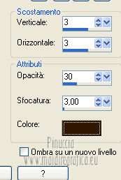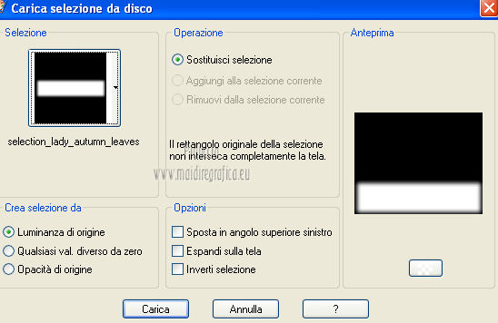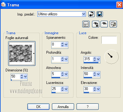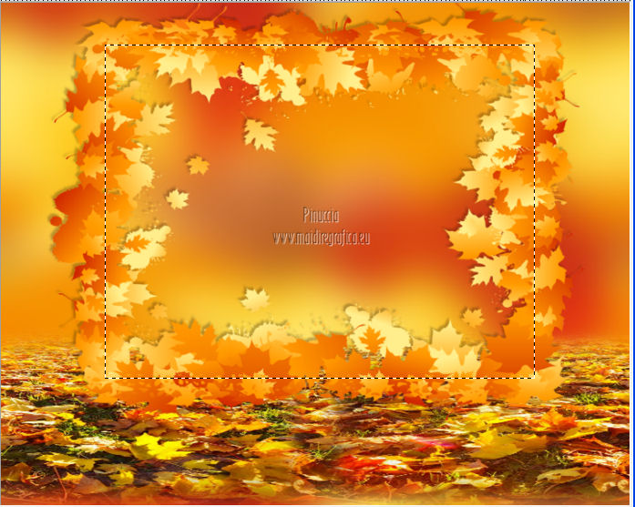 qui puoi trovare qualche risposta ai tuoi dubbi. Se l'argomento che ti interessa non è presente, ti prego di segnalarmelo. Per tradurre questo tutorial ho usato PSP X. Questo tutorial è una creazione di ©Titoune e non può essere copiato su altri siti nè essere offerto per il download. Lo stesso vale per la mia traduzione. Grazie ai creatori dei tubes che mettono a disposizione il loro lavoro in vari gruppi di condivisione. Rispetta il lavoro degli autori, non cambiare il nome del file e non cancellare il watermark. Occorrente: Un tube a scelta. Il resto del materiale qui Filtri Simple - Left Right Wrap (bonus) qui ![]() La trama Corel_15_048 è standard nelle versioni più recenti di PSP e corrisponde alla trama standard Foglie autunnali delle precedenti versioni. Se non la trovi nel tuo PSP metti quella fornita nella cartella Trame. Metti la selezione "selection_lady_autumn_leaves" nella cartella Selezioni. 1. Apri una nuova immagine trasparente 750 x 600 pixels. Selezione>Seleziona tutto. 2. Apri tuile_lady_autumn_leaves e vai a Modifica>Copia. Torna al tuo lavoro e vai a Modifica>Incolla nella selezione. Selezione>Deseleziona. 3. Regola>Sfocatura>Sfocatura gaussiana - raggio 25. ![]() 4. Selezìone>Carica/Salva selezione>Carica selezione da disco. Cerca e carica la selezione "selection_lady_autumn_leaves". ![]() 5. Livelli>Nuovo livello raster. Apri l'immagine titoune_tapis_feuilles e vai a Modifica>Copia. Torna al tuo lavoro e vai a Modifica>Incolla nella selezione. Selezione>Deseleziona. Livelli>Duplica. Effetti>Plugins>Simple - Left Right Wrap. Livelli>Unisci>Unisci giù. Rinomina questo livello "tappeto di foglie". 6. Apri l'elemento frame_07 e vai a Modifica>Copia. Torna al tuo lavoro e vai a Modifica>Incolla come nuovo livello. 7. Effetti>Effetti di immagine>Scostamento. ![]() Nessun Effetto Sfalsa ombra. 8. Attiva lo strumento Selezione , rettangolo,e traccia una selezione intorno alla cornice. ![]() Livelli>Nuovo livello raster. Livelli>Disponi>Sposta giù. 9. Apri l'immagine Alan_Giana-NatureOnward e vai a Modifica>Copia. Torna al tuo lavoro e vai a Modifica>Incolla nella selezione. Selezione>Deseleziona. Cambia la modalità di miscelatura di questo livello in Luce diffusa. Livelli>Duplica. Attiva il livello superiore. 10. Apri l'elemento WoodlandRealmFlowerFencebyHW e vai a Modifica>Copia. Torna al tuo lavoro e vai a Modifica>Incolla come nuovo livello. Effetti>Plugins>Simple - Left Right Wrap. 11. Effetti>Effetti di immagine>Scostamento. ![]() 12. Effetti>Effetti 3D>Sfalsa ombra, con il colore #311603. ![]() Ripeti l'Effetto Sfalsa ombra, cambiando verticale e orizzontale con -3. Rinomina questo livello "steccato". 13. Apri l'elemento WoodlandRealmFlower3 e vai a Modifica>Copia. Torna al tuo lavoro e vai a Modifica>Incolla come nuovo livello. Spostalo a sinistra,Livelli>Disponi>Sposta giù. ![]() 14. Effetti>Effetti di riflesso>Specchio rotante. ![]() Effetti>Effetti 3D>Sfalsa ombra, con i settaggi precedenti. 15. Attiva il livello Raster 1. Apri il tube titoune_arcade_lady_autumn_leaves e vai a Modifica>Copia. Torna al tuo lavoro e vai a Modifica>Incolla come nuovo livello. Effetti>Effetti 3D>Sfalsa ombra, con i settaggi precedenti. 16. Attiva il livello superiore. Apri l'elemento Autumn_Element8 e vai a Modifica>Copia. Torna al tuo lavoro e vai a Modifica>Incolla come nuovo livello. Spostalo a sinistra,vedi l'esempio finale. Livelli>Disponi>Sposta giù. Effetti>Effetti 3D>Sfalsa ombra, con i settaggi precedenti. 17. Apri l'elemento Autumn_Element47 e vai a Modifica>Copia. Torna al tuo lavoro e vai a Modifica>Incolla come nuovo livello. Livelli>Disponi>Porta in alto. Spostalo in basso a sinistra.Vedi l'esempio finale. Effetti>Effetti 3D>Sfalsa ombra, con i settaggi precedenti. 18. Apri l'elemento Autumn_Element27 e vai a Modifica>Copia. Torna al tuo lavoro e vai a Modifica>Incolla come nuovo livello. Sposta anche questo elemento a sinistra.Vedi l'esempio finale. Effetti>Effetti 3D>Sfalsa ombra, con i settaggi precedenti. 19. Apri l'elemento Autumn_Element24 e vai a Modifica>Copia. Torna al tuo lavoro e vai a Modifica>Incolla come nuovo livello. Spostalo a sinistra.![]() Effetti>Effetti 3D>Sfalsa ombra, con i settaggi precedenti. 20. Apri l'elemento Autumn_Element31 e vai a Modifica>Copia. Torna al tuo lavoro e vai a Modifica>Incolla come nuovo livello. Spostalo in basso a destra.Vedi l'esempio finale. Effetti>Effetti 3D>Sfalsa ombra, con i settaggi precedenti. 21. Attiva il livello "steccato". Apri l'elemento Autumn_Element7 e vai a Modifica>Copia. Torna al tuo lavoro e vai a Modifica>Incolla come nuovo livello. Spostalo a destra.![]() Livelli>Disponi>Sposta giù. Effetti>Effetti 3D>Sfalsa ombra, con i settaggi precedenti. 22. Apri l'elemento Autumn_Element23 e vai a Modifica>Copia. Torna al tuo lavoro e vai a Modifica>Incolla come nuovo livello. Spostalo a destra.Vedi l'esempio finale. Effetti>Effetti 3D>Sfalsa ombra, con i settaggi precedenti. 23. Apri il tuo tube e vai a Modifica>Copia. Torna al tuo lavoro e vai a Modifica>Incolla come nuovo livello. Immagine>Ridimensiona, se e quanto necessario. Spostalo dove preferisci o vedi il mio esempio.Effetti>Effetti 3D>Sfalsa ombra, con i settaggi precedenti. 24. Attiva il livello Raster 1. Modifica>Copia. Selezione>Seleziona tutto. Immagine>Ritaglia la selezione. 25. Selezione>Seleziona tutto. Immagine>Dimensioni tela - 800 x 650 pixels. ![]() Livelli>Nuovo livello raster. Livelli>Disponi>Sposta giù. Selezione>Seleziona tutto. Modifica>Incolla nella selezione. 26. Effetti>Effetti di trama>Trama - seleziona la trama "Corel_15_048" o Foglie autunnali, con i seguenti settaggi. ![]() Selezione>Deseleziona. 27. Attiva il livello superiore. Apri il tube titoune_cadre_lady_autumn_leaves e vai a Modifica>Copia. Torna al tuo lavoro e vai a Modifica>Incolla come nuovo livello. Nessun Effetto Sfalsa ombra. 28. Apri il tube titoune_coins_lady_autumn_leaves e vai a Modifica>Copia. Torna al tuo lavoro e vai a Modifica>Incolla come nuo