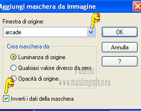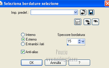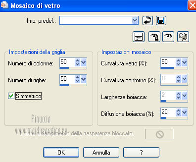 qui puoi trovare qualche risposta ai tuoi dubbi. Se l'argomento che ti interessa non č presente, ti prego di segnalarmelo. Per tradurre questo tutorial ho usato PSP X. Questo tutorial č una creazione di ŠTitoune e non puō essere copiato su altri siti nč essere offerto per il download. Lo stesso vale per la mia traduzione. Grazie ai creatori dei tubes che mettono a disposizione il loro lavoro in vari gruppi di condivisione. Rispetta il lavoro degli autori, non cambiare il nome del file e non cancellare il watermark. Occorrente: Materiale qui Il tube č di ClaudiaViza Filtri Simple - Left Right Wrap (bonus) qui Simple - Zoom out and flip qui Filter Factory Gallery M - Loom qui Graphics Plus - Cross Shadow qui ![]() Apri la maschera in PSP e minimizzala con il resto del materiale. 1. Imposta il colore di primo piano con #cb9f0e, e il colore di sfondo con #a00e00. Passa il colore di primo piano a Gradiente, stile Sprazzo di luce. ![]() Apri una nuova immagine trasparente 750 x 600 pixels, e riempila con il gradiente.3. Livelli>Duplica. Immagine>Ridimensiona, all'85%, tutti i livelli non selezionato. Effetti>Effetti di bordo>Aumenta. 4. Livelli>Nuovo livello maschera>Da immagine. Apri il menu sotto la finestra di origine e vedrai la lista dei files aperti. Seleziona la maschera !cid_005a01c27..., con i seguenti settaggi: ![]() Livelli>Unisci>Unisci gruppo. 5. Effetti>Effetti 3D>Sfalsa ombra, con il colore #1f0b01. ![]() Ripeti l'Effetto Sfalsa ombra, cambiando verticale e orizzontale con -3. Livelli>Duplica. 6. Attiva il livello sottostante dell'originale. Effetti>Plugins>Simple - Left right wrap. 7. Effetti>Effetti di trama>Mosaico di vetro. ![]() 8. Attiva il livello della copia. Selezione>Seleziona tutto. Selezione>Mobile. Selezione>Modifica>Contrai - 25 pixels. 9. Livelli>Nuovo livello raster. Apri l'immagine del paesaggio "a2c52a60". Immagine>Rifletti. Modifica>Copia. Torna al tuo lavoro e vai a Modifica>Incolla nella selezione. 10. Selezione>Modifica>Seleziona bordature selezione. ![]() 11. Attiva il livello sottostante. Effetti>Plugins>Filter Factory Gallery M - Loom, con i settaggi standard. ![]() Effetti>Effetti di bordo>Aumenta. Selezione>Deseleziona. 12. Attiva nuovamente il livello del paesaggio. Effetti>Effetti 3D>Sfalsa ombra, con i settaggi precedenti. 13. Apri l'immagine FLOWER CLUSTERS_RR_EK, che č composta da diversi livelli. Attiva il livello Raster 3 e vai a Modifica>Copia. Torna al tuo lavoro e vai a Modifica>Incolla come nuovo livello. Immagine>Ridimensiona, al 65%, tutti i livelli non selezionato. Spostalo in alto a destra.Regola>Messa a fuoco>Metti a fuoco. Effetti>Effetti 3D>Sfalsa ombra, con i settaggi precedenti. 14. Attiva nuovamente FLOWER CLUSTERS_RR_EK e copia il livello Raster 2. Torna al tuo lavoro e vai a Modifica>Incolla come nuovo livello. Immagine>Ridimensiona, al 65%, tutti i livelli non selezionato. Spostalo in alto a sinistra.Regola>Messa a fuoco>Metti a fuoco. Effetti>Effetti 3D>Sfalsa ombra, con i settaggi precedenti. 15. Apri il tube Flower Corner_12 e vai a Modifica>Copia. Torna al tuo lavoro e vai a Modifica>Incolla come nuovo livello. Immagine>Ridimensiona, al 35%, tutti i livelli non selezionato. 16. Immagine>Ruota per gradi - 25 gradi a destra. ![]() Spostalo in alto a sinistra.Regola>Messa a fuoco>Metti a fuoco. Effetti>Effetti 3D>Sfalsa ombra, con i settaggi precedenti. Livelli>Duplica. Immagine>Rifletti. Posiziona correttamente il duplicato a destra.![]() 17. Attiva il livello Raster 1. Selezione>Seleziona tutto. Selezione>Modifica>Contrai - 5 pixels. Selezione>Inverti. Selezione>Innalza selezione a livello. Effetti>Plugins>Filter Factory Gallery M - Loom, con i settaggi standard. Effetti>Effetti di bordo>Aumenta. Selezione>Deseleziona. Effetti>Effetti 3D>Sfalsa ombra, con i settaggi precedenti. 18. Attiva nuovamente il livello Raster 1. Selezione>Seleziona tutto. Immagine>Ritaglia la selezione. Selezione>Seleziona tutto. 19. Immagine>Dimensioni tela - 800 x 650 pixels. ![]() Selezione>Inverti. Livelli>Nuovo livello raster. Livelli>Disponi>Sposta gių. Riempi con il gradiente.20. Effetti>Plugins>Graphics plus - Cross shadow. ![]() Effetti>Plugins>Filter Factory Gallery M - Loom, con i settaggi standard. Livelli>Duplica. 21. Effetti>Plugins>Simple - Zoom Out and Flip. Effetti>Effetti di bordo>Aumenta. Effetti>Effetti 3D>Sfalsa ombra, con i settaggi precedenti. 22. Selezione>Seleziona tutto. Livelli>Nuovo livello raster. Livelli>Disponi>Porta in alto. Riempi con il gradiente.Selezione>Modifica>Contrai - 5 pixels. Premi sulla tastiera il tasto CANC. Selezione>Inverti. Effetti>Plugins>Filter Factory Gallery M - Loom, con i settaggi standard. Effetti>Effetti di bordo>Aumenta. Selezione>Deseleziona. Effetti>Effetti 3D>Sfalsa ombra, con i settaggi precedenti. 23. Apri il tube Flower Corner_14 e vai a Modifica>Copia. Torna al tuo lavoro e vai a Modifica>Incolla come nuovo livello. Immagine>Ridimensiona, al 25%, tutti i livelli non selezionato. Spostalo in basso a sinistra.Regola>Messa a fuoco>Metti a fuoco. Effetti>Effetti 3D>Sfalsa ombra, con i settaggi precedenti. Livelli>Duplica. Immagine>Rifletti. 25. Apri il tube titoune_border_leaves e vai a Modifica>Copia. Torna al tuo lavoro e vai a Modifica>Incolla come nuovo livello. Spostalo in basso sotto il paesaggio.Effetti>Effetti 3D>Sfalsa ombra, con i settaggi precedenti. 26. Apri il tube tubeclaudiaviza-mujer2992 e vai a Modifica>Copia. Torna al tuo lavoro e vai a Modifica>Incolla come nuovo livello. Immagine>Rifletti. Immagine>Ridimensiona, al 55%, tutti i livelli non selezionato. Regola>Messa a fuoco>Metti a fuoco. Spostalo come nel mio esempio.Effetti>Effetti 3D>Sfalsa ombra, con i settaggi precedenti. 27. Apri il tube Autumn-Leaves-Word-Art e vai a Modifica>Copia. Torna al tuo lavoro e vai a Modifica>Incolla come nuovo livello. Spostalo in basso a destra.Effetti>Effetti 3D>Sfalsa ombra, con i settaggi precedenti. Firma il tuo lavoro. Livelli>Unisci>Unisci tutto e salva in formato jpg. ![](