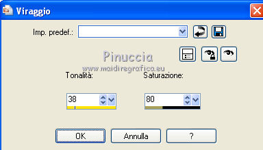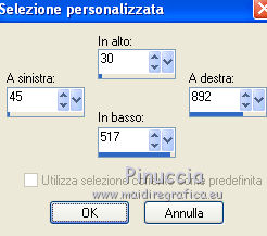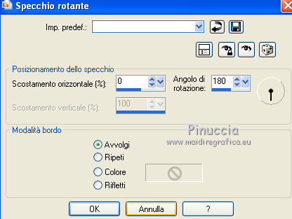 qui puoi trovare qualche risposta ai tuoi dubbi. Se l'argomento che ti interessa non è presente, ti prego di segnalarmelo. Per tradurre questo tutorial ho usato PSP X. Questo tutorial è una creazione di ©Titoune e non può essere copiato su altri siti nè essere offerto per il download. Lo stesso vale per la mia traduzione. Il materiale viene da vari gruppi di condivisione. Il copyright appartiene ai rispettivi autori. Grazie ai creatori dei tubes che mettono a disposizione il loro lavoro in vari gruppi di condivisione. Occorrente: Materiale qui Il tube utilizzato è una creazione di Nara Pamplona Gli elementi scrap sono una creazione Scrappy Bit of Fun Rispetta il lavoro degli autori, non cambiare il nome del file e non cancellare il watermark. ![]() Metti la maschera "LIBM16a" nella cartella Maschere. Apri la maschera "silvestermaske10_sigrid" in PSP e minimizzala con il resto del materiale. 1. Imposta il colore di primo piano con #c9c498, e il colore di sfondo con il colore nero. Prendi nota dei valori di Tonalità (H) e saturazione (S) del colore di primo piano. Per l'esempio Tonalità 38, Saturazione 80. 2. Apri una nuova immagine trasparente 1280 x 550 pixels, e riempila con il colore nero di sfondo.3. Livelli>Nuovo livello raster. Riempi con il colore di primo piano #c9c498.4. Livelli>Nuovo livello maschera>Da immagine. Apri il menu sotto la finestra di origine e vedrai la lista dei files aperti. Seleziona la maschera silvestermaske10_sigrid, con i seguenti settaggi. ![]() Livelli>Unisci>Unisci gruppo. 5. Livelli>Duplica. Cambia la modalità di miscelatura del livello originale in Luce diffusa. 6. Attiva lo strumento Selezione ,clicca sull'icona Selezione personalizzata ![]() e imposta i seguenti settaggi: ![]() 7. Livelli>Nuovo livello raster. 8. Apri il tube 20081208-6859-new-year-2009. Livelli>Carica/Salva maschera>Carica maschera da disco. Cerca e carica la maschera LIBM16a. ![]() Livelli>Unisci>Unisci gruppo. Modifica>Copia. Torna al tuo lavoro e vai a Modifica>Incolla nella selezione. Selezione>Deseleziona. Abbassa l'opacità di questo livello al 53%. 9. Apri il tube newyear_2012, che è composto da vari livelli. Attiva il livello boule_facette e vai a Modifica>Copia. minimizzalo perchè dovrai usare anche gli altri livelli Torna al tuo lavoro e vai a Modifica>Incolla come nuovo livello. Spostalo in alto a sinistra, nella maschera.Vedi l'esempio finale. 10. Effetti>Effetti 3D>Sfalsa ombra, con il colore #c9c498. ![]() Ripeti l'Effetto Sfalsa ombra, cambiando verticale e orizzontale con -3. 11. Ritorna al tube newyear_2012 e attiva il livello verres-bougies. Modifica>Copia. Torna al tuo lavoro e vai a Modifica>Incolla come nuovo livello. Spostalo in basso a destra nella maschera.Vedi l'effetto finale. ![]() 12. Effetti>Effetti 3D>Sfalsa ombra, con i settaggi precedenti. 13. Ritorna al tube newyear_2012 e attiva il livello happy_new_year. Modifica>Copia. Torna al tuo lavoro e vai a Modifica>Incolla come nuovo livello. Spostalo nella parte superiore della maschera.Vedi l'effetto finale. 14. Effetti>Effetti 3D>Sfalsa ombra, con i settaggi precedenti. 15. Ritorna al tube newyear_2012 e attiva il livello 2012. Modifica>Copia. Torna al tuo lavoro e vai a Modifica>Incolla come nuovo livello. Spostalo in alto sotto il testo precedente.Vedi l'effetto finale. 16. Effetti>Effetti 3D>Sfalsa ombra, con i settaggi precedenti. 17. Apri il tube SophisticatSimone_A_New_Beginning_Bow_10 e vai a Modifica>Copia. Torna al tuo lavoro e vai a Modifica>Incolla come nuovo livello. 18. Regola>Tonalità e saturazione>Viraggio, e trascrivi i valori annotati nelle rispettive caselle. ![]() Spostalo a destra - vedi l'esempio finale.19. Effetti>Effetti 3D>Sfalsa ombra, con i settaggi precedenti. 20. Apri il tube SophisticatSimone_A_New_Beginning_Element_35 e vai a Modifica>Copia. Torna al tuo lavoro e vai a Modifica>Incolla come nuovo livello. Spostalo in basso a destra, come nel mio esempio.21. Effetti>Effetti 3D>Sfalsa ombra, con i settaggi precedenti. 22. Attiva il livello Raster 1. Selezione>Seleziona tutto. Immagine>Ritaglia la selezione. 23. Immagine>Dimensioni tela - 1280 x 1500 pixels. ![]() 24. Livelli>Nuovo livello raster. Livelli>Disponi>Sposta giù. Riempi con il colore nero di sfondo.25. Attiva il livello superiore. Apri il tube SophisticatSimone_A_New_Beginning_Element_38 e vai a Modifica>Copia. Torna al tuo lavoro e vai a Modifica>Incolla come nuovo livello. 26. Regola>Tonalità e saturazione>Viraggio, con i settaggi precedenti. Spostalo sotto la maschera in basso a sinistra.Vedi l'esempio finale. 27. Effetti>Effetti di riflesso>Specchio rotante. ![]() 28. Effetti>Effetti 3D>Sfalsa ombra, con i settaggi precedenti. 29. Apri il tube "TubeNP-804" e vai a Modifica>Copia. Torna al tuo lavoro e vai a Modifica>Incolla come nuovo livello. Immagine>Rifletti. Immagine>Ridimensiona, al 65%, tutti i livelli non selezionato. Spostalo in basso sulla maschera.30. Livelli>Duplica e cambia la modalità di miscelatura di questo livello in Luce diffusa. Attiva il livello sottostante dell'originale. 31. Effetti>Effetti 3D>Sfalsa ombra, con i settaggi precedenti. Firma il tuo lavoro. Livelli>Unisci>Unisci tutto e salva in formato jpg. ![]() Se hai problemi o dubbi, o trovi un link non funzionante, o anche soltanto per un saluto, scrivimi. 2 Gennaio 2012 |