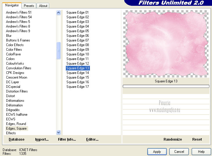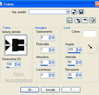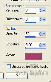 qui puoi trovare qualche risposta ai tuoi dubbi. Se l'argomento che ti interessa non è presente, ti prego di segnalarmelo. Per tradurre questo tutorial ho usato PSP X. Questo tutorial è una creazione di ©Titoune e non può essere copiato su altri siti nè essere offerto per il download. Lo stesso vale per la mia traduzione. Grazie ai creatori dei tubes che mettono a disposizione il loro lavoro in vari gruppi di condivisione. Rispetta il lavoro degli autori, non cambiare il nome del file e non cancellare il watermark. Occorrente: Un tube a scelta. Il resto del materiale qui Il tube usato è di Nicky. Gli elementi scrap sono una creazione http://creativemisfitscreations.blogspot.ch/ Misfitsbr> Filtri: Filters Unlimited 2.0 qui Penta.com - Jeans qui Animation Shop qui ![]() Metti la trama "texture_bemine" nella cartella Trame. 1. Apri una nuova immagine trasparente 750 x 600 pixels. Selezione>Seleziona tutto. 2. Apri l'elemento "tuiledepart". Regola>Tonalità e saturazione>Viraggio. ![]() Modifica>Copia. Torna al tuo lavoro e vai a Modifica>Incolla nella selezione. 3. Selezione>Modifica>Contrai - 45 pixels. Selezione>Innalza selezione a livello. 4. Effetti>Plugins>Filter Unlimited 2 - Edges Square - Square Edge 13. ![]() Selezione>Deseleziona. 5. Effetti>Effetti di trama>Trama - seleziona la trama "texture_bemine" con i seguenti settaggi. ![]() 6. Effetti>Effetti 3D>Sfalsa ombra, con il colore #a4406f. ![]() Abbassa l'opacità di questo livello al 20%. Effetti>Effetti di bordo>Aumenta. 7. Apri l'elemento ele36 e vai a Modifica>Copia. Torna al tuo lavoro e vai a Modifica>Incolla come nuovo livello. Spostalo un po' più in alto a sinistra.Vedi l'esempio finale. Effetti>Effetti 3D>Sfalsa ombra, con i settaggi precedenti. 8. Apri l'elemento ele9 e vai a Modifica>Copia. Torna al tuo lavoro e vai a Modifica>Incolla come nuovo livello. Spostalo un po' più a sinistra.Vedi l'esempio finale. Livelli>Disponi>Sposta giù. Effetti>Effetti 3D>Sfalsa ombra, con i settaggi precedenti. Livelli>Duplica. Immagine>Rifletti. Posiziona correttamente il duplicato a destra.![]() 9. Apri l'elemento ele53 e vai a Modifica>Copia. Torna al tuo lavoro e vai a Modifica>Incolla come nuovo livello. Spostalo in alto.Vedi l'esempio finale. Effetti>Effetti 3D>Sfalsa ombra, con i settaggi precedenti. 10. Apri l'elemento ele31 e vai a Modifica>Copia. Torna al tuo lavoro e vai a Modifica>Incolla come nuovo livello. Spostalo in basso.Vedi l'esempio finale. Effetti>Effetti 3D>Sfalsa ombra, con i settaggi precedenti. 11. Apri l'elemento ele25 e vai a Modifica>Copia. Torna al tuo lavoro e vai a Modifica>Incolla come nuovo livello. Spostalo a sinistra