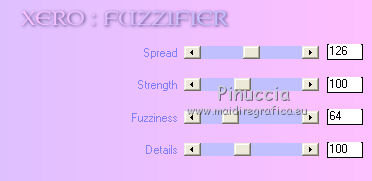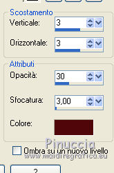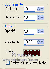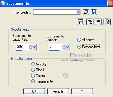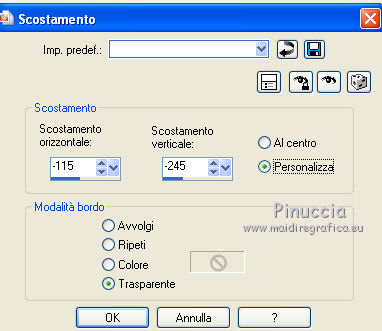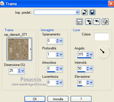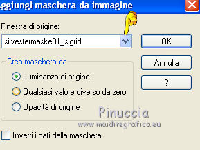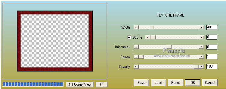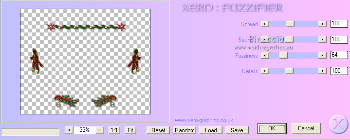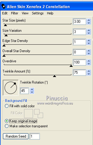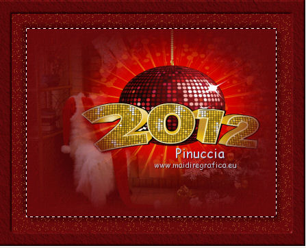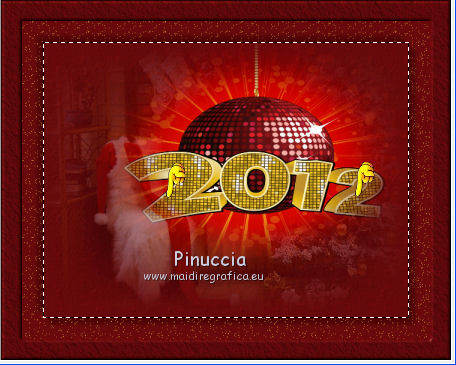 qui puoi trovare qualche risposta ai tuoi dubbi. Se l'argomento che ti interessa non è presente, ti prego di segnalarmelo. Per tradurre questo tutorial ho usato PSP X. Questo tutorial è una creazione di ©Titoune e non può essere copiato su altri siti nè essere offerto per il download. Lo stesso vale per la mia traduzione. Il materiale viene da vari gruppi di condivisione. Il copyright appartiene ai rispettivi autori. Grazie ai creatori dei tubes che mettono a disposizione il loro lavoro in vari gruppi di condivisione. Occorrente: Un tube a scelta. Il resto del materiale qui Per il mio esempio ho usato un tube di Maryse. Gli elementi scrap sono una creazione di Sigrid. Anche la maschera è una creazione di Sigrid. Il tube "fin-annee12-verocreation" è una creazione di Verocreation Rispetta il lavoro degli autori, non cambiare il nome del file e non cancellare il watermark. Filtri: consulta, se necessario, la mia sezione filtri qui AAA Frames - Texture Frame qui Alien Skin Xenofex 2.0 - Constellation qui Xero - Improver, Fuzzifier qui Penta.com - Jeans qui Animation Shop qui ![]() Metti la trama wp_damask_071 nella cartella Trame. Apri la maschera in PSP e minimizzala con il resto del materiale. 1. Imposta il colore di primo piano con #ffc2c3, e il colore di sfondo con #690c0e. Ti servirà anche un terzo colore contrastante, che imposterai come colore di primo piano quando necessario. Per l'esempio #ecc94b. 2. Apri una nuova immagine trasparente 750 x 600 pixels, e riempila con il colore di sfondo.3. Selezione>Seleziona tutto. Selezione>Modifica>Contrai - 35 pixels. Livelli>Nuovo livello raster. Riempi con il colore contrastante #ecc94b.4. Di nuovo: Selezione>Modifica>Contrai - 35 pixels. Premi sulla tastiera il tasto CANC. Cambia la modalità di miscelatura di questo livello in Dissolvi, e abbassa l'opacità al 2%. Selezione>Inverti. 5. Effetti>Effetti 3D>Sfalsa ombra con il colore #340001. ![]() Ripeti l'Effetto Sfalsa ombra, cambiando verticale e orizzontale con -3. 6. Selezione>Seleziona tutto. Selezione>Modifica>Contrai - 35 pixels. Selezione>Inverti. 7. Attiva il livello inferiore. Selezione>Innalza selezione a livello. 8. Effetti>Plugins>AAA Frames - Texture Frame. ![]() 9. Effetti>Effetti 3D>Smusso a incasso. ![]() Selezione>Inverti. 10. Ancora Selezione>Modifica>Contrai - 35 pixels. Attiva nuovamente il livello inferiore. Livelli>Nuovo livello raster. 11. Apri il tube fin-annee12-verocreation e vai a Modifica>Copia. Torna al tuo lavoro e vai a Modifica>Incolla nella selezione. 12. Effetti>Effetti di immagine>Scostamento. ![]() Selezione>Inverti. Premi sulla tastiera il tasto CANC. 13. Ancora Selezione>Inverti. Livelli>Duplica, e attiva il livello sottostante dell'originale. 14. Effetti>Plugins>Xero - Improver. ![]() 15. Effetti>Effetti 3D>Sfalsa ombra, con il colore #340001. ![]() Ripeti l'Effetto Sfalsa ombra, cambiando verticale e orizzontale con -10. Rinomina questo livello "animazione 1". 16. Attiva il livello Raster 1. Effetti>Effetti di trama>Trama - seleziona la trama wp_damask_071 con i seguenti settaggi. ![]() 17. Livelli>Nuovo livello raster. Apri il tube 48.Ivo-Chimney. Immagine>Rifletti. Modifica>Copia. Torna al tuo lavoro e vai a Modifica>Incolla nella selezione. Abbassa l'opacità di questo livello al 75%. 19. Attiva lo strumento Gomma , dimensione 20,e cancella le parti del tube visibili sul 2012. ![]() Dovresti avere questo. ![]() Selezione>Deseleziona. 19. Attiva il livello superiore. Livelli>Nuovo livello raster. Riempi con il colore di primo piano iniziale #ffc2c3.20. Selezione>Seleziona tutto. Selezione>Modifica>Contrai - 1 pixels. Premi sulla tastiera il tasto CANC. Selezione>Inverti. 21. Effetti>Plugins>Penta.com - Jeans, con i settaggi standard. ![]() Selezione>Deseleziona. 22. Effetti>Effetti 3D>Sfalsa ombra, con il colore #340001. ![]() Ripeti l'Effetto Sfalsa ombra, cambiando verticale e orizzontale con -3. 23. Livelli>Nuovo livello raster. Riempi con il colore di primo piano #ffc2c3.24. Livelli>Nuovo livello maschera>Da immagine. Apri il menu sotto la finestra di origine e vedrai la lista dei files aperti. Seleziona la maschera "silvestermask01_sigrid" con i seguenti settaggi. ![]() Livelli>Unisci>Unisci gruppo. 25. Effetti>Effetti 3D>Sfalsa ombra, con i settaggi precedenti. Livelli>Duplica, e cambia la modalità di miscelatura di questo livello in Luce diffusa. 26. Apri il tube SGS_Christmas_Trennlinie-rot.png e vai a Modifica>Copia. Torna al tuo lavoro e vai a Modifica>Incolla come nuovo livello. 27. Effetti>Effetti di immagine>Scostamento. ![]() 28. Effetti>Effetti 3D>Sfalsa ombra, con i settaggi precedenti. 29. Apri il tube w-dekor_set4_4_©sigrid e vai a Modifica>Copia. Torna al tuo lavoro e vai a Modifica>Incolla come nuovo livello. 30. Effetti>Effetti di immagine>Scostamento. ![]() 31. Effetti>Effetti di riflesso>Specchio rotante. ![]() 32. Effetti>Effetti 3D>Sfalsa ombra, con i settaggi precedenti. 33. Apri il tube w-dekor_set11b_©sigrid e vai a Modifica>Copia. Torna al tuo lavoro e vai a Modifica>Incolla come nuovo livello. 34. Effetti>Effetti di immagine>Scostamento. ![]() 35. Effetti>Effetti di riflesso>Specchio rotante. ![]() 36. Effetti>Effetti 3D>Sfalsa ombra, con i settaggi precedenti. Livelli>Unisci>Unisci giù - 2 volte - e rinomina questo livello "animazione 2". 37. Apri il tube SGS_Freebie4_Geschenkebox.png e vai a Modifica>Copia. Torna al tuo lavoro e vai a Modifica>Incolla come nuovo livello. Spostalo in basso tra le due decorazioni.38. Effetti>Effetti 3D>Sfalsa ombra, con i settaggi precedenti. 39. Apri il tube w-box_set1_2_©sigrid e vai a Modifica>Copia. Torna al tuo lavoro e vai a Modifica>Incolla come nuovo livello. Spostalo a fianco del pacchetto precedente.Livelli>Disponi>Sposta giù. 40. Effetti>Effetti 3D>Sfalsa ombra, con i settaggi precedenti. 41. Apri il tuo tube e vai a Modifica>Copia. Torna al tuo lavoro e vai a Modifica>Incolla come nuovo livello. Livelli>Disponi>Porta in alto. Immagine>Ridimensiona, se e quanto 