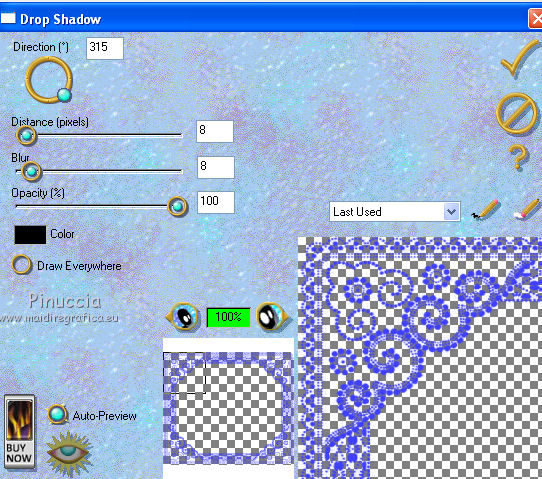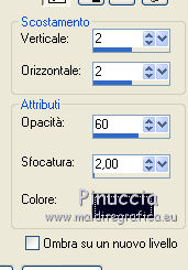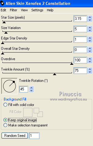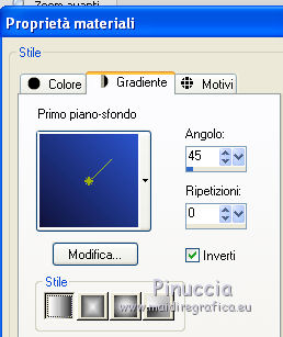 qui puoi trovare qualche risposta ai tuoi dubbi. Se l'argomento che ti interessa non è presente, ti prego di segnalarmelo. Per tradurre questo tutorial ho usato PSP X. Questo tutorial è una creazione di ©Titoune e non può essere copiato su altri siti nè essere offerto per il download. Lo stesso vale per la mia traduzione. Il materiale viene da vari gruppi di condivisione. Il copyright appartiene ai rispettivi autori. Grazie ai creatori dei tubes che mettono a disposizione il loro lavoro in vari gruppi di condivisione. Occorrente: Materiale qui Il tube utilizzato è di Nurso53. Rispetta il lavoro degli autori, non cambiare il nome del file e non cancellare il watermark. Filtri: consulta, se necessario, la mia sezione filtri qui Graphics Plus - Cross Shadow qui Alien Skin Xenofex 2.0 - Constellation qui Adjust - Variations qui Eye Candy 3.1 - Drop Shadow qui Animation Shop qui ![]() 1. Imposta il colore di primo piano con #2b53cc, e il colore di sfondo con #12133b. Passa il colore di primo piano a Gradiente, stile Lineare, con i seguenti settaggi. ![]() 2. Apri una nuova immagine trasparente 750 x 650 pixels, e riempila con il gradiente.3. Effetti>Plugins>Graphics Plus - Cross Shadow. ![]() 4. Apri il tube Stait_HalloMoon e vai a Modifica>Copia. Torna al tuo lavoro e vai a Modifica>Incolla come nuovo livello. Cambia la modalità di miscelatura di questo livello in Luminanza (esistente). Rinomina questo livello "animazione 1". 5. Livelli>Nuovo livello raster. Selezione>Seleziona tutto. 6. Apri il tube f090809. Attiva lo strumento Selezione , rettangolo,seleziona la firma al centro del tube e premi sulla tastiera il tasto CANC. Selezione>Deseleziona. Modifica>Copia. Torna al tuo lavoro e vai a Modifica>Incolla nella selezione. 7. Effetti>Plugins>Eye Candy 3.1 - Drop Shadow. ![]() Selezione>Deseleziona. 8. Attiva il livello "animazione 1". 9. Apri il tube NS_98_0909 e vai a Modifica>Copia. Torna al tuo lavoro e vai a Modifica>Incolla come nuovo livello. 10. Immagine>Ridimensiona, al 90%, tutti i livelli non selezionato. Regola>Messa a fuoco>Metti a fuoco. Sposta il tube un po' più in basso - vedi il mio esempio.Livelli>Duplica. Livelli>Unisci>Unisci giù. Di nuovo Livelli>Duplica. Cambia la modalità di miscelatura del livello sottostante dell'originale in Filtra. 11. Attiva il livello superiore. Apri il tube "texte" e vai a Modifica>Copia. Torna al tuo lavoro e vai a Modifica>Incolla come nuovo livello. 12. Effetti>Effetti di immagine>Scostamento. ![]() 13. Effetti>Effetti 3D>Sfalsa ombra, con il colore #03031e. ![]() Rinomina questo livello "animazione 2". Firma il tuo lavoro. 14. Attiva il livello "animazione 1". Effetti>Plugins>Alien skin Xenofex 2.0 - Constellation. ![]() Modifica>Copia Unione. Apri Animation Shop e vai a Modifica>Incolla>Incolla come nuova animazione. 15. Torna in PSP. Modifica>Annulla azione Constellation. 16. Effetti>Plugins>Alien Skin Xenofex 2.0 - Constellation, clicca su Random Seed e ok. Attiva il livello "animazione 2". Effetti>Plugins>Adjust - Variations, 1 clic su More Blue e 1 clic su Lighter. Modifica>Copia Unione. Torna in Animation Shop e vai a Modifica>Incolla>Incolla dopo il fotogramma corrente. 17. Di nuovo in PSP. Modifica>Annulla azione Variations. Modifica>Annulla azione Selezione livello. Modifica>Annulla azione Constellation. E sei nuovamente sul livello "animazione 1". Effetti>Plugins>Alien Skin Xenofex 2.0 - Constellation, clicca su Random Seed e ok. Attiva il livello "animazione 2". Effetti>Plugins>Adjust - Variations. 1 clic su More Blue e 1 clic su Lighter. Modifica>Copia Unione. Per finire, in Animation Shop: Modifica>Incolla>Incolla dopo il fotogramma corrente. 18. Modifica>Seleziona tutto. Animazione>Proprietà fotogramma, e imposta la velocità a 25. ![]() Controlla il risultato cliccando su Visualizza e salva in formato gif.![]() Se hai problemi o dubbi, o trovi un link non funzionante, o anche soltanto per un saluto, scrivimi. 17 Novembre 2011 |