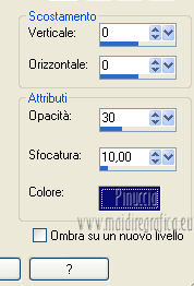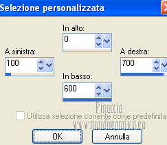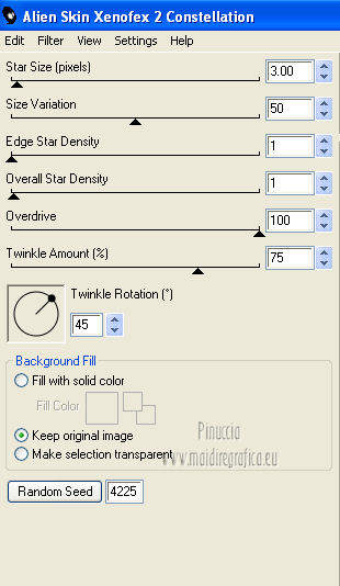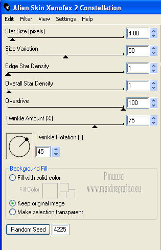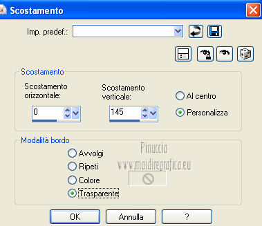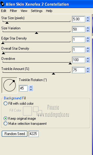 qui puoi trovare qualche risposta ai tuoi dubbi. Se l'argomento che ti interessa non è presente, ti prego di segnalarmelo. Questo tutorial è una creazione di ©Titoune e non può essere copiato su altri siti nè essere offerto per il download. Lo stesso vale per la mia traduzione. Il tutorial è stato creato con PSP X5, ma può essere eseguito anche con le altre versioni di PSP. Secondo la versione utilizzata (anteriore a PSP X) potresti ottenere dei risultati differenti. Per tradurlo, ho usato PSP X. Grazie ai creatori dei tubes che mettono a disposizione il loro lavoro in vari gruppi di condivisione. Rispetta il lavoro degli autori, non cambiare il nome del file e non cancellare il watermark. Occorrente: Materiale qui Il tube utilizzato è di Grafica Paola. Gli elementi utilizzati sono una crezione Cindrys Filtri: Mehdi - Sorting Tile qui Mehdi - Kaleidoscope 2.1 qui Flaming Pear - Flexify 2 qui Alien Skin Xenofex 2 - Constellation qui Animation Shop qui ![]() 1. Apri l'immagine moon2. Duplicala usando la combinazione di tasti maiuscola+D. Chiudi l'originale. La copia sarà la base del tuo lavoro. 2. Colorizza l'immagine, in funzione del tube utilizzato. Per l'esempio: Regola>Tonalità e saturazione>Viraggio. ![]() Rinomina questo livello "animazione". 3. Apri l'immagine moon8. Regola>Tonalità e saturazione>Viraggio, con i settaggi precedenti. Modifica>Copia. Torna al tuo lavoro e vai a Modifica>Incolla come nuovo livello. 4. Attiva lo strumento Selezione ![]() clicca sull'icona selezione personalizzata ![]() e imposta i seguenti settaggi. ![]() Premi sulla tastiera il tasto CANC ![]() Selezione>Deseleziona. 5. Effetti>Plugins>Mehdi - Sorting Tile. ![]() 6. Effetti>Plugins>Mehdi - Kaleidoscope 2.1. ![]() 7. Effetti>Plugins>Flaming Pear - Flexify 2. ![]() 8. Effetti>Effetti di immagine>Scostamento. ![]() Livelli>Duplica. Immagine>Capovolgi. Livelli>Unisci>Unisci giù. 9. Effetti>Effetti 3D>Sfalsa ombra, con il colore #0a0d72. ![]() Ripeti l'Effetto Sfalsa ombra, cambiando verticale e orizzontale con -3. 10. Apri l'elemento jsn_csdblog_soprecious_glitter e vai a Modifica>Copia. Torna al tuo lavoro e vai a Modifica>Incolla come nuovo livello. Regola>Tonalità e saturazione>Viraggio, con i settaggi precedenti. Spostalo a destra.Vedi l'esempio finale. Nella paletta dei livelli porta questo livello sopra Raster 1. Effetti 3D>Sfalsa ombra, con il colore #0a0d72. ![]() Livelli>Duplica. Immagine>Rifletti. Posiziona correttamente il duplicato in alto a destra,in modo che non copra le lancette dell'orologio. ![]() 12. Apri l'elemento 042221 e vai a Modifica>Copia. Torna al tuo lavoro e vai a Modifica>Incolla come nuovo livello. Livelli>Disponi>Porta in alto. Regola>Tonalità e saturazione>Viraggio, con i settaggi precedenti. Spostalo in alto a destra.Effetti>Effetti 3D>Sfalsa ombra, con i settaggi precedenti. Livelli>Duplica. Immagine>Capovolgi. Immagine>Rifletti. 13. Apri l'elemento jsn_csdblog_soprecious_blue leaves e vai a Modifica>Copia. Torna al tuo lavoro e vai a Modifica>Incolla come nuovo livello. 14. Immagine>Ruota per gradi - 25 pixels a sinistra. ![]() Livelli>Duplica. Immagine>Rifletti. Sposta i due elementi in basso a destra.![]() Livelli>Unisci>Unisci giù. Effetti>Effetti 3D>Sfalsa ombra, con i settaggi precedenti. 15. Apri l'elemento l'élément jsn_csd__soprecious_butterfly e vai a Modifica>Copia. Torna al tuo lavoro e vai a Modifica>Incolla come nuovo livello. Regola>Tonalità e saturazione>Viraggio, con i settaggi precedenti. Spostalo in basso a destra.![]() Effetti>Effetti 3D>Sfalsa ombra, con i settaggi precedenti. 16. Apri l'elemento jsn_csdblog_soprecious_pearl e vai a Modifica>Copia. Torna al tuo lavoro e vai a Modifica>Incolla come nuovo livello. Regola>Tonalità e saturazione>Viraggio, con i settaggi precedenti. Spostalo a sinistra.Vedi l'esempio finale. Effetti>Effetti 3D>Sfalsa ombra, con il colore #0a0d72. ![]() Ripeti l'Effetto Sfalsa ombra, cambiando verticale e orizzontale con -3. 17. Apri l'elemento jsn_csdblog_soprecious_heart e vai a Modifica>Copia. Torna al tuo lavoro e vai a Modifica>Incolla come nuovo livello. Spostalo a sinistra.![]() Effetti>Effetti 3D>Sfalsa ombra, con i settaggi precedenti. 18. Apri l'elemento t052210 e vai a Modifica>Copia. Torna al tuo lavoro e vai a Modifica>Incolla come nuovo livello. Regola>Tonalità e saturazione>Viraggio, con i settaggi precedenti. Spostalo in alto a sinistra.Vedi l'esempio finale. Nessun Effetto Sfalsa ombra. 19. Apri il tube Mary 0712-107 ou celui de votre choix e vai a Modifica>Copia. Torna al tuo lavoro e vai a Modifica>Incolla come nuovo livello. 20. Immagine>Ridimensiona, al 50%, tutti i livelli non selezionato. Regola>Messa a fuoco>Metti a fuoco. Spostalo a destra.Vedi l'esempio finale. Effetti>Effetti 3D>Sfalsa ombra, con il colore #0a0d72. ![]() 21. Apri il tube titoune_frame_blue_hour e vai a Modifica>Copia. Torna al tuo lavoro e vai a Modifica>Incolla come nuovo livello. Effetti>Effetti 3D>Sfalsa ombra, con il colore #0a0d72. ![]() Ripeti l'Effetto Sfalsa ombra, cambiando verticale e orizzontale con -3. Firma il tuo lavoro. 22. Animazione. Attiva il livello "animazione". Livelli>Duplica, 2 volte e rimani posizionato sul livello della seconda copia. 23. Selezione>Carica/Salva selezione>Carica selezione da disco. Cerca e carica la selezione "selection_blue_hour". ![]() Effetti>Plugins>Alien Skin Xenofex 2 - Constellation. ![]() Chiudi questo livello e attiva il livello della prima copia. 24. Effetti>Plugins>Alien Skin Xenofex 2 - Constellation, cambia Star Size con 4,00 e ok. (non cliccare su Random Seed). ![]() Chiudi questo livello e attiva il livello "animazione". 25. Effetti>Plugins>Alien Skin Xenofex 2 - Constellation, Star Size 5,00 e ok. ![]() Selezione>Deselezione. Lascia il livello visibile. Selezione>Deseleziona. Modifica>Copia Unione. Apri Animation Shop e vai a Modifica>Incolla>Incolla come nuova animazione. 26. Torna in PSP. Chiudi il livello "animazione" e apri il livello della prima copia