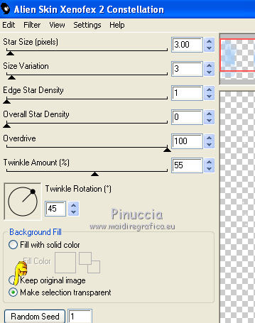 Effetti>Plugins>Alien Skin Xenofex 2.0 - Constellation, con gli stessi settaggi, ma cliccando una volta su Random Seed.