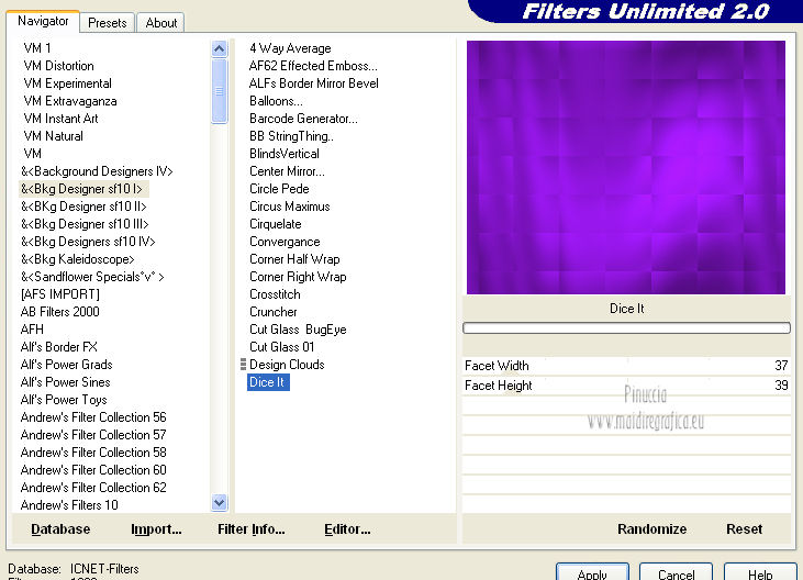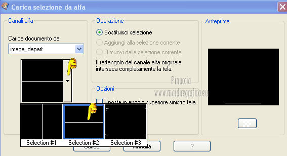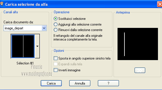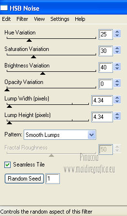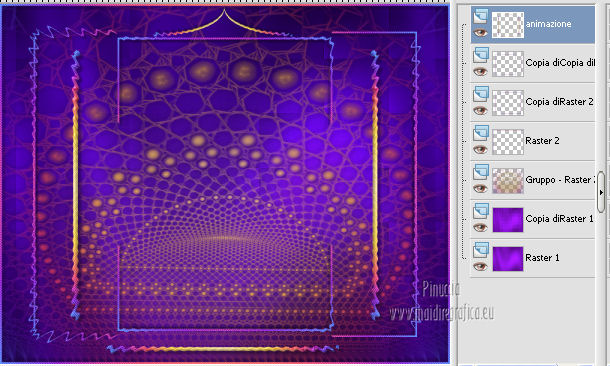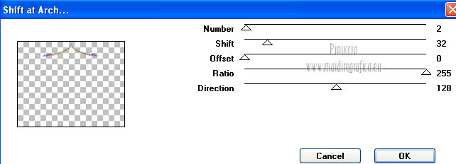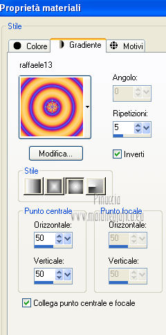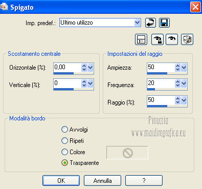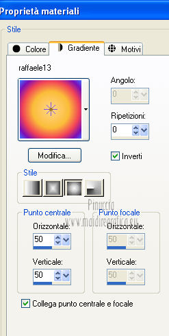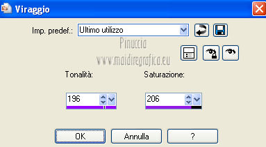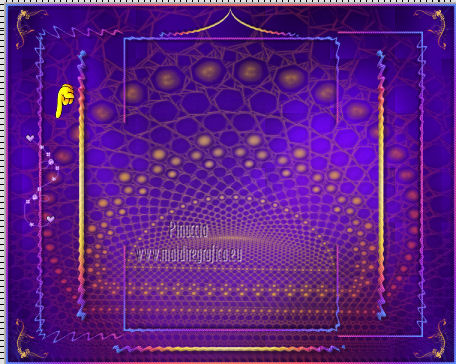 qui puoi trovare qualche risposta ai tuoi dubbi. Se l'argomento che ti interessa non è presente, ti prego di segnalarmelo. Per tradurre questo tutorial ho usato PSP X. Questo tutorial è una creazione di ©Titoune e non può essere copiato su altri siti nè essere offerto per il download. Lo stesso vale per la mia traduzione. Il tutorial è stato creato con PSP X5, ma può essere eseguito anche con le altre versioni di PSP. Per tradurlo, ho usato PSP X. Grazie ai creatori dei tubes che mettono a disposizione il loro lavoro in vari gruppi di condivisione. Rispetta il lavoro degli autori, non cambiare il nome del file e non cancellare il watermark. Occorrente: Materiale qui Il tube usato è di C25. Filtri: Filters Unlimited 2.0 qui &<Bkg Designer sf10I> - Dice it (da importare in Unlimited) qui Eye Candy 4000 - HSB Noise qui Simple - Pizza Slice Mirror qui Graphics Plus - Cross Shadow qui Mura's Seamless - Shift at Arch qui Penta.com - Jeans qui Animation Shop qui ![]() Metti il Gradiente "raffaele13" nella cartella Gradienti. Apri la maschera in PSP e minimizzala con il resto del materiale. 1. Passa il colore di primo piano a Gradiente, e seleziona il gradiente "raffaele 13" con i seguenti settaggi. ![]() Imposta il colore di sfondo con #7813ba. 2. Apri "image_départ". Duplicala usando la combinazione di tasti maiuscola+D e chiudi l'originale. Lavora sulla copia. L'immagine non è vuota, ma contiene le selezioni salvate sul canale alfa. Riempi l'immagine trasparente con il colore di sfondo.3. Effetti>Plugins>Graphics plus - Cross Shadow. ![]() Livelli>Duplica. 4. Effetti>Plugins>Filter Unlimited 2 - &<kg Designer sf10I> - Dice it, con i settaggi standard. ![]() Effetti>Effetti di bordo>Aumenta. Cambia la modalità di miscelatura di questo livello in Moltiplica. 5. Livelli>Nuovo livello raster. Riempi con il gradiente.6. Livelli>Nuovo livello maschera>Da immagine. Apri il menu sotto la finestra di origine e vedrai la lista dei files aperti. Seleziona la maschera Narah_mask_Abstract041, con i seguenti settaggi: ![]() Livelli>Unisci>Unisci gruppo. 7. Effetti>Effetti 3D>Sfalsa ombra, con il colore #150723. ![]() Ripeti l'Effetto Sfalsa ombra, cambiando verticale e orizzontale con -5. 8. Livelli>Nuovo livello raster. Riempi nuovamente con il gradiente.9. Selezione>Seleziona tutto. Selezione>Modifica>Contrai - 3 pixels. Premi sulla tastiera il tasto CANC. Selezione>Inverti. 10. Effetti>Plugins>Penta.com - Jeans, con i settaggi standard. ![]() Selezione>Deseleziona. 11. Effetti>Effetti 3D>Sfalsa ombra, con i settaggi precedenti. Livelli>Duplica. Immagine>Ridimensiona, all'85%, tutti i livelli non selezionato. 12. Effetti>Plugins>Simple - Pizza Slice Mirror. Livelli>Duplica. Immagine>Rifletti. 13. Effetti>Effetti di distorsione>Spigato. ![]() 14. Selezione>Carica/Salva selezione>Carica selezione da canale alfa. La selezione Sélection #1 è subito presente. Devi soltanto cliccare Carica. Attenzione: assicurati che Inverti immagine non sia selezionato ![]() Livelli>Nuovo livello raster. Riempi con il gradiente.Selezione>Deseleziona. 15. Effetti>Plugins>Penta.com - Jeans, con i settaggi standard. 16. Effetti>Effetti di distorsione>Spigato, con i settaggi precedenti. 17. Effetti>Effetti 3D>Smusso a incasso. ![]() 18. Effetti>Effetti di riflesso>Specchio rotante. ![]() 19. Effetti>Effetti 3D>Sfalsa ombra, con il colore #150723. ![]() Rinomina questo livello "animazione". 20. Selezione>Carica/Salva selezione>Carica selezione da canale alfa. Apri il menu delle selezioni e carica Sélection#2. ![]() Livelli>Nuovo livello raster. Riempi con il gradiente.Selezione>Deseleziona. 21. Effetti>Plugins>Penta.com - Jeans, con i settaggi standard. 22. Effetti>Effetti di distorsione>Spigato, con i settaggi precedenti. 23. Effetti>Effetti 3D>Smusso a incasso, con i settaggi precedenti. 24. Effetti>Effetti 3D>Sfalsa ombra, con i settaggi precedenti. Livelli>Duplica. Immagine>Capovolgi. 25. Effetti>Plugins>Mura's Seamless - Shift at Arch, con i settaggi standard. ![]() 26. Immagine>Ridimensiona, al 60%, tutti i livelli non selezionato. Sposta in alto, vicino al bordo.Vedi l'esempio finale. Livelli>Unisci>Unisci giù - 2 volte. E avrai unito i livelli nel livello "animazione". ![]() 27. Selezione>Carica/Salva selezione>Carica selezione da canale alfa. Apri il menu delle selezioni e carica Sélection#3. ![]() Livelli>Nuovo livello raster. 28. Cambia i settaggi del gradiente, portando Ripetizioni a 5. ![]() Riempi con il gradiente.Selezione>Deseleziona. 29. Effetti>Effetti 3D>Sfalsa ombra, con i settaggi precedenti. 30. Apri il tube "pmsaccentshearts", composto da diversi livelli. Per l'esempio attiva il livello Copy of Layer 2 e vai a Modifica>Copia. Torna al tuo lavoro e vai a Modifica>Incolla come nuovo livello. 31. Regola>Tonalità e saturazione>Viraggio. ![]() Spostalo a sinistra.![]() 32. Effetti>Effetti di riflesso>Specchio rotante, con i settaggi precedenti. Effetti>Effetti 3D>Sfalsa ombra, con il colore #150723. ![]() 33. Apri il tube c25 tubes 2012 mauve burlesque, e vai a Modifica>Copia. Torna al tuo lavoro e vai a Modifica>Incolla come nuovo livello. 34. Immagine>Ridimensiona, al 65%, tutti i livelli non selezionato. Regola>Messa a fuoco>Metti a fuoco. Spostalo come nel mio esempio.35. Effetti>Effetti 3D>Sfalsa ombra, con il colore #150723. ![]() Firma il tuo lavoro. 36. Animazione. Attiva il livello "animazione". Livelli>Duplica - 2 volte e rimani posizionato sul livello della seconda copia. 37. Effetti>Plugins>Eye Candy 4000 - HSB Noise. ![]() Chiudi questo livello e attiva il livello della prima copia. 38. Effetti>Plugins>Eye Candy 4000 - HSB Noise, clicca su Random Seed e ok. Chiudi questo livello e attiva il livello "animazione". 39. Effetti>Plugins>Eye Candy 4000 - HSB Noise, clicca su Random Seed e ok. Lascia il livello visibile. Modifica>Copia Unione. Apri Animation Shop e vai a Modifica>Incolla>Incolla come nuova animazione. 40. Torna in PSP. Chiudi il livello "animazione" e apri il livello della 
