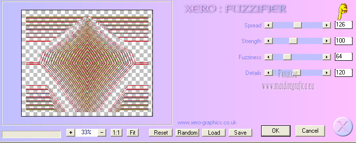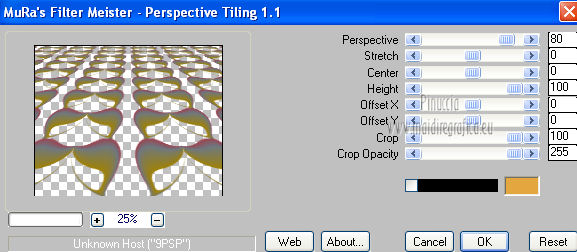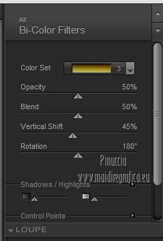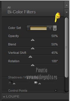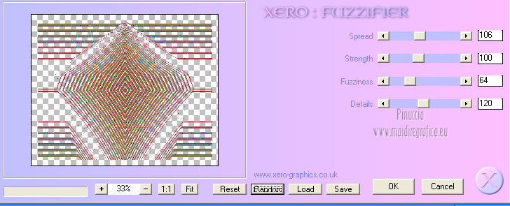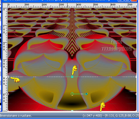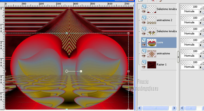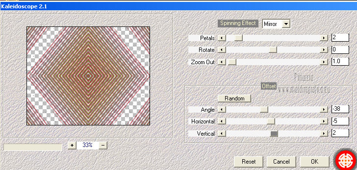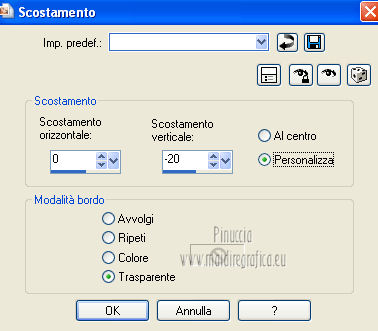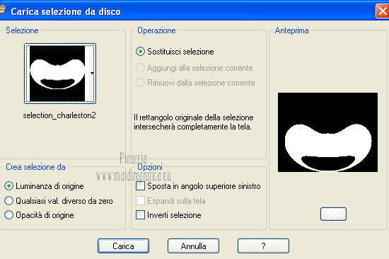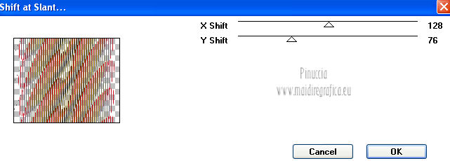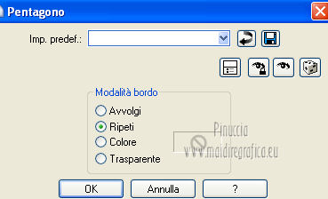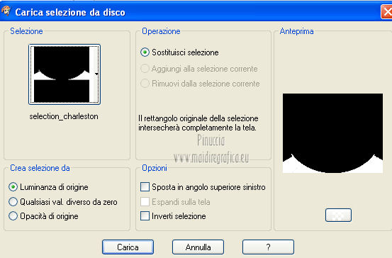 qui puoi trovare qualche risposta ai tuoi dubbi. Se l'argomento che ti interessa non è presente, ti prego di segnalarmelo. Per tradurre questo tutorial ho usato PSP X. Questo tutorial è una creazione di ©Titoune e non può essere copiato su altri siti nè essere offerto per il download. Lo stesso vale per la mia traduzione. Il tutorial è stato creato con PSP X5, ma può essere eseguito anche con le altre versioni di PSP. Per tradurlo, ho usato PSP X. Grazie ai creatori dei tubes che mettono a disposizione il loro lavoro in vari gruppi di condivisione. Rispetta il lavoro degli autori, non cambiare il nome del file e non cancellare il watermark. Occorrente: Materiale qui Il tube utilizzato è di Katrina Filtri: Penta.com - Jeans qui Mehdi - Kaleidoscope 2.1 qui Mura's Seamless - Shift at slant qui Mura's Meister - Perspective Tiling qui Nik Software - Color Efex Pro qui L&K - L&K Zitah qui Simple - Left Right Wrap (bonus) qui Xero - Fuzzifier qui Animation Shop qui ![]() Metti il gradiente "charleston" nella cartella Gradienti. Metti le selezioni "selection_charleston" e "selection_charleston2" nella cartella Selezioni. 1. Passa il colore di primo piano a Gradiente, e seleziona il gradiente "charleston" con i seguenti settaggi. ![]() 2. Apri l'immagine "fond_charleston". Duplicala usando la combinazione di tasti maiuscola+D e chiudi l'originale. La copia sarà la base del tuo lavoro. Livelli>Nuovo livello raster. Riempi con il gradiente.3. Effetti>Effetti geometrici>Prospettiva verticale - 2 volte con i seguenti settaggi. ![]() Effetti>Effetti di bordo>Aumenta. 4. Effetti>Effetti geometrici>Sfera. ![]() 5. Effetti>Effetti di distorsione>Coordinate polari. ![]() 6. Selezione>Carica/Salva selezione>Carica selezione da disco. Cerca e carica la selezione "selection_charleston". ![]() Selezione>Innalza selezione a livello. 7. Attiva il livello sottostante. Premi sulla tastiera il tasto CANC. Attiva nuovamente il livello soprastante della selezione innalzata. 8. Effetti>Plugins>L&K - L&K Zitah. ![]() Selezione>Deseleziona. Effetti>Effetti di bordo>Aumenta. 9. Effetti>Effetti 3D>Sfalsa ombra, con il colore #3c2417. ![]() Ripeti l'Effetto Sfalsa ombra, cambiando verticale e orizzontale con -3. 10. Attiva nuovamente il livello sottostante. Rinomina questo livello "cuore". 11. Livelli>Duplica, e attiva il livello originale. Effetti>Plugins>Mura's Seamless - Shift at Slant. ![]() 12. Effetti>Plugins>Mehdi - Kaleidoscope 2.1 ![]() 13. Effetti>Effetti geometrici>Pentagono. ![]() 14. Rinomina questo livello "animazione. Attiva il livello immediatamente sopra "copia di cuore". Rinomina questo livello "cuore". ![]() 15. Selezione>Carica/Salva selezione>Carica selezione da disco. Cerca e carica la selezione "selection_charleston2". ![]() Selezione>Innalza selezione a livello. Selezione>Deseleziona. 16. Effetti>Plugins>Simple - Left Right Wrap. 17. Effetti>Effetti geometrici>Cerchio. ![]() 18. Livelli>Duplica. Effetti>Plugins>Mura's Meister - Perspective Tiling. ![]() 19. Se non visualizzi i righelli, vai a Visualizza>Righelli. Premi il tasto K per attivare lo strumento Puntatore ![]() se stai usando PSP 9 il tasto D (valido per tutte le versioni) per attivare lo strumento Deformazione ![]() In modalità Scala spingi il nodo centrale superiore verso il basso fino a 400 pixels, (puoi controllare la posizione nella barra inferiore). ![]() 20. Effetti>Effetti 3D>Sfalsa ombra, con i settaggi precedenti. Rinomina questo livello "animazione2". 21. Attiva il livello "cuore". Effetti>Effetti 3D>Sfalsa ombra, con i settaggi precedenti. 22. Apri il tube MCcenterville e vai a Modifica>Copia. Torna al tuo lavoro e vai a Modifica>Incolla come nuovo livello. 23. Immagine>Ridimensiona, al 95%, tutti i livelli non selezionato. Livelli>Disponi>Porta in alto. 24. Effetti>Effetti di immagine>Scostamento. ![]() 25. Effetti>Effetti 3D>Sfalsa ombra, con i settaggi precedenti. 26. Apri il tube klstriplelamppost e vai a Modifica>Copia. Torna al tuo lavoro e vai a Modifica>Incolla come nuovo livello. 27. Effetti>Effetti di immagine>Scostamento. ![]() 28. Effetti>Effetti di riflesso>Specchio rotante. ![]() 29. Effetti>Effetti 3D>Sfalsa ombra, con i settaggi precedenti. 30. Apri il tube DBK AA Vector-GG29, e vai a Modifica>Copia. Torna al tuo lavoro e vai a Modifica>Incolla come nuovo livello. 31. Immagine>Ridimensiona, al 55%, tutti i livelli non selezionato. Sposta il tube al centro, come nel mio esempio.Regola>Messa a fuoco>Metti a fuoco. 32. Effetti>Effetti 3D>Smusso a incasso. ![]() 33. Effetti>Effetti 3D>Sfalsa ombra, con i settaggi precedenti. 34. Apri il tube texte Charleston e vai a Modifica>Copia. Torna al tuo lavoro e vai a Modifica>Incolla come nuovo livello. Spostalo in basso a destra.35. Effetti>Effetti 3D>Sfalsa ombra, con i settaggi precedenti. 36. Livelli>Nuovo livello raster. Imposta il colore di primo piano con #da0011. Riempi il livello con questo colore.37. Selezione>Seleziona tutto. Selezione>Modifica>Contrai - 2 pixels. Premi sulla tastiera il tasto CANC. Selezione>Inverti. 38. Effetti>Plugins>Penta.com - Jeans, con i settaggi standard. ![]() Selezione>Deseleziona. 39. Attiva il livello Raster 1. Modifica>Copia. Selezione>Seleziona tutto. Immagine>Ritaglia la selezione. 40. Selezione>Seleziona tutto. Immagine>Dimensioni tela - 800 x 650 pixels. ![]() Livelli>Nuovo livello raster. Livelli>Disponi>Sposta giù. Selezione>Inverti. Modifica>Incolla nella selezione. 41. Selezione>Seleziona tutto. Livelli>Nuovo livello raster. Livelli>Disponi>Porta in alto. Riempi con il colore di primo piano #da0011.42. Selezione>Modifica>Contrai - 2 pixels. Premi sulla tastiera il tasto CANC. Selezione>Inverti. 43. Effetti>Plugins>Penta.com - Jeans, con i settaggi standard. ![]() Selezione>Deseleziona. 44. Apri il tube "titoune_coins_charleston" e vai a Modifica>Copia. Torna al tuo lavoro e vai a Modifica>Incolla come nuovo livello. Effetti>Effetti 3D>Sfalsa ombra, con i settaggi precedenti. Firma il tuo lavoro. 45. Animazione. 