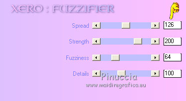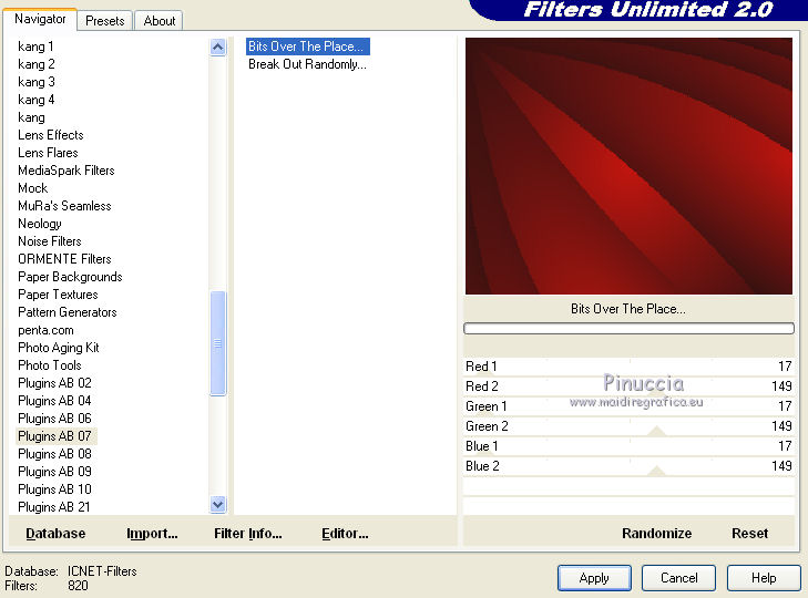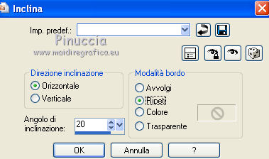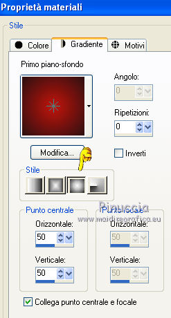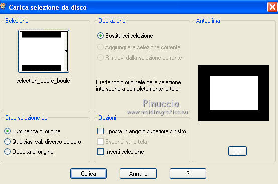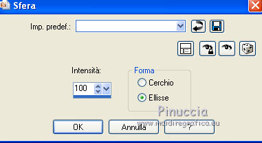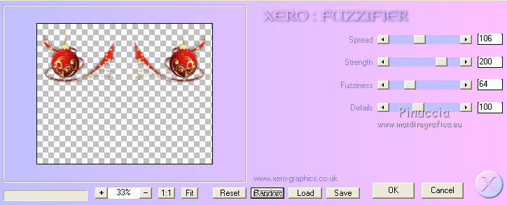 qui puoi trovare qualche risposta ai tuoi dubbi. Se l'argomento che ti interessa non è presente, ti prego di segnalarmelo. Per tradurre questo tutorial ho usato PSP X. Questo tutorial è una creazione di ©Titoune e non può essere copiato su altri siti nè essere offerto per il download. Lo stesso vale per la mia traduzione. Il materiale viene da vari gruppi di condivisione. Il copyright appartiene ai rispettivi autori. Grazie ai creatori dei tubes che mettono a disposizione il loro lavoro in vari gruppi di condivisione. Occorrente: Materiale qui Il tube utilizzato è di Liza Tubes. Gli elementi scrap sono una creazione Friendly Scrap. Rispetta il lavoro degli autori, non cambiare il nome del file e non cancellare il watermark. Filtri: consulta, se necessario, la mia sezione filtri qui Adjust - Variations qui Xero - Fuzzifier qui Filters Unlimited 2.0 qui Plugins AB10 - Random_Border qui I Plugins AB si importano in Filters Unlimited. Ti consiglio di importare soltanto l'effetto che ti serve: importarli tutti potrebbe bloccare il programma Animation Shop qui ![]() Metti la selezione nella cartella Selezioni. 1. Imposta il colore di primo piano con #c2150f, e il colore di sfondo con #2b1110. Passa il colore di primo piano a Gradiente, stile Sprazzo di luce, con i seguenti settaggi. ![]() 2. Apri una nuova immagine trasparente 750 x 600 pixels, e riempila con il gradiente.3. Selezione>Seleziona tutto. Selezione>Modifica>Contrai - 25 pixels. Selezione>Inverti. Selezione>Innalza selezione a livello. 4. Effetti>Plugins>Tramages - Tow the line, con i settaggi standard. ![]() Mantieni selezionato fino al punto 17. 5. Livelli>Nuovo livello raster. Imposta il colore di primo piano con un colore contrastante; il mio #eee898. Riempi il livello con questo colore.Livelli>Disponi>Sposta giù. 6. Attiva il livello soprastante. Cambia la modalità di miscelatura di questo livello in Luminanza (esistente). 7. Effetti>Effetti 3D>Smusso a incasso. Livelli>Unisci>Unisci giù. Selezione>Inverti. 8. Effetti>Effetti 3D>Sfalsa ombra, con il colore #0e0503. ![]() Ripeti l'Effetto Sfalsa ombra, cambiando verticale e orizzontale con -3. 9. Attiva il livello inferiore. Effetti>Plugins>Filters Unlimited 2.0 - Plugins AB07 - Bit Over The Place, con i settaggi standard. ![]() 10. Selezione>Modifica>Contrai - 75 pixels. Livelli>Nuovo livello raster. 11. Apri l'immagine "1z4a40ol" e vai a Modifica>Copia. Torna al tuo lavoro e vai a Modifica>Incolla nella selezione. Selezione>Mobile. Selezione>Immobilizza. 12. Selezione>Modifica>Seleziona bordature selezione. ![]() Selezione>Innalza selezione a livello. 13. Effetti>Plugins>Tramages - Tow the line, con i settaggi standard. 14. Livelli>Nuovo livello raster. Riempi nuovamente con il colore #eee898.Livelli>Disponi>Sposta giù. 15. Attiva il livello soprastante. Cambia la modalità di miscelatura di questo livello in Luminanza (esistente). 16. Effetti>Effetti 3D>Smusso a incasso, con i settaggi precedenti. Livelli>Unisci>Unisci giù - 2 volte. 17. Effetti>Effetti 3D>Sfalsa ombra, con i settaggi precedenti. Rinomina questo livello "animazione". Selezione>Deseleziona. 18. Livelli>Duplica, e attiva il livello sottostante. 19. Effetti>Effetti geometrici>Inclina. ![]() Effetti>Effetti geometrici>Sfera. ![]() 21. Effetti>Effetti 3D>Sfalsa ombra, con i settaggi precedenti. 22. Attiva il livello superiore. Apri il tube 008 e vai a Modifica>Copia. Torna al tuo lavoro e vai a Modifica>Incolla come nuovo livello. 23. Effetti>Effetti di immagine>Scostamento. ![]() 24. Effetti>Effetti di riflesso>Specchio rotante. ![]() 25. Effetti>Effetti 3D>Sfalsa ombra, con i settaggi precedenti. Rinomina questo livello "animazione 2". 26. Apri il tube "001" e vai a Modifica>Copia. Torna al tuo lavoro e vai a Modifica>Incolla come nuovo livello. Spostalo nell'angolo in alto a sinistra.27. Effetti>Effetti di riflesso>Specchio rotante, con i settaggi precedenti. 28. Effetti>Effetti 3D>Sfalsa ombra, con i settaggi precedenti. 29. Apri il tube w-dekor-set3_3_©sigrid e vai a Modifica>Copia. Torna al tuo lavoro e vai a Modifica>Incolla come nuovo livello. Spostalo in alto come nel mio esempio.>br> 30. Effetti>Effetti 3D>Sfalsa ombra, con i settaggi precedenti. Rinomina questo livello "animazione 3". 31. Apri il tube SGS_Freebie5_Kerze e vai a Modifica>Copia. Torna al tuo lavoro e vai a Modifica>Incolla come nuovo livello. Spostalo in basso a sinistra.32. Effetti>Effetti 3D>Sfalsa ombra, con i settaggi precedenti. 33. Apri il tube "0011" e vai a Modifica>Copia. Torna al tuo lavoro e vai a Modifica>Incolla come nuovo livello. Sposta l'albero in basso a destra.34. Effetti>Effetti 3D>Sfalsa ombra, con i settaggi precedenti. 35. Apri il tube "Liza tube staande kerstman" e vai a Modifica>Copia. Torna al tuo lavoro e vai a Modifica>Incolla come nuovo livello. 36. Immagine>Ridimensiona, al 55%, tutti i livelli non selezionato. Spostalo sul bordo inferiore.Livelli>Duplica, e cambia la modalità di miscelatura di questo livello in Luce diffusa. 37. Attiva il livello sottostante dell'originale. Effetti>Effetti 3D>Sfalsa ombra, con i settaggi precedenti. Aggiungi il tuo nome e/o il tuo watermark su un nuovo livello. 38. Animazione. Attiva il livello "animazione 2". Effetti>Plugins>Xero - Fuzzifier. ![]() 39. Attiva il livello "animazione 3". Effetti>Plugins>Xero - Fuzzifier, con gli stessi settaggi. 40. Modifica>Copia Unione. Apri Animation Shop e vai a Modifica>Incolla>Incolla come nuova animazione. 41. Torna in Psp. Modifica>Annulla azione Fuzzifier. Modifica>Annulla azione Selezione livello. Modifica>Annulla azione Fuzzifier. Attiva il livello "animazione". Selezione>Carica/Salva selezione>Carica selezione da disco. Cerca e carica la selezione "selection_cadre_boule". ![]() 42. Effetti>Plugins>Adjust - Variations. 1 clic su Original, per annullare eventuali precedenti settaggi memorizzati dal filtro. 1 clic su More Red e un clic su Lighter. Selezione>Deseleziona. 43. Attiva il livello "animazione 2". Effetti>Plugi