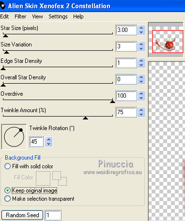 Effetti>Plugins>Alien Skin Xenofex 2.0 - Constellation, clicca una volta su Random Seed e ok.