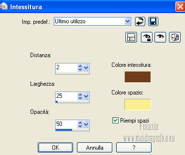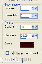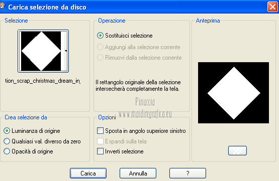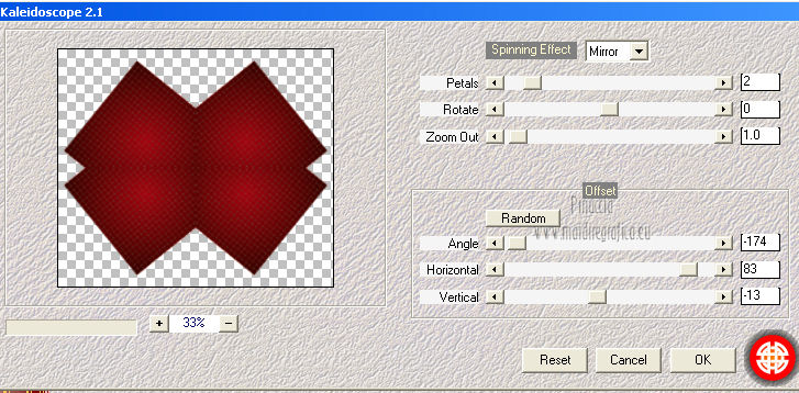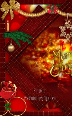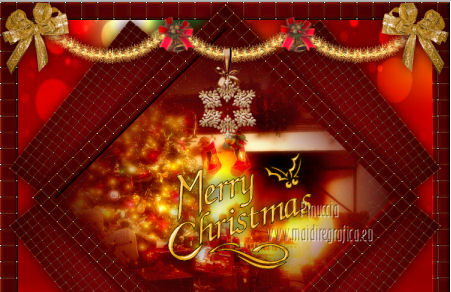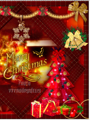 qui puoi trovare qualche risposta ai tuoi dubbi. Se l'argomento che ti interessa non è presente, ti prego di segnalarmelo. Per tradurre questo tutorial ho usato PSP X. Questo tutorial è una creazione di ©Titoune e non può essere copiato su altri siti nè essere offerto per il download. Lo stesso vale per la mia traduzione. Grazie ai creatori dei tubes che mettono a disposizione il loro lavoro in vari gruppi di condivisione. Rispetta il lavoro degli autori, non cambiare il nome del file e non cancellare il watermark. Occorrente: Un tube a scelta. Il resto del materiale qui Gli elementi scrap utilizzati sono una creazione Lysiras Gaphic World Filtri: Mehdi - Kaleidoscope 2.1 qui Adjust - Variations qui Simple - Left Right wrap (bonus) qui Animation Shop qui ![]() 1. Imposta il colore di primo piano con #aa0413, e il colore di sfondo con #330000. Passa il colore di primo piano a Gradiente, stile Sprazzo di luce. ![]() 2. Apri una nuova immagine trasparente 650 x 650 pixels. Livelli>Duplica. Riempi con il gradiente.3. Effetti>Effetti di trama>Intessitura. Colore intessitura #6f3d1d - Riempi spazi #fbee8f. ![]() 4. Immagine>Ridimensiona, al 70%, tutti i livelli non selezionato. 5. Immagine>Ruota per gradi - 45 gradi - a destra o a sinistra, non ha importanza. ![]() Effetti>Effetti di bordo>Aumenta. Chiudi momentaneamente questo livello, e attiva il livello Raster 1. 6. Immagine>Dimensioni tela - 750 x 650 pixels. ![]() Riempi con il gradiente.Selezione>Seleziona tutto. Selezione>Modifica>Contrai - 30 pixels. Selezione>Inverti. Selezione>Innalza seleizone a livello. 7. Effetti>Effetti di trama>Intessitura, con i settaggi precedenti. 8. Effetti>Effetti 3D>Smusso a incasso. ![]() Effetti>Effetti di bordo>Aumenta. Selezione>Inverti. 9. Attiva nuovamente il livello Raster 1. Livelli>Nuovo livello raster. 10. Apri l'immagine Abstract-Background-Christmas-Balls e vai a Modifica Copia. Torna al tuo lavoro e vai a Modifica>Incolla nella selezione. Selezione>Deseleziona. 11. Riapri e attiva il livello superiore. Livelli>Duplica. Chiudi questo livello e attiva il livello originale. Immagine>Ridimensiona, al 70%, tutti i livelli non selezionato. 12. Effetti>Plugins>Mehdi - Kaleidoscope 2.1. ![]() 13. Effetti>Effetti 3D>Sfalsa ombra, con il colore #330000. ![]() 14. Riapri e attiva il livello superiore della copia. Rinomina questo livello "rombo". Effetti>Effetti 3D>Sfalsa ombra, con i settaggi precedenti. 15. Selezione>Carica/Salva selezione>Carica selezione da disco. Cerca e carica la selezione "scrap_christmas_dream_in_gold". ![]() Selezione>Innalza selezione a livello. 16. Regola>Sfocatura>Sfocatura gaussiana - raggio 15. ![]() 17. Regola>Aggiungi/Rimuovi disturbo>Aggiungi disturbo. ![]() 18. Livelli>Nuovo livello raster. Apri il tube "chrismist_noel_31f3" e vai a Modifica>Copia. Torna al tuo lavoro e vai a Modifica>Incolla come nuovo livello. Se necessario, posizionalo correttamente nell'area selezionata.Per l'immagine dell'esempio non è necessario. Rinomina questo livello "animazione". Selezione>Inverti. Premi sulla tastiera il tasto CANC. Mantieni ancora selezionato. 19. Attiva il livello "rombo". Selezione>Innalza selezione a livello. Effetti>Effetti 3D>Smusso a incasso, con i settaggi precedenti. Livelli>Disponi>Porta in alto. Selezione>Deseleziona. 20. Apri il tube word_christmas e vai a Modifica>Copia. Torna al tuo lavoro e vai a Modifica>Incolla come nuovo livello. Spostalo al centro.Vedi l'esempio finale. 21. Apri l'elemento lgw_christmas_dream_in_gold_circleframe e vai a Modifica>Copia. Torna al tuo lavoro e vai a Modifica>Incolla come nuovo livello. 22. Immagine>Ruota per gradi - 90 gradi a destra o a sinistra, non ha importanza. ![]() Effetti>Plugins>Simple - Left Right Wrap. Sposta l'elemento in basso.Vedi l'esempio finale. Effetti>Effetti 3D>Sfalsa ombra, con i settaggi precedenti. Rinomina questo livello "anelli". 23. Apri l'elemento lgw_christmas_dream_in_gold_glitterbow e vai a Modifica>Copia. Torna al tuo lavoro e vai a Modifica>Incolla come nuovo livello. Spostalo in alto a sinistra.Vedi l'esempio finale. 24. Effetti>Effetti di riflesso>Specchio rotante. ![]() Effetti>Effetti 3D>Sfalsa ombra, con i settaggi precedenti. 25. Apri l'elemento D garland2 e vai a Modifica>Copia. Torna al tuo lavoro e vai a Modifica>Incolla come nuovo livello. Spostalo in alto.Vedi l'esempio finale. Livelli>Disponi>Sposta giù. Effetti>Effetti 3D>Sfalsa ombra, con i settaggi precedenti. 26. Apri l'elemento lgw_christmas_dream_in_gold_snowflake e vai a Modifica>Copia. Torna al tuo lavoro e vai a Modifica>Incolla come nuovo livello. Spostalo al centro della ghirlanda.![]() Effetti>Effetti 3D>Sfalsa ombra, con i settaggi precedenti. 27. Attiva il livello superiore. Apri l'elemento lgw_christmas_dream_in_gold_christmastime01 e vai a Modifica>Copia. Torna al tuo lavoro e vai a Modifica>Incolla come nuovo livello. Spostalo a sinistra.Vedi l'esempio finale. Effetti>Effetti 3D>Sfalsa ombra, con i settaggi precedenti. 28. Apri l'elemento lgw_christmas_dream_in_gold_christmasbell01 e vai a Modifica>Copia. Torna al tuo lavoro e vai a Modifica>Incolla come nuovo livello. Spostalo a destra.Vedi l'esempio finale. Effetti>Effetti 3D>Sfalsa ombra, con i settaggi precedenti. 29. Apri il tube ctree-sandi e vai a Modifica>Copia. Torna al tuo lavoro e vai a Modifica>Incolla come nuovo livello. Spostalo in basso a destra.Vedi l'esempio finale. Effetti>Effetti 3D>Sfalsa ombra, con i settaggi precedenti. Nella paletta dei livelli porta questo livello sotto il livello "anelli". 30. Attiva il livello superiore. Apri il tube KaraT4632 e vai a Modifica>Copia. Torna al tuo lavoro e vai a Modifica>Incolla come nuovo livello. Immagine>Rifletti. Spostalo in basso a destra.Effetti>Effetti 3D>Sfalsa ombra, con i settaggi precedenti. 31. Apri il tube 002_cadeau e vai a Modifica>Copia. Torna al tuo lavoro e vai a Modifica>Incolla come nuovo livello. Spostalo a destra del tube precedente.![]() Effetti>Effetti 3D>Sfalsa ombra, con i sett