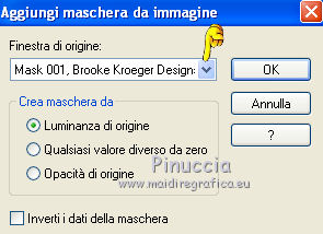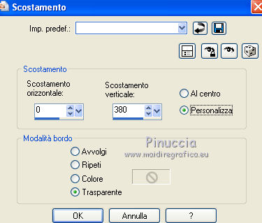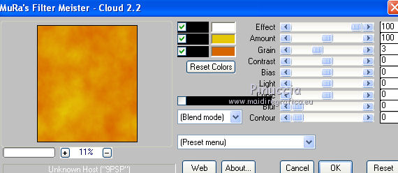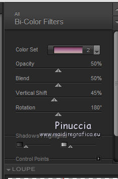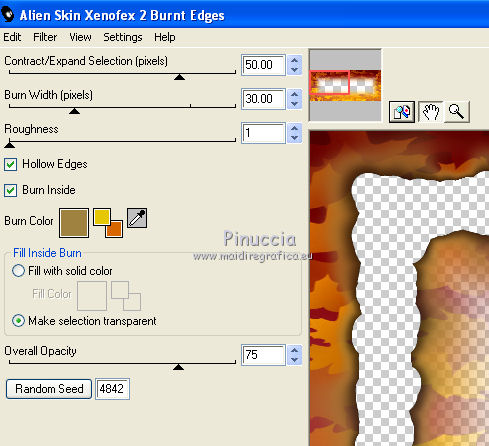 qui puoi trovare qualche risposta ai tuoi dubbi. Se l'argomento che ti interessa non è presente, ti prego di segnalarmelo. Per tradurre questo tutorial ho usato PSP X. Questo tutorial è una creazione di ©Titoune e non può essere copiato su altri siti nè essere offerto per il download. Lo stesso vale per la mia traduzione. Il materiale viene da vari gruppi di condivisione. Il copyright appartiene ai rispettivi autori. Grazie ai creatori dei tubes che mettono a disposizione il loro lavoro in vari gruppi di condivisione. Occorrente: Materiale qui Il poser è di Leilana Rispetta il lavoro degli autori, non cambiare il nome del file e non cancellare il watermark. Filtri: consulta, se necessario, la mia sezione filtri qui Mura's Meister - Cloud qui Penta.com - Color dot qui Nik Software - Color Efex Pro qui Alien Skin Xenofex 2.0 - Burnt Edges qui ![]() Apri la maschera "Mask_001 Brooke Kroeger" in PSP e minimizzala con il resto del materiale. 1. Imposta il colore di primo piano con #e5c705, e il colore di sfondo con #d86600. 2. Apri una nuova immagine trasparente 1280 x 550 pixels. Selezione>Seleziona tutto. 3. Apri l'immagine "feuilles" e vai a Modifica>Copia. Torna al tuo lavoro e vai a Modifica>Incolla nella selezione. 4. Selezione>Modifica>Contrai - 75 pixels. Selezione>Modifica>Sfuma - 100 pixels. 5. Livelli>Nuovo livello raster. Apri l'immagine autumn-landscape-colorful-leaves e vai a Modifica>Copia. Torna al tuo lavoro e vai a Modifica>Incolla nella selezione. 6. Selezione>Modifica>Contrai - 75 pixels. Selezione>Inverti. 7. Attiva il livello Raster 1. Selezione>Innalza selezione a livello. 8. Livelli>Disponi>Porta in alto. Selezione>Deseleziona. 9. Effetti>Plugins>Alien Skin Xenofex 2.0 - Burnt Edges. ![]() 10. Attiva lo strumento Selezione , rettangolo,e seleziona il motivo centrale. ![]() Premi sulla tastiera il tasto CANC. Selezione>Deseleziona. Risultato. ![]() 11. Apri il tube v_082911. Attiva lo strumento Selezione a mano libera , da punto a punto,e seleziona il fiore in basso a destra. Modifica>Copia. Torna al tuo lavoro e vai a Modifica>Incolla come nuovo livello. 12. Immagine>Ridimensiona, al 45%, tutti i livelli non selezionato. Spostalo nell'angolo in basso a sinistra.13. Livelli>Duplica. Immagine>Rifletti. Livelli>Unisci>Unisci giù. 14. Livelli>Duplica, e cambia la modalità di miscelatura di questo livello in Luce diffusa. 15. Attiva il livello sottostante dell'originale. Effetti>Effetti 3D>Sfalsa ombra, con il colore #714117. ![]() Ripeti l'Effetto Sfalsa ombra, cambiando verticale e orizzontale con -3. 16. Livelli>Nuovo livello raster. Selezione>Seleziona tutto. Apri il tube 04lgif, cancella la firma e vai a Modifica>Copia. Torna al tuo lavoro e vai a Modifica>Incolla nella selezione. Selezione>Deseleziona. Livelli>Disponi>Sposta giù - 2 volte. 17. Effetti>Plugins>Nik Software - Color Efex Pro - Bi-color Filter. Color Set Violet/Pink 2. ![]() 18. Effetti>Effetti 3D>Sfalsa ombra, con i settaggi precedenti. 19. Attiva il livello Raster 1. Selezione>Seleziona tutto. Immagine>Ritaglia la selezione. 20. Immagine>Dimensioni tela - 1280 x 1500 pixels. ![]() 21. Livelli>Nuovo livello raster. Livelli>Disponi>Sposta giù. 22. Effetti>Plugins>Mura's Meister - Cloud. ![]()