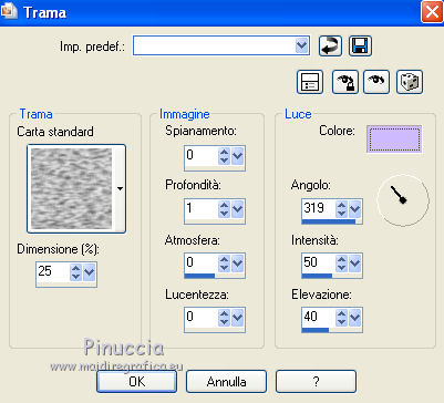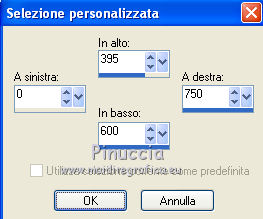 qui puoi trovare qualche risposta ai tuoi dubbi. Se l'argomento che ti interessa non č presente, ti prego di segnalarmelo. Per tradurre questo tutorial ho usato PSP X. Questo tutorial č una creazione di ŠTitoune e non puō essere copiato su altri siti nč essere offerto per il download. Lo stesso vale per la mia traduzione. Il materiale viene da vari gruppi di condivisione. Il copyright appartiene ai rispettivi autori. Grazie ai creatori dei tubes che mettono a disposizione il loro lavoro in vari gruppi di condivisione. Occorrente: Materiale qui Lo scrap utilizzato "Cool Summer Day" č una creazione http://scrapandtubes.blogspot.com Scrap and Tubes Rispetta il lavoro degli autori, non cambiare il nome del file e non cancellare il watermark. ![]() La trama "Carta standard" č standard in PSP e corrisponde, nelle versioni superiori, alla trama Corel_15_028. (Sulle diverse denominazioni nelle versioni di PSP, vedi qui ) Se non la trovi nel tuo PSP, metti nella cartella Trame quella fornita con il materiale. 1. Apri una nuova immagine trasparente 750 x 600 pixels. Selezione>Seleziona tutto. 2. Apri il tube "Cool Summer Day_Paper1_Scrap and Tubes" e vai a Modifica>Copia. Torna al tuo lavoro e vai a Modifica>Incolla nella selezione. Selezione>Deseleziona. 3. Attiva lo strumento Selezione ,clicca sull'icona Selezione personalizzata ![]() e imposta i seguenti settaggi: ![]() Livelli>Nuovo livello raster. 4. Apri il tube "Cool Summer Day_Paper3_Scrap and Tubes" e vai a Modifica>Copia. Torna al tuo lavoro e vai a Modifica>Incolla nella selezione. 5. Effetti>Effetti di trama>Trama - seleziona la trama Carta standard - colore #cebaff. ![]() Selezione>Deseleziona. 6. Apri il tube "Cool Summer Day_Element26_Scrap and Tubes" e vai a Modifica>Copia. Torna al tuo lavoro e vai a Modifica>Incolla come nuovo livello. 7. Immagine>Ridimensiona, al 50%, tutti i livelli non selezionato. 8. Effetti>Effetti di immagine>Scostamento. ![]() Livelli>Duplica. Immagine>Rifletti. Livelli>Unisci>Unisci gių. Livelli>Disponi>Sposta gių. 9. Effetti>Effetti 3D>Sfalsa ombra, con il colore #426ab4. ![]() 10. Apri il tube "Cool Summer Day_Element 24_Scrap and Tubes" e vai a Modifica>Copia. Torna al tuo lavoro e vai a Modifica>Incolla come nuovo livello. Spostalo in alto, come nel mio esempio.11. Effetti>Effetti 3D>Sfalsa ombra, con i settaggi precedenti. 12. Apri il tube "Cool Summer Day_Element 25_Scrap and Tubes" e vai a Modifica>Copia. Torna al tuo lavoro e vai a Modifica>Incolla come nuovo livello. Spostalo , in alto a destra.![]() 13. Effetti>Effetti 3D>Sfalsa ombra, con i settaggi precedenti. 14. Apri il tube "Cool Summer Day_Element 5_Scrap and Tubes" e vai a Modifica>Copia. Torna al tuo lavoro e vai a Modifica>Incolla come nuovo livello. Immagine>Rifletti. Spostalo , a sinistra - vedi il mio esempio.15. Effetti>Effetti 3D>Sfalsa ombra, con i settaggi precedenti. 16. Apri il tube "Cool Summer Day_Element 13_Scrap and Tubes" e vai a Modifica>Copia. Torna al tuo lavoro e vai a Modifica>Incolla come nuovo livello. Spostalo , a sinistra - vedi il mio esempio.![]() 17. Effetti>Effetti 3D>Sfalsa ombra, con i settaggi precedenti. 18. Apri il tube "Cool Summer Day_Element 2_Scrap and Tubes" e vai a Modifica>Copia. Torna al tuo lavoro e vai a Modifica>Incolla come nuovo livello. Immagine>Rifletti. Spostalo in basso a destra, come nel mio esempio.19. Effetti>Effetti 3D>Sfalsa ombra, con i settaggi precedenti. 20. Apri il tube "Cool Summer Day_Element 1_Scrap and Tubes" e vai a Modifica>Copia. Torna al tuo lavoro e vai a Modifica>Incolla come nuovo livello. Immagine>Rifletti. Spostalo in basso a destra dietro la sdraio, vedi il mio esempio.![]() 21. Effetti>Effetti 3D>Sfalsa ombra, con i settaggi precedenti. 22. Apri il tube "Cool Summer Day_Element 11_Scrap and Tubes" e vai a Modifica>Copia. Torna al tuo lavoro e vai a Modifica>Incolla come nuovo livello. Spostalo in basso a destra - vedi il mio esempio.23. Effetti>Effetti 3D>Sfalsa ombra, con i settaggi precedenti. 24. Apri il tube "Cool Summer Day_Element 20_Scrap and Tubes" e vai a Modifica>Copia. Torna al tuo lavoro e vai a Modifica>Incolla come nuovo livello. Sposta anche questo tube in basso a destra - vedi il mio esempio.25. Effetti>Effetti 3D>Sfalsa ombra, con i settaggi precedenti. 26. Apri il tube "Cool Summer Day_Element 23_Scrap and Tubes" e vai a Modifica>Copia. Torna al tuo lavoro e vai a Modifica>Incolla come nuovo livello. Spostalo in basso, come nel mio esempio.![]() 27. Effetti>Effetti 3D>Sfalsa ombra, con i settaggi precedenti. 28. Apri il tube "Cool Summer Day_Element 3_Scrap and Tubes" e vai a Modifica>Copia. Torna al tuo lavoro e vai a Modifica>Incolla come nuovo livello. Spostalo in basso sul telo, vedi il mio esempio.29. Effetti>Effetti 3D>Sfalsa ombra, con i settaggi precedenti. 30. Apri il tube "Cool Summer Day_Element 4_Scrap and Tubes" e vai a Modifica>Copia. Torna al tuo lavoro e vai a Modifica>Incolla come nuovo livello. Spostalo a sinistra come nel mio esempio.31. Effetti>Effetti 3D>Sfalsa ombra, con i settaggi precedenti. 32. Apri il tube "Cool Summer Day_©Krissys Imaging_Summer3_CU_Scrap and Tubes" e vai a Modifica>Copia. Torna al tuo lavoro e vai a Modifica>Incolla come nuovo livello. Spostalo dove ti sembra meglio o vedi il mio esempio.![]() 33. Effetti>Effetti 3D>Sfalsa ombra, con i settaggi precedenti. 34. Attiva il livello della sabbia - Raster 2. Livelli>Nuovo livello raster. Selezione>Seleziona tutto. 35. Apri il tube "Cool Summer Day_Paper2_Scrap and Tubes" e vai a Modifica>Copia. Torna al tuo lavoro e vai a Modifica>Incolla nella selezione. 36. Selezione>Modifica>Contrai - 20 pixels. Premi sulla tastiera il tasto CANC. Selezione>Inverti. 37. Effetti>Effetti 3D>Smusso a incasso. ![]() Selezione>Deseleziona. 38. Effetti>Effetti 3D>Sfalsa ombra, con i settaggi precedenti. Firma il tuo lavoro. Se hai usato il tube fornito, non dimenticare di aggiungere il copyright dell'autore. Livelli>Unisci>Unisci tutto e salva in formato jpg. ![]() Se