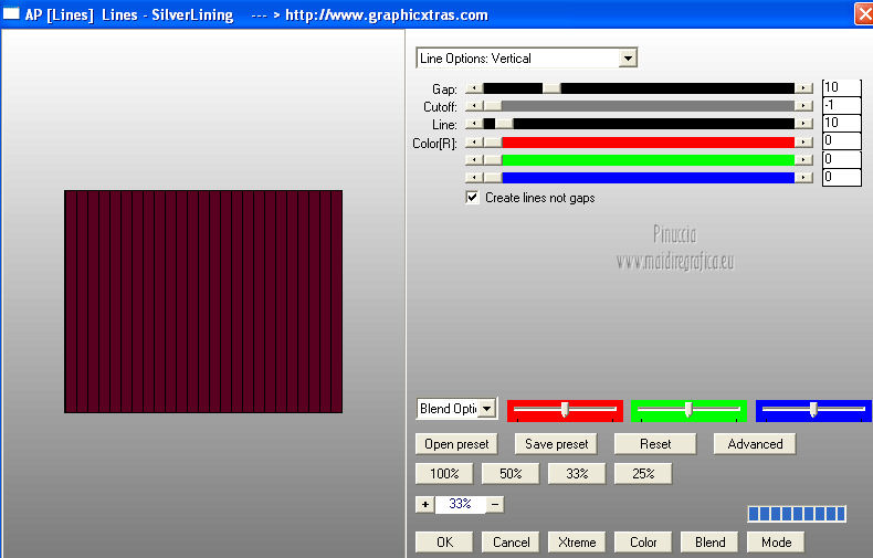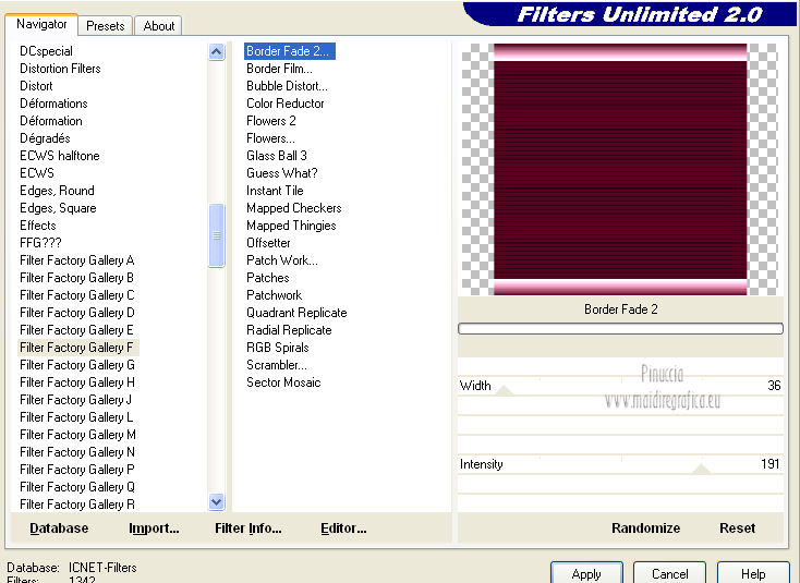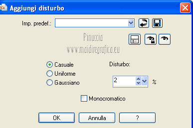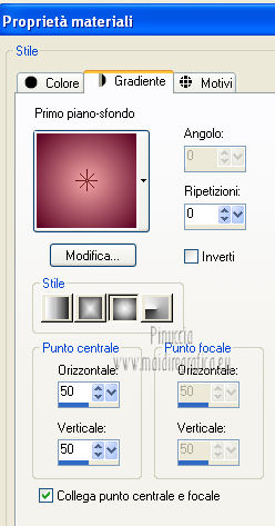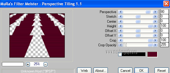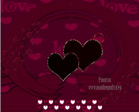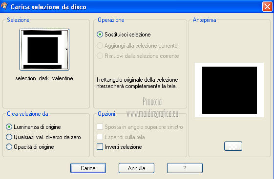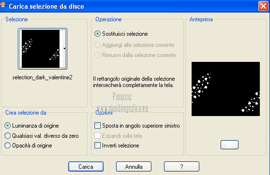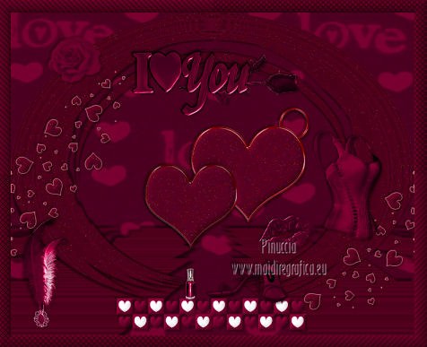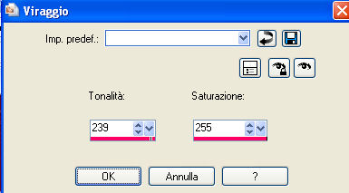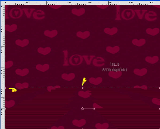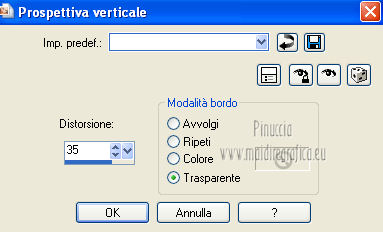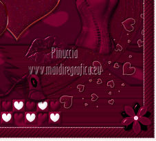 qui puoi trovare qualche risposta ai tuoi dubbi. Se l'argomento che ti interessa non è presente, ti prego di segnalarmelo. Per tradurre questo tutorial ho usato PSP X. Questo tutorial è una creazione di ©Titoune e non può essere copiato su altri siti nè essere offerto per il download. Lo stesso vale per la mia traduzione. Grazie ai creatori dei tubes che mettono a disposizione il loro lavoro in vari gruppi di condivisione. Rispetta il lavoro degli autori, non cambiare il nome del file e non cancellare il watermark. Occorrente: Un tube a scelta. Il resto del materiale qui Il tube utilizzato è di LuzCristina. Gli elementi scrap sono una creazione Rissa's Design's Filtri: AP Lines - Lines SilverLining qui Simple - Left right wrap (bonus) qui Filters Unlimited 2.0 qui Filter Factory Gallery F - Border Fade 2 qui Penta.com - Jeans qui Mura's Meister - Perspective Tiling qui I filtri Factory Gallery per essere usati devono prima essere convertiti. Come fare vedi qui Si usano importandoli in Filters Unlimited (come fare vedi qui) ma possono funzionare anche da soli. Le Factory fornite sono state già convertite. Anche i filtri Simple si possono usare da soli o importati in Filters Unlimited. Animation Shop qui ![]() 1. Scegli un colore dai toni "feltrati" e impostalo come colore di sfondo. Per l'esempio #590021. Prendi nota dei valori di Tonalità (H) e Saturazione (S) di questo colore: ti serviranno per il Viraggio. Per l'esempio: ![]() Imposta il colore di primo piano con un colore chiaro. Per l'esempio #f5a5a6. 2. Apri una nuova immagine trasparente 750 x 600 pixels. Selezione>Seleziona tutto. 3. Apri l'elemento RD_Paper09 e vai a Modifica>Copia. Torna al tuo lavoro e vai a Modifica>Incolla nella selezione. Selezione>Deseleziona. Regola>Tonalità e saturazione>Viraggio. ![]() 4. Livelli>Nuovo livello raster. Riempi con il colore di sfondo.Effetti>Plugins>AP Lines - Lines SilverLining, con i settaggi standard. ![]() 5. Immagine>Ruota per gradi - 90 gradi a sinistra. ![]() 6. Attiva il livello inferiore. Selezione>Seleziona tutto. Immagine>Ritaglia la selezione. 7. Attiva nuovamente il livello superiore. Effetti>Plugins>Filters Unlimited 2.0 - Filter Factory Gallery F - Border Fade 2, con i settaggi standard. ![]() 8. Selezione>Carica/Salva selezione>Carica selezione da disco. Cerca e carica la selezione "selection_dark_valentine". ![]() Premi sulla tastiera il tasto CANC. Selezione>Deseleziona. 9. Effetti>Effetti geometrici>Prospettiva verticale. ![]() Effetti>Plugins>Simple - Left Right Wrap. 10. Effetti>Plugins>Mura's Meister - Perspective Tiling. ![]() 11. Se non visualizzi i Righelli, vai a Visualizza>Righelli. Attiva lo strumento Puntatore ![]() se stai usando PSP 9 lo strumento Deformazione ![]() in modalità Scala, spingi in basso il nodo centrale al centro, fino a 400 pixels. ![]() 12. Effetti>Effetti 3D>Sfalsa ombra, con il colore nero. ![]() Ripeti l'Effetto Sfalsa ombra, cambiando verticale e orizzontale con -5. 13. Livelli>Duplica. Effetti>Effetti di distorsione>Coordinate polari. ![]() Rinomina questo livello "animazione". 14. Livelli>Nuovo livello raster. Selezione>Carica/Salva selezione>Carica selezione da disco. Cerca e carica la selezione "selection_dark_valentine2". ![]() Riempi la selezione con il colore chiaro di primo piano.16. Selezione>Modifica>Contrai - 1 pixel. Riempi con il colore di sfondo.17. Regola>Aggiungi/Rimuovi disturbo>Aggiungi disturbo. ![]() 18. Effetti>Effetti 3D>Smusso a incasso. ![]() Selezione>Deseleziona. 19. Effetti>Effetti 3D>Sfalsa ombra, con il colore nero. ![]() Ripeti l'Effetto Sfalsa ombra, cambiando verticale e orizzontale con -3. 20. Apri l'elemento RD_HeartBanner e vai a Modifica>Copia. Torna al tuo lavoro e vai a Modifica>Incolla come nuovo livello. Regola>Tonalità e saturazione>Viraggio, con i settaggi precedenti. Sposta l'elemento in basso.Vedi l'esempio finale. Effetti>Effetti 3D>Smusso a incasso, con i settaggi precedenti. Effetti>Effetti 3D>Sfalsa ombra, con i settaggi precedenti. 21. Apri l'elemento RD_CharmHeart e vai a Modifica>Copia. Torna al tuo lavoro e vai a Modifica>Incolla come nuovo livello. Immagine>Rifletti. Spostalo in basso.Vedi l'esempio finale. 22. Attiva lo strumento Bacchetta magica , modalità Aggiungi,e clicca al centro dei due cuori per selezionarli. ![]() Riempi con il colore di sfondo.Effetti>Effetti 3D>Smusso a incasso, con i settaggi precedenti. 23. Regola>Aggiungi/Rimuovi disturbo>Aggiungi disturbo, con i settaggi precedenti. Selezione>Deseleziona. Effetti>Effetti 3D>Sfalsa ombra, con i settaggi precedenti. 24. Apri l'elemento RD_Iheartyou e vai a Modifica>Copia. Torna al tuo lavoro e vai a Modifica>Incolla come nuovo livello. Regola>Tonalità e saturazione>Viraggio, con i settaggi precedenti. Sposta l'elemento in alto.Vedi l'esempio finale. Effetti>Effetti 3D>Sfalsa ombra, con i settaggi precedenti. 25. Apri l'elemento RD_BlackRose e vai a Modifica>Copia. Torna al tuo lavoro e vai a Modifica>Incolla come nuovo livello. Immagine>Ruota per gradi - 90 gradi a destra. ![]() Immagine>Capovolgi. Regola>Tonalità e saturazione>Viraggio, con i settaggi precedenti. Livelli>Disponi>Sposta giù. Sposta la rosa sotto il testo.![]() Effetti>Effetti 3D>Smusso a incasso, con i settaggi precedenti. Effetti>Effetti 3D>Sfalsa ombra, con i settaggi precedenti. 26. Attiva il livello superiore. Apri l'elemento RD_Heels1 e vai a Modifica>Copia. Torna al tuo lavoro e vai a Modifica>Incolla come nuovo livello. Regola>Tonalità e saturazione>Viraggio, con i settaggi precedenti. Sposta l'elemento come nel mio esempio.![]() Effetti>Effetti 3D>Smusso a incasso, con i settaggi precedenti. Effetti>Effetti 3D>Sfalsa ombra, con i settaggi precedenti. 27. Apri l'elemento RD_Corset e vai a Modifica>Copia. Torna al tuo lavoro e vai a Modifica>Incolla come nuovo livello. Sposta l'elemento a destra.Vedi l'esempio finale. Effetti>Effetti 3D>Smusso a incasso, con i settaggi precedenti. Effetti>Effetti 3D>Sfalsa ombra, con i settaggi preceden
