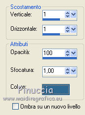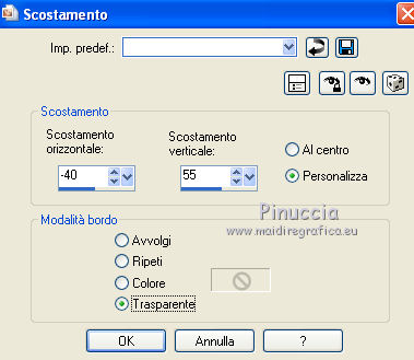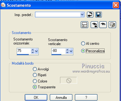qui puoi trovare qualche risposta ai tuoi dubbi. Se l'argomento che ti interessa non è presente, ti prego di segnalarmelo. Per tradurre questo tutorial ho usato PSP X. Questo tutorial è una creazione di ©Titoune e non può essere copiato su altri siti nè essere offerto per il download. Lo stesso vale per la mia traduzione. Il materiale viene da vari gruppi di condivisione. Il copyright appartiene ai rispettivi autori. Grazie ai creatori dei tubes che mettono a disposizione il loro lavoro in vari gruppi di condivisione. Occorrente: Un tube a scelta. Il resto del materiale qui Il template utilizzato è una creazione http://creativemisfitscreations.blogspot.com/ Créative Misfits Créations Per il mio esempio ho usato un poser di ©Elisabeth. Rispetta il lavoro degli autori, non cambiare il nome del file e non cancellare il watermark. ![]() 1.. Apri il template easterscrapkitle. Duplicalo usando la combinazione di tasti maiuscola+D e chiudi l'originale. La copia sarà la base del tuo lavoro. Elimina i livelli Raster 1, Raster 2 e Raster 14. 2. Apri e attiva il livello "background paper". Modifica>Copia. 3. Livelli>Nuovo livello raster. Livelli>Disponi>Sposta giù. 4. Immagine>Dimensione tela. ![]() Selezione>Seleziona tutto. Modifica>Incolla nella selezione. Selezione>Deseleziona. 5. Attiva nuovamente il livello "background paper". 6. Effetti>Effetti geometrici>Sfera. ![]() Effetti>Effetti di bordo>Aumenta. 7. Effetti>Effetti 3D>Sfalsa ombra, con il colore #2f6891. ![]() Ripeti l'Effetto Sfalsa ombra, cambiando verticale e orizzontale con -3. 8. Apri e attiva il livello "whitemask". 9. Effetti>Effetti di immagine>Scostamento. ![]() 10. Effetti>Effetti 3D>Sfalsa ombra, con i settaggi precedenti. 11. Apri e attiva il livello "whiteborderoneggs". 12. Effetti>Effetti di immagine>Scostamento, con i settaggi precedenti. ![]() Niente Sfalsa ombra. 13. Apri e attiva il livello "circleofeggs". 14. Effetti>Effetti di immagine>Scostamento, con i settaggi precedenti. ![]() Niente Sfalsa ombra. 15. Apri e attiva il livello "centerpaper". 16. Effetti>Effetti di immagine>Scostamento, con i settaggi precedenti. ![]() Niente Sfalsa ombra. 17. Apri e attiva il livello "swirls". 18. Effetti>Effetti di immagine>Scostamento, con i settaggi precedenti. ![]() Niente Sfalsa ombra. 19. Apri e attiva il livello "whiteborderonswirls". Effetti>Effetti di immagine>Scostamento, con i settaggi precedenti. ![]() Niente Sfalsa ombra. 20. Apri i livelli "plainpinkflwr", "plainyellowflwr", "plainblueflwr", e attiva il livello "plainpinkflwr". 21. Livelli>Unisci>Unisci giù - 2 volte. 22. Effetti>Effetti di immagine>Scostamento, con i settaggi precedenti. ![]() 23. Effetti>Effetti 3D>Sfalsa ombra, con i settaggi precedenti. 24. Livelli>Duplica. Immagine>Capovolgi. Immagine>Rifletti. 25. Elimina i livelli "pinkflwrwithwhite", "yellowflowrewithwhite" e "blueflwrwithwhite". 26. Apri e attiva il livello "bluebow". 27. Effetti>Effetti di immagine>Scostamento. ![]() 28. Effetti>Effetti 3D>Sfalsa ombra, con i settaggi precedenti. 29. Apri e attiva il livello "rainbowbow". 30. Effetti>Effetti di immagine>Scostamento, con i settaggi precedenti. ![]() 31. Effetti>Effetti 3D>Sfalsa ombra, con i settaggi precedenti. 32. Apri e attiva il livello "smegg". 33. Effetti>Effetti di immagine>Scostamento, con i settaggi precedenti. ![]() Niente Sfalsa ombra. 34. Apri e attiva il livello "pksmallegg". Effetti>Effetti di immagine>Scostamento, con i settaggi precedenti. ![]() Niente Sfalsa ombra. 36. Apri i livelli "pinktulip", "yellowtulip" e "bluetulip". Attiva il livello "pinktulip". Livelli>Unisci>Unisci giù - 2 volte. 37. Immagine>Ridimensiona, al 90%, tutti i livelli non selezionato. 38. Effetti>Effetti di immagine>Scostamento, con i settaggi precedenti. ![]() 39. Effetti>Effetti 3D>Sfalsa ombra, con i settaggi precedenti. 40. Apri i livelli "plainpinkegg", "plblueegg" e "plpurpleegg". Attiva il livello "painpinkegg". Livelli>Unisci>Unisci giù. 41. Effetti>Effetti di immagine>Scostamento. ![]() Niente Sfalsa ombra. 42. Apri i livelli "purpleeggwithwhite", "pinkeggwithwhite" e "blueeggwithwhite". Attiva il livello "purpleeggwithwhite". Livelli>Unisci>Unisci giù. 43. Effetti>Effetti di immagine>Scostamento. ![]() Niente Sfalsa ombra. 44. Apri i livelli "purplebutton", "bluebutton" e "grbutton". Attiva il livello "purplebutton". Livelli>Unisci>Unisci giù - 2 volte. Non spostarlo. 45. Effetti>Effetti 3D>Sfalsa ombra, con i settaggi precedenti. 46. A tua scelta utilizza uno dei due livelli di testo "happyeaster" o "happyeaster2". Posiziona il testo come preferisci.47. Effetti>Effetti 3D>Sfalsa ombra, con il colore #2f6891. ![]() Ripeti l'Effetto Sfalsa ombra, cambiando verticale e orizzontale con -1. 48. Apri il tuo tube e vai a Modifica>Copia. Torna al tuo lavoro e vai a Modifica>Incolla come nuovo livello. Posiziona il tube come preferisci.49. Effetti>Effetti 3D>Sfalsa ombra, con i settaggi precedenti. 50. Attiva il livello superiore. Livelli>Nuovo livello raster. 51. Selezione>Seleziona tutto. Riempi con il colore #61a1d1.Selezione>Modifica>Contrai - 2 pixels. Premi sulla tastiera il tasto CANC. Selezione>Deseleziona. 52. Firma il tuo lavoro. 53. Livelli>Unisci>Unisci tutto e salva in formato jpg. ![]() Se hai problemi o dubbi, o trovi un link non funzionante, o anche soltanto per un saluto, scrivimi. 18 Aprile 2011 |