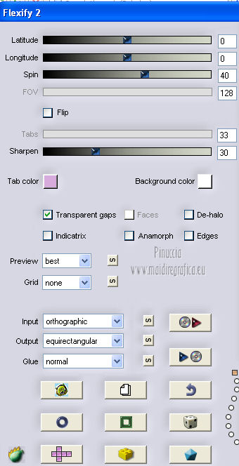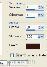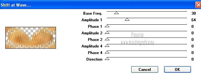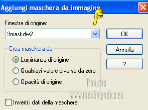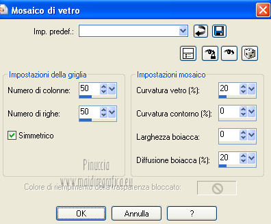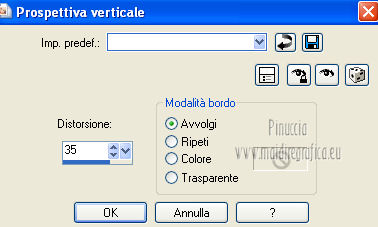 qui puoi trovare qualche risposta ai tuoi dubbi. Se l'argomento che ti interessa non è presente, ti prego di segnalarmelo. Per tradurre questo tutorial ho usato PSP X. Questo tutorial è una creazione di ©Titoune e non può essere copiato su altri siti nè essere offerto per il download. Lo stesso vale per la mia traduzione. Questo tutorial è stato creato con PSP X5. Secondo la versione utilizzata (anteriore a PSP X, si possono ottenere risultati differenti. Per tradurre questo tutorial ho usato PSP X. Grazie ai creatori dei tubes che mettono a disposizione il loro lavoro in vari gruppi di condivisione. Rispetta il lavoro degli autori, non cambiare il nome del file e non cancellare il watermark. Occorrente: Un tube a scelta. Il resto del materiale qui Il tube del paesaggio è di LuzCristina Il tube della donna è di Gina Filtri: Simple - Left Right Wrap (bonus) qui Mura's Seamless - Shift at Wave qui Flaming Pear - Flexify 2 qui i filtri Simple e Mura's Seamless si possono usare da soli o importati in Filters Unlimited. ![]() Apri la maschera "9maskdw2" in PSP e minimizzala con il resto del materiale. 1. Apri una nuova immagine trasparente 1280 x 550 pixels. Selezione>Seleziona tutto. 2. Apri la trama tuile_depart e vai a Modifica>Copia. Torna al tuo lavoro e vai a Modifica>Incolla nella selezione. Selezione>Deseleziona. SE vuoi puoi colorizzare la trama in funzione degli elementi utilizzati 3. Effetti>Effetti di trama>Mosaico di vetro. ![]() Livelli>Duplica. 4. Immagine>Ridimensiona, all'85%, tutti i livelli non selezionato. 5. Effetti>Effetti di distorsione>Coordinate polari. ![]() Effetti>Effetti di bordo>Aumenta. 6. Livelli>Duplica. Chiudi questo livello e attiva il livello sottostante dell'originale. 7. Effetti>Plugins>Mura's Seamless - Shift at Wave. ![]() 8. Effetti>Plugins>Flaming Pear - Flexify 2. ![]() Effetti>Plugins>Simple - Left Right Wrap. 9. Effetti>Effetti di distorsione>Coordinate polari, con i settaggi precedenti. Livelli>Duplica. Immagine>Capovolgi. se stai usando PSP X5: Immagine>Capovolgi in verticale. Oggetti>Allinea>In basso. Su Rifletti/Capovolgi in X5 vedi la scheda qui Livelli>Unisci>Unisci giù. 10. Effetti>Effetti 3D>Sfalsa ombra, con il colore #381611. ![]() Ripeti l'Effetto Sfalsa ombra, cambiando verticale e orizzontale con -3. Apri e attiva il livello superiore della copia. 11. Effetti>Effetti geometrici>Prospettiva verticale - 2 volte con i seguenti settaggi. ![]() Effetti>Effetti 3D>Sfalsa ombra, con i settaggi precedenti. 12. Apri il tube del paesaggio e vai a Modifica>Copia. Torna al tuo lavoro e vai a Modifica>Incolla come nuovo livello. Spostalo in alto.Livelli>Disponi>Sposta giù. Livelli>Unisci>Unisci visibile. 13. Selezione>Seleziona tutto. Selezione>Modifica>Contrai - 15 pixels. Selezione>Modifica>Sfuma - 20 pixels. Selezione>Inverti. Premi sulla tastiera il tasto CANC. 14. Selezione>Seleziona tutto. Immagine>Ritaglia la selezione. Immagine>Dimensioni tela - 1280 x 1500 pixels. ![]() 15. Livelli>Nuovo livello raster. Livelli>Disponi>Sposta giù. Selezione>Deseleziona. 16. Attiva nuovamente la trama "tuile_depart" e vai a Modifica>Copia. Torna al tuo lavoro e vai a Modifica>Incolla nella selezione. Selezione>Deseleziona. 17. Apri una nuova immagine trasparente 1280 x 350 pixels. Selezione>Seleziona tutto. Modifica>Incolla nella selezione (la trama "tuile_depart" è ancora in memoria). Selezione>Deseleziona. 18. Effetti>Effetti di trama>Mosaico di vetro, con i settaggi precedenti. 19. Livelli>Nuovo livello maschera>Da immagine. Apri il menu sotto la finestra di origine e vedrai la lista dei files aperti. Seleziona la maschera 9maskdw2, con i seguenti settaggi: ![]() Livelli>Unisci>Unisci gruppo. Modifica>Copia. Torna al tuo top e vai a Modifica>Incolla come nuovo livello. 20. Effetti>Effetti di riflesso>Specchio rotante. ![]() 21. Effetti>Effetti di immagine>Scostamento. ![]() 22. Effetti>Effetti 3D>Sfalsa ombra, con il colore #381611. ![]() Ripeti l'Effetto Sfalsa ombra, cambiando verticale e orizzontale con -3. 23. Apri il tuo tube e vai a Modifica>Copia. Torna al tuo lavoro e vai a Modifica>Incolla come nuovo livello. Immagine>Ridimensiona, se e quanto necessario, tutti i livelli non selezionato. Posiziona il tube come preferisci, o vedi il mio esempio.Effetti>Effetti 3D>Sfalsa ombra, con i settaggi precedenti. 24. Apri il tube wordart_evasion e vai a Modifica>Copia. Torna al tuo lavoro e vai a Modifica>Incolla come nuovo livello. Posiziona il testo dove preferisci, o vedi il mio esempio.Effetti>Effetti 3D>Sfalsa ombra, con i settaggi precedenti. 25. Firma il tuo lavoro. Livelli>Unisci>Unisci tutto e salva in formato jpg. ![]() Se hai problemi o dubbi, o trovi un link non funzionante, scrivimi.br> 23 Febbraio 2013 |