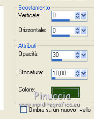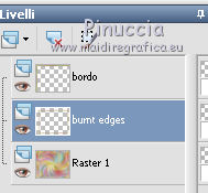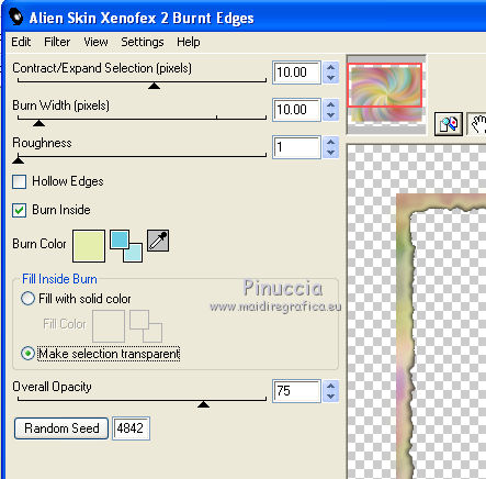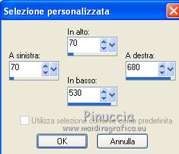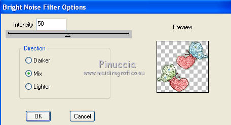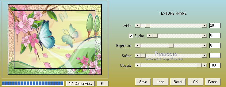 qui puoi trovare qualche risposta ai tuoi dubbi. Se l'argomento che ti interessa non è presente, ti prego di segnalarmelo. Per tradurre questo tutorial ho usato PSP X. Questo tutorial è una creazione di ©Titoune e non può essere copiato su altri siti nè essere offerto per il download. Lo stesso vale per la mia traduzione. Grazie ai creatori dei tubes che mettono a disposizione il loro lavoro in vari gruppi di condivisione. Rispetta il lavoro degli autori, non cambiare il nome del file e non cancellare il watermark. Occorrente: Materiale qui Filtri: consulta, se necessario, la mia sezione filtri qui Eye Candy 4000 - Fur qui Alien Skin Xenofex 2.0 - Burnt Edges qui Simple - Diamonds qui DSB Flux - Bright Noise qui AAA Frames - Texture Frame qui Animation Shop qui ![]() Metti le selezioni nella cartella Selezioni. 1. Apri l'immagine "titoune_fond_tag_Explosion_florale". Duplicala usando la combinazione di tasti maiuscola+D e chiudi l'originale. La copia sarà la base del tuo lavoro. 2. Selezione>Seleziona tutto. Selezione>Modifica>Contrai - 25 pixels. Selezione>Inverti. Selezione>Innalza selezione a livello. 3. Effetti>Plugins>Eye Candy 4000 - Fur - colore #e6eeae. per una strana anomalia di questo filtro, a volte non si riesce a digitare la lettera "a". In questo caso, l'espediente migliore è quello di impostare il colore di primo piano con questo colore, impostando i settaggi del filtro, basterà cliccare sulla palettina del colore corrispondente ![]() 4. Effetti>Effetti 3D>Smusso a incasso. ![]() Selezione>Inverti. Premi sulla tastiera il tasto CANC. Rinomina questo livello "bordo". 5. Selezione>Modifica>Contrai - 20 pixels. Attiva il livello inferiore. Selezione>Innalza selezione a livello. Selezione>Deseleziona. 6. Effetti>Plugins>Alien Skin Xenofex 2.0 - Burnt Edges - colore #edeeac. Seleziona "Burn Inside". ![]() Rinomina questo livello "burnt edges". 7. Attiva lo strumento Bacchetta magica , tolleranza 10,e clicca al centro della cornice per selezionarla. ![]() Selezione>Inverti. 8. Attiva il livello inferiore. Regola>Sfocatura>Sfocatura gaussiana - raggio 25. ![]() 9. Effetti>Plugins>Simple - Diamond - 2 volte. Selezione>Deseleziona. 10. Attiva il livello soprastante. ![]() Effetti>Effetti 3D>Sfalsa ombra, con il colore #214f0f. ![]() Ripeti l'Effetto Sfalsa ombra, cambiando verticale e orizzontale con -3. 11. Attiva lo strumento Selezione ,clicca sull'icona Selezione personalizzata ![]() e imposta i seguenti settaggi: ![]() 12. Livelli>Nuovo livello raster. Livelli>Disponi>Sposta giù. 13. Apri l'immagine 1302-south-korea-vector-landscape-material-b-flower-and-buttefly-1. Modifica>Copia. Torna al tuo lavoro e vai a Modifica>Incolla nella selezione. 14. Effetti>Plugins>AAA Frames - Texture Frame. ![]() 15. Selezione>Modifica>Contrai - 20 pixels. Selezione>Inverti. 16. Effetti>Effetti 3D>Smusso a incasso, con i settaggi precedenti. Selezione>Inverti. Selezione>Innalza selezione a livello. Cambia la modalità di miscelatura di questo livello in Luce diffusa. Selezione>Deseleziona. 17. Attiva il livello sottostante. Effetti>Effetti 3D>Sfalsa ombra, con i settaggi precedenti. 18. Attiva il livello superiore. Apri il tube titoune_coins_estival e vai a Modifica>Copia. Torna al tuo lavoro e vai a Modifica>Incolla come nuovo livello. 19. Effetti>Effetti 3D>Sfalsa ombra, con il colore #214f0f. ![]() Ripeti l'Effetto Sfalsa ombra, cambiando verticale e orizzontale con -2. 20. Apri il tube GL_Butterfly_1_1 (le farfalle con i cuori), e vai a Modifica>Copia. Torna al tuo lavoro e vai a Modifica>Incolla come nuovo livello. 21. Effetti>Effetti di immagine>Scostamento. ![]() 22. Effetti>Effetti 3D>Sfalsa ombra, con i settaggi precedenti. Rinomina questo livello "animazione 1". 23. Apri il tube GL_Butterfly_1 (la ghirlanda), e vai a Modifica>Copia. Torna al tuo lavoro e vai a Modifica>Incolla come nuovo livello. 24. Effetti>Effetti di immagine>Scostamento. ![]() 25. Effetti>Effetti 3D>Sfalsa ombra, con i settaggi precedenti. Rinomina questo livello "animazione 2". 26. Apri il tube JCW_TINK e vai a Modifica>Copia. Torna al tuo lavoro e vai a Modifica>Incolla come nuovo livello. Immagine>Rifletti. 27. Immagine>Ridimensiona, al 75%, tutti i livelli non selezionato. Regola>Messa a fuoco>Metti a fuoco. 28. Effetti>Effetti 3D>Sfalsa ombra, con il colore #214f0f. ![]() Firma il tuo lavoro. 29. Animazione. Attiva il livello "animazione 1". Livelli>Duplica - 3 volte, e rimani posizionato sul livello della terza copia. 30. Selezione>Carica/Salva selezione>Carica selezione da disco. Cerca e carica la selezione "selection_papillons1". ![]() 31. Effetti>Pugins>DSB Flux - Bright Noise. ![]() 32. Mantieni selezionato. Chiudi questo livello e attiva il livello della seconda copia. Effetti>Plugins>DSB Flux - Bright Noise, clicca sul puntino di Mix per cambiare l'aspetto del disturbo e ok. Chiudi questo livello e attiva il livello della prima copia. 33. Effetti>Plugins>DSB Flux - Bright Noise, clicca sul puntino di Mix per cambiare l'aspetto del disturbo e ok. Chiudi questo livello e attiva il livello originale "animazione1". Effetti>Plugins>DSB Flux - Bright Noise, clicca sul puntino di Mix per cambiare l'aspetto del disturbo e ok. Lascia il livello visibile. Selezione>Deseleziona. 34. Attiva il livello "animazione 2". Livelli>Duplica - 3 volte e rimani posizionato sul livello della terza copia. Selezione>Carica/Salva selezione>Carica selezione da disco. Cerca e carica la selezione "selection_papillons2. ![]() Effetti>Plugins>DSB Flux - Bright Noise. ![]() Chiudi questo livello e attiva il livello della seconda copia. Effetti>Plugins>DSB Flux - Bright Noise, clicca sul puntino di Mix per cambiare l'aspetto del disturbo e ok. Chiudi questo livello e attiva il livello della prima copia. 33. Effetti>Plugins>DSB Flux - Bright Noise, clicca sul puntino di Mix per cambiare l'aspetto del disturbo e ok. Chiudi questo livello e attiva il livello originale "animazione1". Effetti>Plugins>DSB Flux - Bright Noise, clicca 