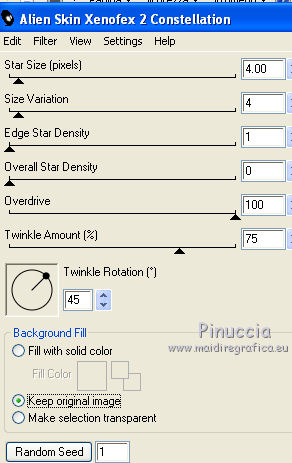 Effetti>Plugins>Alien Skin Xenofex 2.0 - Constellation, con i settaggi precedenti, ma clicca una volta su Random Seed.