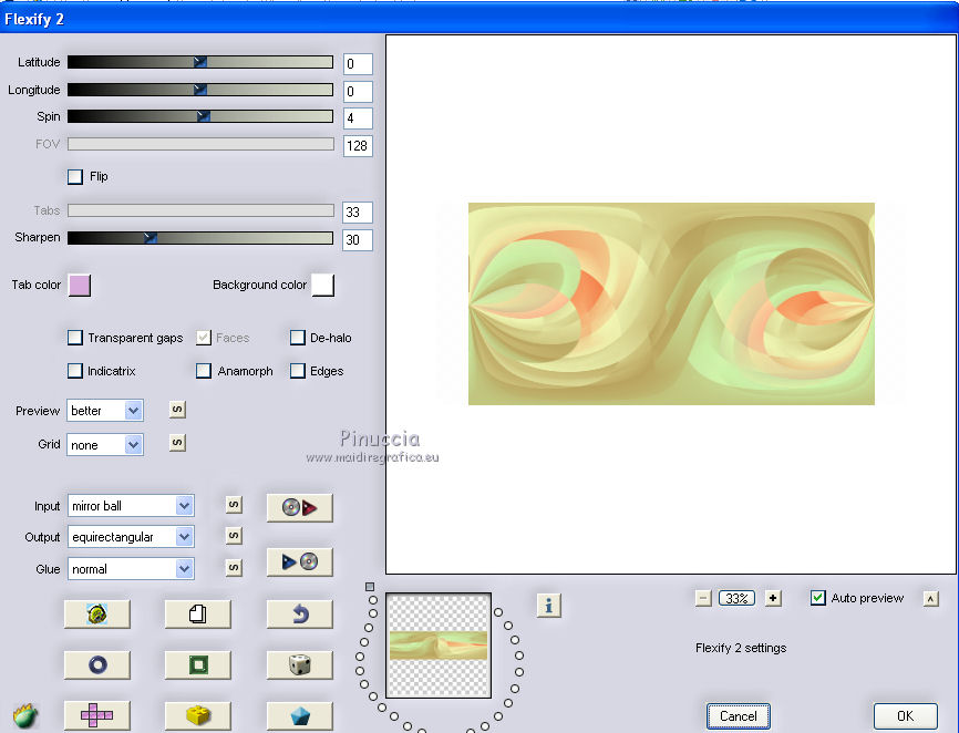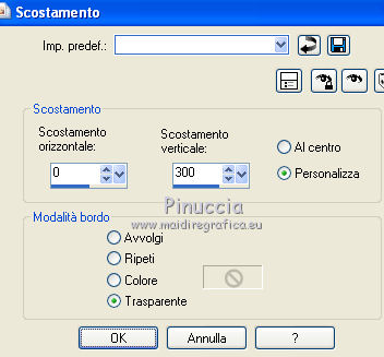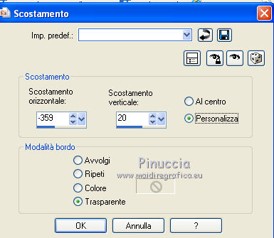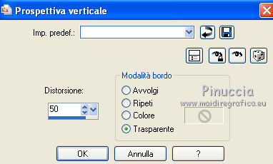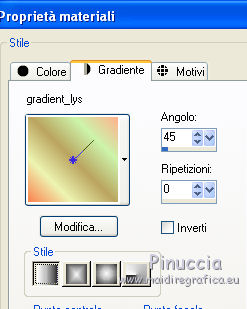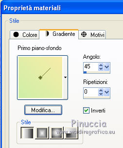 qui puoi trovare qualche risposta ai tuoi dubbi. Se l'argomento che ti interessa non è presente, ti prego di segnalarmelo. Per tradurre questo tutorial ho usato PSP X. Questo tutorial è una creazione di ©Titoune e non può essere copiato su altri siti nè essere offerto per il download. Lo stesso vale per la mia traduzione. Il materiale viene da vari gruppi di condivisione. Il copyright appartiene ai rispettivi autori. Grazie ai creatori dei tubes che mettono a disposizione il loro lavoro in vari gruppi di condivisione. Occorrente: Materiale qui Il tube utilizzato è di Thafs. Rispetta il lavoro degli autori, non cambiare il nome del file e non cancellare il watermark. Filtri: consulta, se necessario, la mia sezione filtri qui Mehdi - Sorting Tiles qui Simple qui Penta.com - Color dot qui Flaming Pear - Flexify 2 qui ![]() Metti il gradiente nella cartella Gradienti. Apri la maschera "Tori Mask 3" in PSP e minimizzala con il resto del materiale. 1. Imposta il colore di primo piano con #f7eca8, e il colore di sfondo con #ceeea6. Passa il colore di primo piano a Gradiente, e seleziona il gradiente Gradient_lys, con i seguenti settaggi. ![]() Apri una nuova immagine trasparente 1280 x 550 pixels, e riempila con il gradiente.2. Effetti>Plugins>Mehdi - Sorting Tiles. ![]() 3. Effetti>Plugins>Simple - Diamonds. 4. Effetti>Plugins>Flaming Pear - Flexify 2. ![]() 5. Effetti>Effetti geometrici>Prospettiva verticale. ![]() 6. Effetti>Effetti geometrici>Inclina. ![]() 7. Effetti>Effetti di immagine>Scostamento. ![]() 8. Effetti>Effetti geometrici>Cilindro verticale. ![]() 9. Effetti>Effetti geometrici>Sfera. ![]() 10. Di nuovo Effetti>Effetti geometrici>Prospettiva verticale, con i settaggi precedenti. 11. Effetti>Effetti di distorsione>Coordinate polari. ![]() 12. Livelli>Nuovo livello raster. Livelli>Disponi>Sposta giù. Riempi con il gradiente.13. Regola>Sfocatura>Sfocatura radiale. ![]() Chiudi questo livello, e attiva il livello soprastante. 14. Clicca nella parte trasparente con la bacchetta magica per selezionarla.![]() 15. Apri e attiva il livello sottostante. 16. Livelli>Nuovo livello raster. Apri l'immagine Flornambg_44 e vai a Modifica>Copia. Torna al tuo lavoro e vai a Modifica>Incolla nella selezione. Selezione>Deseleziona. Cambia la modalità di miscelatura di questo livello in Luminanza (esistente). 17. Attiva il livello superiore. Effetti>Effetti 3D>Sfalsa ombra, con il colore #6d5e35. ![]() Ripeti l'Effetto Sfalsa ombra, cambiando verticale e orizzontale con -3. 18. Attiva lo strumento Selezione ,clicca sull'icona Selezione personalizzata ![]() e imposta i seguenti settaggi: ![]() Selezione>Innalza selezione a livello. Selezione>Deseleziona. 19. Effetti>Plugins>Penta.com - Color dot, con i settaggi standard. ![]() Rinomina questo livello "bordo". 20. Apri il tube n_ogf80611. Elimina la firma. Modifica>Copia. Torna al tuo lavoro e vai a Modifica>Incolla come nuovo livello. 21. Immagine>Ridimensiona, al 50%, tutti i livelli non selezionato. 22. Effetti>Effetti di immagine>Scostamento. ![]() 23. Livelli>Duplica. Immagine>Rifletti. Immagine>Capovolgi. Livelli>Unisci>Unisci giù. 24. Effetti>Effetti 3D>Sfalsa ombra, con i settaggi precedenti. 25. Attiva il livello inferiore. Selezione>Seleziona tutto. Immagine>Ritaglia la selezione. 26. Immagine>Dimensioni tela - 1280 x 1500 pixels. ![]() 27. Livelli>Nuovo livello raster. Livelli>Disponi>Porta sotto. 28. Con i colori iniziali, passa il colore di primo piano a Gradiente di primo piano/sfondo, con i seguenti settaggi. ![]() Riempi il livello con il gradiente.29. Apri una nuova immagine trasparente 1280 x 350 pixels. Imposta nuovamente il gradiente di partenza Gradient_lys. ![]() Riempi l'immagine trasparente con il gradiente.30. Effetti>Effetti di trama>Plastica morbida. ![]() 31. Livelli>Nuovo livello maschera>Da immagine. Apri il menu sotto la finestra di origine e vedrai la lista dei files aperti. Tra questi la maschera. Seleziona la maschera Tori Mask 39, con i seguenti settaggi: ![]() Livelli>Unisci>Unisci gruppo. 32. Modifica>Copia. Attiva il tuo top e vai a Modifica>Incolla come nuovo livello. 33. Effetti>Effetti di immagine>Scostamento. ![]() 34. Selezione>Seleziona tutto. Selezione>Mobile. Selezione>Immobilizza. 35. Selezione>Modifica>Contrai - 10 pixels. Selezione>Inverti. 36. Effetti>Effetti 3D>Sfalsa ombra, con i settaggi precedenti. Selezione>Deseleziona. 37. Effetti>Effetti 3D>Sfalsa ombra, con i settaggi precedenti. 38. Attiva il livello "bordo". Effetti>Effetti 3D>Sfalsa ombra, con i settaggi precedenti. Livelli>Disponi>Porta in alto. 39. Apri il tube femme_penseuse_tubed_by_thafs e vai a Modifica>Copia. Torna al tuo lavoro e vai a Modifica>Incolla come nuovo livello. 40. Immagine>Ridimensiona, all'80%, tutti i livelli non selezionato. Sposta il tube al centro del top.Livelli>Disponi>Sposta giù. 41. Effetti>Effetti 3D>Sfalsa ombra, con i settaggi precedenti. Firma il tuo lavoro. 42. Livelli>Unisci>Unisci tutto e salva in formato jpg. ![]() ![]() Se hai problemi o dubbi, o trovi un link non funzionante, o anche soltanto per un saluto, scrivimi. 18 Agosto 2011 |