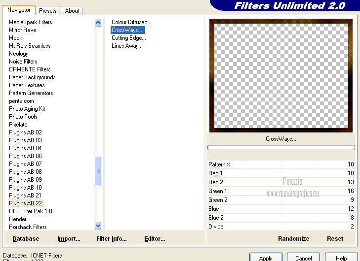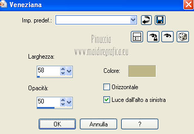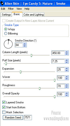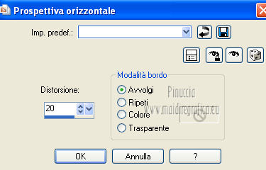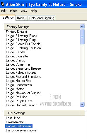 qui puoi trovare qualche risposta ai tuoi dubbi. Se l'argomento che ti interessa non è presente, ti prego di segnalarmelo. Per tradurre questo tutorial ho usato PSP X. Questo tutorial è una creazione di ©Titoune e non può essere copiato su altri siti nè essere offerto per il download. Lo stesso vale per la mia traduzione. Grazie ai creatori dei tubes che mettono a disposizione il loro lavoro in vari gruppi di condivisione. Rispetta il lavoro degli autori, non cambiare il nome del file e non cancellare il watermark. Occorrente: Un tube a scelta. Il resto del materiale qui Gli elementi scrap sono una creazione href="http://kittzkreationz.blogspot.ch/ Kittz Creationz Filtri: Filters Unlimited 2.0 qui Plugins AB 22 - Cross Ways qui Alien Skin Eye Candy 5 Nature - Smoke qui Animation Shop qui ![]() Metti il preset fog_halloween nella cartella del filtro Alien Skin Eye Candy 5 Nature>Settings>Smoke. Cliccando sul file una o due volte (a seconda delle tue impostazioni) il preset automaticamente si installerà nella cartella corretta. La trama Corel_15_046 è standard nella versioni più recenti di PSP, e corrisponde alla trama standard delle precedenti versioni Pelle di serpente. Se non la trovi nel tuo PSP, metti quella fornita nella cartella Trame. 1. Apri l'immagine "image_depart". Duplicala usando la combinazione di tasti maiuscola+D e chiudi l'originale. La copia sarà la base del tuo lavoro. Selezione>Seleziona tutto. Selezione>Modifica>Contrai - 25 pixels. Selezione>Inverti. Selezione>Innalza selezione a livello. 2. Effetti>Plugins>Filters Unlimited 2.0 - PluginsAB 22 - CrossWays, con i settaggi standard. ![]() Ripeti l'Effetto una seconda volta. 3. Effetti>Effetti 3D>Smusso a incasso. ![]() Selezione>Deseleziona. 4. Effetti>Effetti 3D>Sfalsa ombra, con il colore #290402. ![]() Ripeti l'Effetto Sfalsa ombra, cambiando verticale e orizzontale con -5. 5. Attiva il livello Raster 1. Effetti>Effetti di trama>Trama - seleziona la trama Pelle di serpente o Corel_15_046. ![]() 6. Apri l'elemento H-18 e vai a Modifica>Copia. Torna al tuo lavoro e vai a Modifica>Incolla come nuovo livello. Sposta la cornice leggermente più in alto,vedi l'esempio finale. 7. Attiva lo strumento Bacchetta magica ![]() e clicca al centro della cornice per selezionarla. Selezione>Modifica>Espandi - 5 pixels. 8. Livelli>Nuovo livello raster. Livelli>Disponi>Sposta giù. Apri l'immagine 6f9431e4 e vai a Modifica>Copia. Torna al tuo lavoro e vai a Modifica>Incolla nella selezione. Selezione>Inverti. 9. Livelli>Nuovo livello raster. Livelli>Disponi>Sposta giù. Di nuovo Modifica>Incolla nella selezione (l'immagine è ancora in memoria). Selezione>Deseleziona. 10. Regola>Sfocatura>Sfocatura gaussiana - raggio 25. ![]() 11. Effetti>Effetti di trama>Veneziana - colore #beb687. ![]() 12. Effetti>Effetti di distorsione>Coordinate polari. ![]() 13. Effetti>Effetti geometrici>Prospettiva verticale. ![]() Modifica>Ripeti Prospettiva verticale. 14. Effetti>Effetti geometrici>Prospettiva orizzontale. ![]() Cambia la modalità di miscelatura di questo livello in Luminanza (esistente), e abbassa l'opacità al 60%. Rinomina questo livello "motivo". 15. Attiva il livello superiore. Apri l'elemento H-33 e vai a Modifica>Copia. Torna al tuo lavoro e vai a Modifica>Incolla come nuovo livello. Spostalo sopra la cornice.Effetti>Effetti 3D>Sfalsa ombra, colore #290402. ![]() Ripeti l'Effetto Sfalsa ombra, cambiando verticale e orizzontale con -3. 16. Apri l'elemento H-39 e vai a Modifica>Copia. Torna al tuo lavoro e vai a Modifica>Incolla come nuovo livello. Spostalo in basso.17. Effetti>Effetti di riflesso>Specchio rotante. ![]() Nella paletta di livelli porta questo livello sotto il livello della cornice. 18. Attiva nuovamente il livello superiore. Apri l'elemento H-6 e vai a Modifica>Copia. Torna al tuo lavoro e vai a Modifica>Incolla come nuovo livello. Spostalo a sinistra.![]() Effetti>Effetti di riflesso>Specchio rotante, con i settaggi precedenti. Effetti>Effetti 3D>Sfalsa ombra, con i settaggi precedenti. 19. Apri l'elemento H-4 e vai a Modifica>Copia. Torna al tuo lavoro e vai a Modifica>Incolla come nuovo livello. Sposta l'elemento in alto a sinistra.Vedi l'esempio finale. Effetti>Effetti 3D>Sfalsa ombra, con i settaggi precedenti. 20. Apri l'elemento H-54 e vai a Modifica>Copia. Torna al tuo lavoro e vai a Modifica>Incolla come nuovo livello. Spostalo in alto a destra.![]() Effetti>Effetti 3D>Sfalsa ombra, con i settaggi precedenti. 21. Apri l'elemento H-14 e vai a Modifica>Copia. Torna al tuo lavoro e vai a Modifica>Incolla come nuovo livello. Spostalo nell'angolo in alto a sinistra.Vedi l'esempio finale. Effetti>Effetti di riflesso>Specchio rotante, con i settaggi precedenti. Effetti>Effetti 3D>Sfalsa ombra, con i settaggi precedenti. 22. Apri l'elemento H-4a e vai a Modifica>Copia. Torna al tuo lavoro e vai a Modifica>Incolla come nuovo livello. Spostalo in basso a sinistra.Vedi l'esempio finale. Effetti>Effetti 3D>Sfalsa ombra, con i settaggi precedenti. 23. Apri l'elemento W51 e vai a Modifica>Copia. Torna al tuo lavoro e vai a Modifica>Incolla come nuovo livello. Sposta anche questo elemento in basso a sinistra.![]() Effetti>Effetti 3D>Sfalsa ombra, con i settaggi precedenti. 24. Apri l'elemento H-28 e vai a Modifica>Copia. Torna al tuo lavoro e vai a Modifica>Incolla come nuovo livello. Spostalo in basso a destra.Vedi l'esempio finale. Effetti>Effetti 3D>Sfalsa ombra, con i settaggi precedenti. 25. Apri l'elemento H-3 e vai a Modifica>Copia. Torna al tuo lavoro e vai a Modifica>Incolla come nuovo livello. Spostalo in basso.![]() Effetti>Effetti 3D>Sfalsa ombra, con i settaggi precedenti. 26. Apri l'elemento H-11 e vai a Modifica>Copia. Torna al tuo lavoro e vai a Modifica>Incolla come nuovo livello. Spostalo dove preferisci o vedi il mio esempio.Effetti>Effetti 3D>Sfalsa ombra, con i settaggi precedenti. 27. Apri il tuo tube e vai a Modifica>Copia. Torna al tuo lavoro e vai a Modifica>Incolla come nuovo livello. Spost