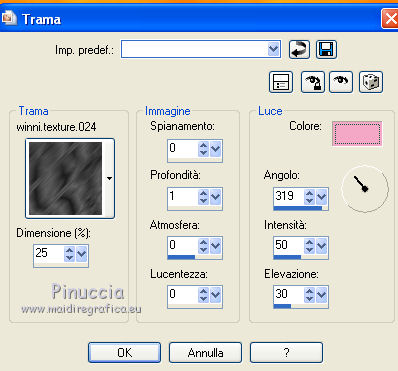 3. Effetti>Effetti di trama>Trama - seleziona la trama winni.texture.024, con i seguenti settaggi.