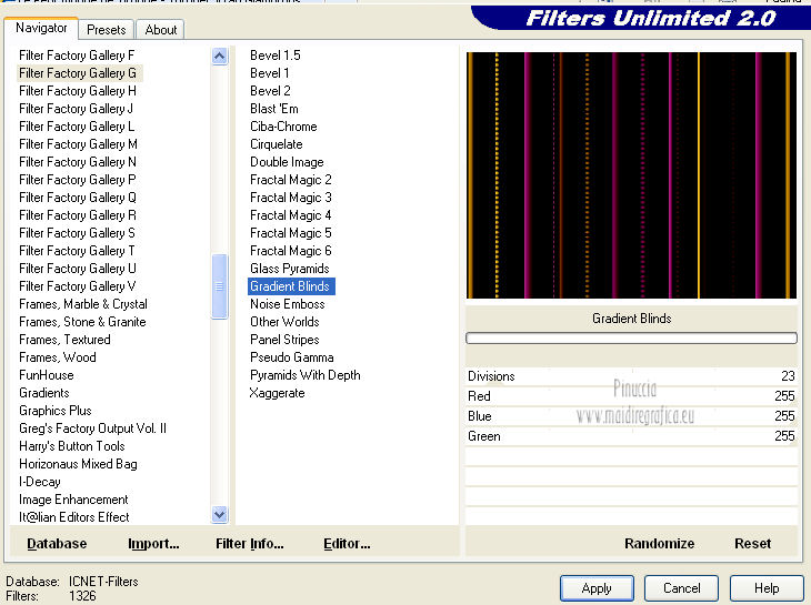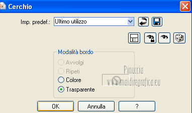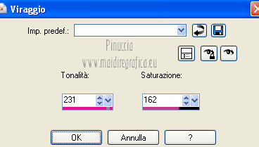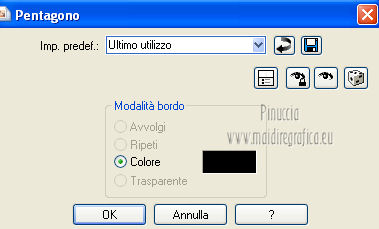 qui puoi trovare qualche risposta ai tuoi dubbi. Se l'argomento che ti interessa non è presente, ti prego di segnalarmelo. Per tradurre questo tutorial ho usato PSP X. Questo tutorial è una creazione di ©Titoune e non può essere copiato su altri siti nè essere offerto per il download. Lo stesso vale per la mia traduzione. Grazie ai creatori dei tubes che mettono a disposizione il loro lavoro in vari gruppi di condivisione. Rispetta il lavoro degli autori, non cambiare il nome del file e non cancellare il watermark. Occorrente: Materiale qui Il tube utilizzato è di Gerry. Gli elementi scrap utilizzati sono una creazione http://tashasplayground.blogspot.ch Tasha's Playground Filtri Filters Unlimited 2.0 qui Filter Factory Gallery G qui Penta.com - Jeans qui ![]() 1. Imposta il colore di primo piano con un colore scelto dal tube. Per l'esempio #b12182. 2. Apri una nuova immagine trasparente 750 x 600 pixels. Selezione>Seleziona tutto. Apri l'elemento paper1 e vai a Modifica>Copia. Torna al tuo lavoro e vai a Modifica>Incolla nella selezione. 3. Regola>Tonalità e saturazione>Viraggio. ![]() 4. Selezione>Modifica>Contrai - 75 pixels. Livelli>Nuovo livello raster. 5. Apri l'elemento paper2 e vai a Modifica>Copia. Torna al tuo lavoro e vai a Modifica>Incolla nella selezione. 6. Effetti>Plugins>Filters Unlimited 2.0 - Filter Factory Gallery G - Gradient Blinds. ![]() Mantieni selezionato. 7. Effetti>Effetti geometrici>Cerchio. ![]() 8. Effetti>Effetti geometrici>Pentagono - colore nero. ![]() Selezione>Seleziona tutto. Selezione>Mobile. 9. Attiva il livello Raster 1 e premi sulla tastiera il tasto CANC. Selezione>Inverti. 10. Selezione>Modifica>Seleziona bordature selezione. ![]() 11. Livelli>Nuovo livello raster. (Se hai fatto correttamente il livello dovrebbe trovarsi già in cima alla paletta). Riempi con il colore di primo piano #b12182.Selezione>Deseleziona. 12. Effetti>Plugins>Penta.com - Jeans, con i settaggi standard. ![]() 13. Effetti>Effetti 3D>Sfalsa ombra, con il colore nero. ![]() Ripeti l'Effetto Sfalsa ombra, cambiando verticale e orizzontale con -3. 14. Activer l'élement bows e vai a Modifica>Copia. Torna al tuo lavoro e vai a Modifica>Incolla come nuovo livello. Spostalo in alto a sinistra.15. Livelli>Duplica. Immagine>Rifletti. Immagine>Capovolgi. Posiziona correttamente il duplicato in basso a destra.![]() Livelli>Unisci>Unisci giù. Effetti>Effetti 3D>Sfalsa ombra, con i settaggi precedenti. 16. Apri l'elemento "tiara" e vai a Modifica>Copia. Torna al tuo lavoro e vai a Modifica>Incolla come nuovo livello. Regola>Tonalità e saturazione>Viraggio, con i settaggi precedenti. Sposta l'elemento in alto al centro.17. Effetti>Effetti 3D>Sfalsa ombra, con i settaggi precedenti. 18. Apri l'elemento "bow" e vai a Modifica>Copia. Torna al tuo lavoro e vai a Modifica>Incolla come nuovo livello. Spostalo in alto a destra.![]() Effetti>Effetti 3D>Sfalsa ombra, con i settaggi precedenti. 19. Apri l'elemento "lips2" e vai a Modifica>Copia. Torna al tuo lavoro e vai a Modifica>Incolla come nuovo livello. Immagine>Ruota per gradi - 15 gradi a destra. ![]() Spostalo in alto a destra.![]() Effetti>Effetti 3D>Sfalsa ombra, con i settaggi precedenti. 20. Apri l'elemento "star" e vai a Modifica>Copia. Torna al tuo lavoro e vai a Modifica>Incolla come nuovo livello. Immagine>Rifletti. Spostalo in basso a destra.Effetti>Effetti 3D>Sfalsa ombra, con i settaggi precedenti. 21. Apri l'elemento "shoe" e vai a Modifica>Copia. Torna al tuo lavoro e vai a Modifica>Incolla come nuovo livello. Spostalo dove preferisci o vedi il mio esempio.Effetti>Effetti 3D>Sfalsa ombra, con i settaggi precedenti. 22. Apri l'elemento "heart2" e vai a Modifica>Copia. Torna al tuo lavoro e vai a Modifica>Incolla come nuovo livello. Spostalo dove preferisci o vedi il mio esempio.![]() Effetti>Effetti 3D>Sfalsa ombra, con i settaggi precedenti. 23. Apri l'elemento "discoball" e vai a Modifica>Copia. Torna al tuo lavoro e vai a Modifica>Incolla come nuovo livello. Spostalo dove preferisci o vedi il mio esempio.Effetti>Effetti 3D>Sfalsa ombra, con i settaggi precedenti. 24. Apri l'elemento "wordart2" e vai a Modifica>Copia. Torna al tuo lavoro e vai a Modifica>Incolla come nuovo livello. Spostalo dove preferisci o vedi il mio esempio.25. Regola>Tonalità e saturazione>Viraggio. Effetti>Effetti 3D>Sfalsa ombra, con i settaggi precedenti. 26. Apri il tube Gerry-Vector-women10 - 20 januari 2010 e vai a Modifica>Copia. Torna al tuo lavoro e vai a Modifica>Incolla come nuovo livello. 27. Immagine>Ridimensiona, al 75%, tutti i livelli non selezionato. Regola>MEssa a fuoco>Metti a fuoco. Sposta il tube a sinistra.Effetti>Effetti 3D>Sfalsa ombra, con i settaggi precedenti. 27. Apri l'elemento "purse" e vai a Modifica>Copia. Torna al tuo lavoro e vai a Modifica>Incolla come nuovo livello. Posiziona l'elemento sul braccio della donna.Attiva lo strumento Gomma ![]() e cancella il piccolo pezzo del manico, in modo che sembri infilato nel braccio del tube. ![]() Effetti>Effetti 3D>Sfalsa ombra, con i settaggi precedenti. Firma il tuo lavoro. Livelli>Unisci>Unisci tutto e salva in formato jpg. ![]() Se hai problemi o dubbi, o trovi un link non funzionante, o anche soltanto per un saluto, scrivimi. 13 Novembre 2012 |