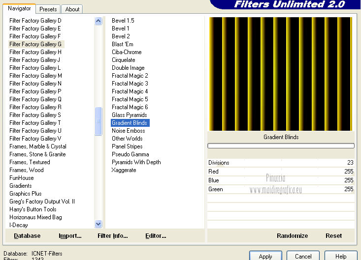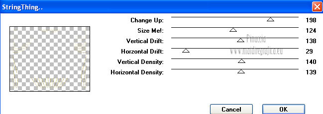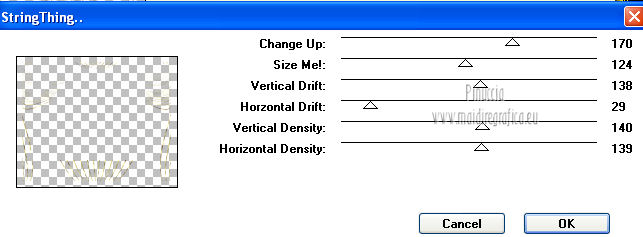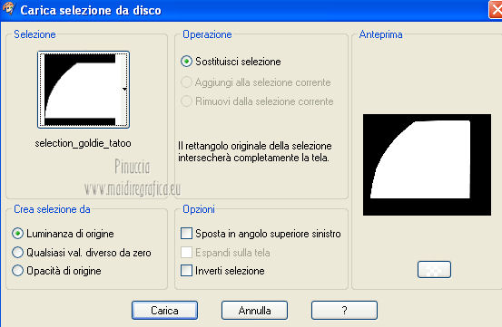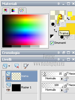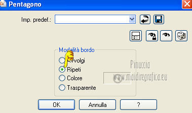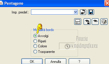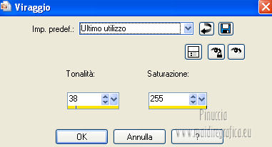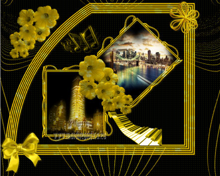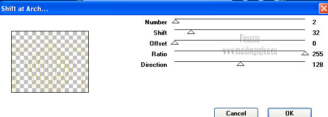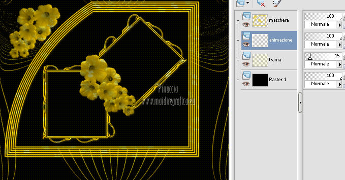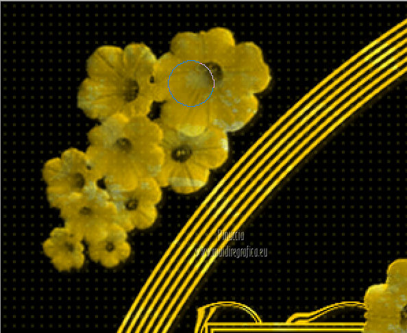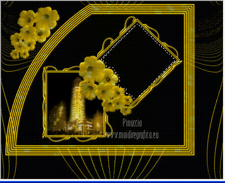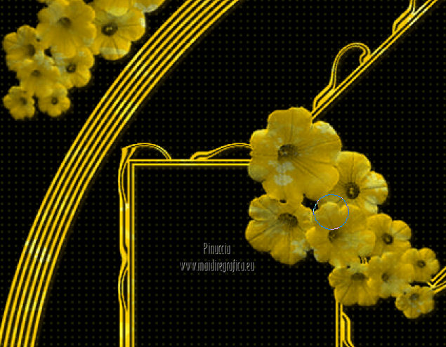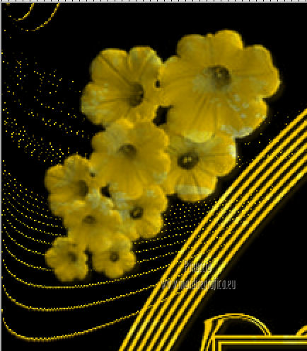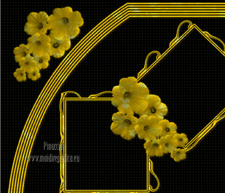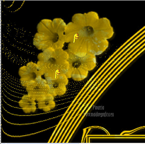 qui puoi trovare qualche risposta ai tuoi dubbi. Se l'argomento che ti interessa non è presente, ti prego di segnalarmelo. Per tradurre questo tutorial ho usato PSP X. Questo tutorial è una creazione di ©Titoune e non può essere copiato su altri siti nè essere offerto per il download. Lo stesso vale per la mia traduzione. Il tutorial è stato creato con PSP X5, ma può essere eseguito anche con le altre versioni di PSP. Per tradurlo, ho usato PSP X. Grazie ai creatori dei tubes che mettono a disposizione il loro lavoro in vari gruppi di condivisione. Rispetta il lavoro degli autori, non cambiare il nome del file e non cancellare il watermark. Occorrente: Materiale qui Il tube utilizzato è di SepiaTube. Gli elementi scrap utilizzati sono una creazione "l'ile aux trésors". Filtri: Filters Unlimited 2.0 qui Filter Factory Gallery G - Gradient Blinds qui Transparency - Eliminate Black qui Mura's Seamless - Shift at Arch qui Penta.com - Jeans qui Two Moon - StringThing qui Animation Shop qui ![]() Metti la maschera "maske-fantasy-27-bd-12-1-10" nella cartella Maschere. Metti la selezione "selection_goldie_tatoo" nella cartella Selezioni. 1. Imposta il colore di primo piano con il colore nero #000000. Apri una nuova immagine trasparente 750 x 600 pixels, e riempila con il colore nero.2. Passa il colore di primo piano con #feff39, e il colore di sfondo con #fad91e. 3. Livelli>Nuovo livello raster. Apri la paletta del colore di primo piano e seleziona la trama Griglia nelle versioni più recenti corrisponde alla trama Corel_15_006 ![]() Riempi il livello con il colore+trama.Abbassa l'opacità di questo livello al 15%. Rinomina il livello "trama". Deseleziona la trama dal colore di primo piano, cliccando sull'icona al centro della paletta. ![]() 4. Livelli>Nuovo livello raster. Selezione>Seleziona tutto. Apri l'elemento papier(5) e vai a Modifica>Copia. Torna al tuo lavoro e vai a Modifica>Incolla nella selezione. Selezione>Deseleziona. 5. Livelli>Carica/Salva maschera>Carica maschera da disco. Cerca e carica la maschera "maske-fantasy-27-bd-12-1-10". ![]() Livelli>Unisci>Unisci gruppo. 6. Immagine>Ridimensiona, all'85%, tutti i livelli non selezionato. 7. Effetti>Effetti di immagine>Scostamento. ![]() Rinomina questo livello "maschera". 8. Effetti>Effetti 3D>Sfalsa ombra, con il colore #836b0f. ![]() 9. Attiva il livello "trama". Livelli>Nuovo livello raster. Passa il colore di primo piano a Gradiente, stile Sprazzo di luce. ![]() Riempi il livello con il gradiente.10.Effetti>Plugins>Filter Unlimited 2.0 - Filter Factory Gallery G - Gradient Blinds. ![]() 11. Effetti>Plugins>Transparency - Eliminate Black. Rinomina questo livello "linee". 12. Effetti>Effetti geometrici>Cerchio. ![]() 13. Effetti>Effetti geometrici>Pentagono. ![]() 14. Effetti>Plugins>Mura's Seamless - Shift At Arch, con i settaggi standard. ![]() 15. Selezione>Carica/Salva selezione>Carica selezione da disco. Cerca e carica la selezione "selection_goldie_tatoo". ![]() Premi sulla tastiera il tasto CANC. Selezione>Deseleziona. 16. Chiudi il livello "trama". Attiva il livello "linee". 17. Attiva lo strumento Gomma , dimensione 25,e cancella le linee visibili sui fiori della maschera. Non esitare a ingrandire l'immagine per vedere meglio. ![]() Dovresti avere questo. ![]() 18. Chiudi il livello "linee". Riapri e attiva il livello "trama". Con lo strumento Gomma , con i settaggi precedenti,cancella le tracce della trama sui fiori in alto ![]() e in basso ![]() Risultato. ![]() Riapri il livello "linee" e rinomina il livello "animazione". ![]() 19. Attiva il livello "maschera". Attiva lo strumento Bacchetta magica , tolleranza 25,e clicca al centro del quadro in basso per selezionarlo. ![]() Selezione>Modifica>Espandi - 6 pixels. 20. Attiva il livello "trama". Premi sulla tastiera il tasto CANC. 21. Livelli>Nuovo livello raster. Apri il tube katussia_bLv0712 copie2 e vai a Modifica>Copia. Torna al tuo lavoro e vai a Modifica>Incolla nella selezione. Selezione>Deseleziona. 22. Attiva nuovamente il livello "maschera". Seleziona il quadro in alto con la bacchetta magica , con i settaggi precedenti![]() Selezione>Modifica>Espandi - 6 pixels. 23. Attiva il livello "trama". Premi sulla tastiera il tasto CANC. 24. Livelli>Nuovo livello raster. Apri il tube MKM JUNE 2012 CITIES AT NIGHT SERIES_T3 e vai a Modifica>Copia. Torna al tuo lavoro e vai a Modifica>Incolla nella selezione. Selezione>Deseleziona. Risultato. ![]() 25. Apri l'elemento fleurs (1) e vai a Modifica>Copia. Torna al tuo lavoro e vai a Modifica>Incolla come nuovo livello. Livelli>Disponi>Porta in alto. Sposta l'elemento in alto a destra.26. Effetti>Effetti 3D>Sfalsa ombra, con il colore #836b0f. ![]() Ripeti l'Effetto Sfalsa ombra, cambiando verticale e orizzontale con -3. 27. Apri l'elemento ribbon e vai a Modifica>Copia. Torna al tuo lavoro e vai a Modifica>Incolla come nuovo livello. Sposta l'elemento in basso a sinistra.28. Effetti>Effetti 3D>Sfalsa ombra, con i settaggi precedenti. 29. Apri l'elemento music-notes1 e vai a Modifica>Copia. Torna al tuo lavoro e vai a Modifica>Incolla come nuovo livello. 30. Regola>Tonalità e saturazione>Viraggio. ![]() Sposta l'elemento in alto a sinistra.31. Effetti>Effetti 3D>Sfalsa ombra, con i settaggi precedenti. 32. Apri l'elemento Mtm_Misc 203-9 juli 2010 e vai a Modifica>Copia. Torna al tuo lavoro e vai a Modifica>Incolla come nuovo livello. 33. Regola>Tonalità e saturazione>Viraggio, con i settaggi precedenti. Sposta l'elemento in basso a destra.![]() 34. Effetti>Effetti 3D>Sfalsa ombra, con i settaggi precedenti. 35. Livelli>Nuovo livello raster. Riempi con il gradiente.Selezione>Seleziona tutto. Selezione>Modifica>Contrai - 3 pixels. Premi sulla tastiera il tasto CANC. Selezione>Inverti. 36. Effetti>Plugins>Penta.com - Jeans, con i settaggi standard. ![]() Selezione>Deseleziona. 37. Attiva il livello Raster 1. Selezione>Seleziona tutto. Immagine>Ritaglia la selezione. 38. Immagine>Dimensioni tela - 800 x 650 pixels. ![]